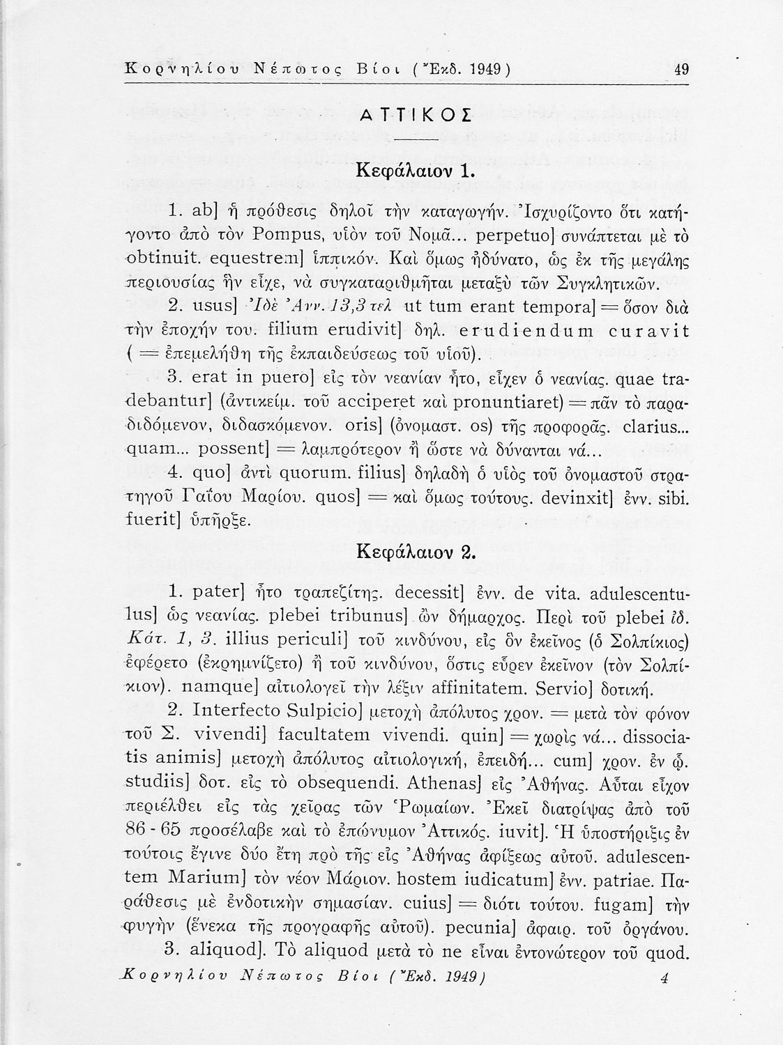 Βαθμίδα εκπαίδευσης: Δευτεροβάθμια Τάξη: Δ' Γυμνασίου παλαιού τύπου Μάθημα: Λατινικά Γλώσσα: Καθαρεύουσα Παρουσίαση περιεχομένου: Σχολικό εγχειρίδιο Λατινικών Δ΄ Γυμνασίου που περιέχει σύντομο βιογραφικό σημείωμα του Νέπωτα, αποσπάσματα από τα έργα Αμίλκας, Αννίβας, Κάτων και Αττικός, ιστορικό και γεωγραφικό πίνακα και λεξιλόγιο. Ο συγγραφέας ήταν καθηγητής της Λατινικής Φιλολογίας στο Πανεπιστήμιο Αθηνών |