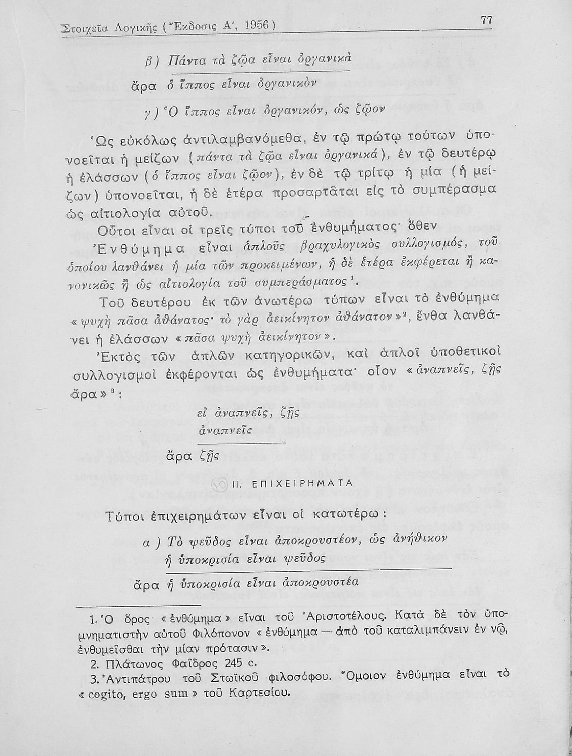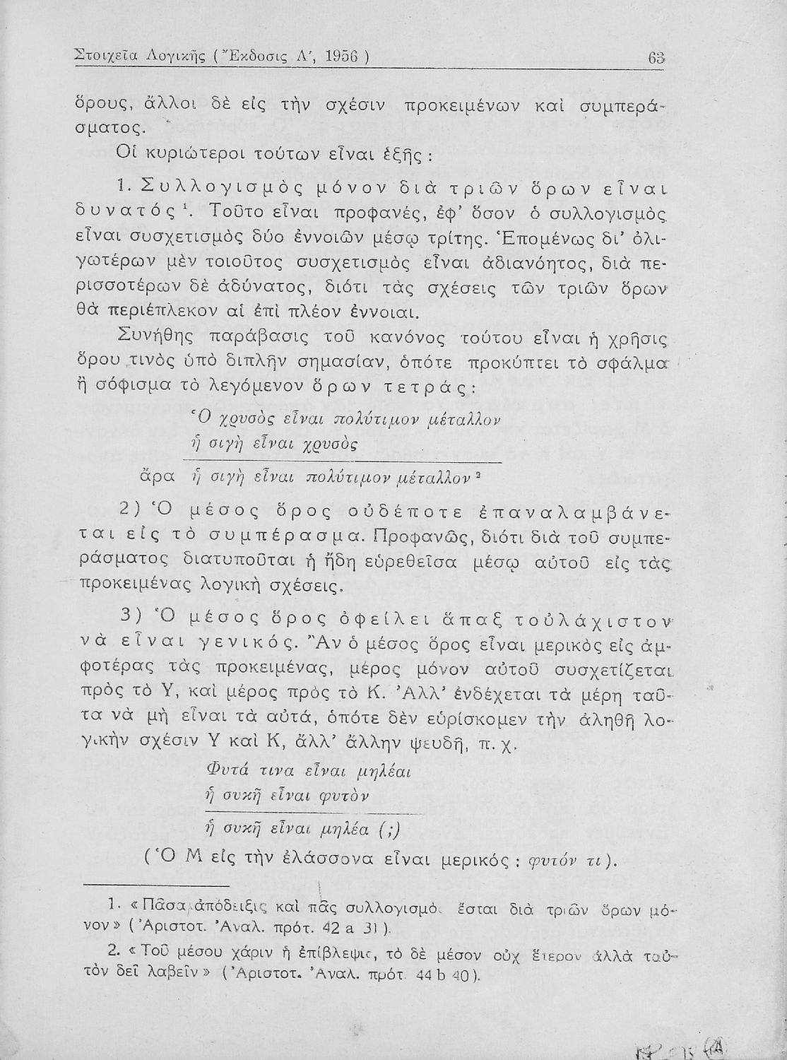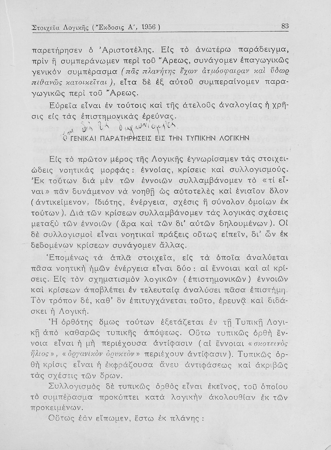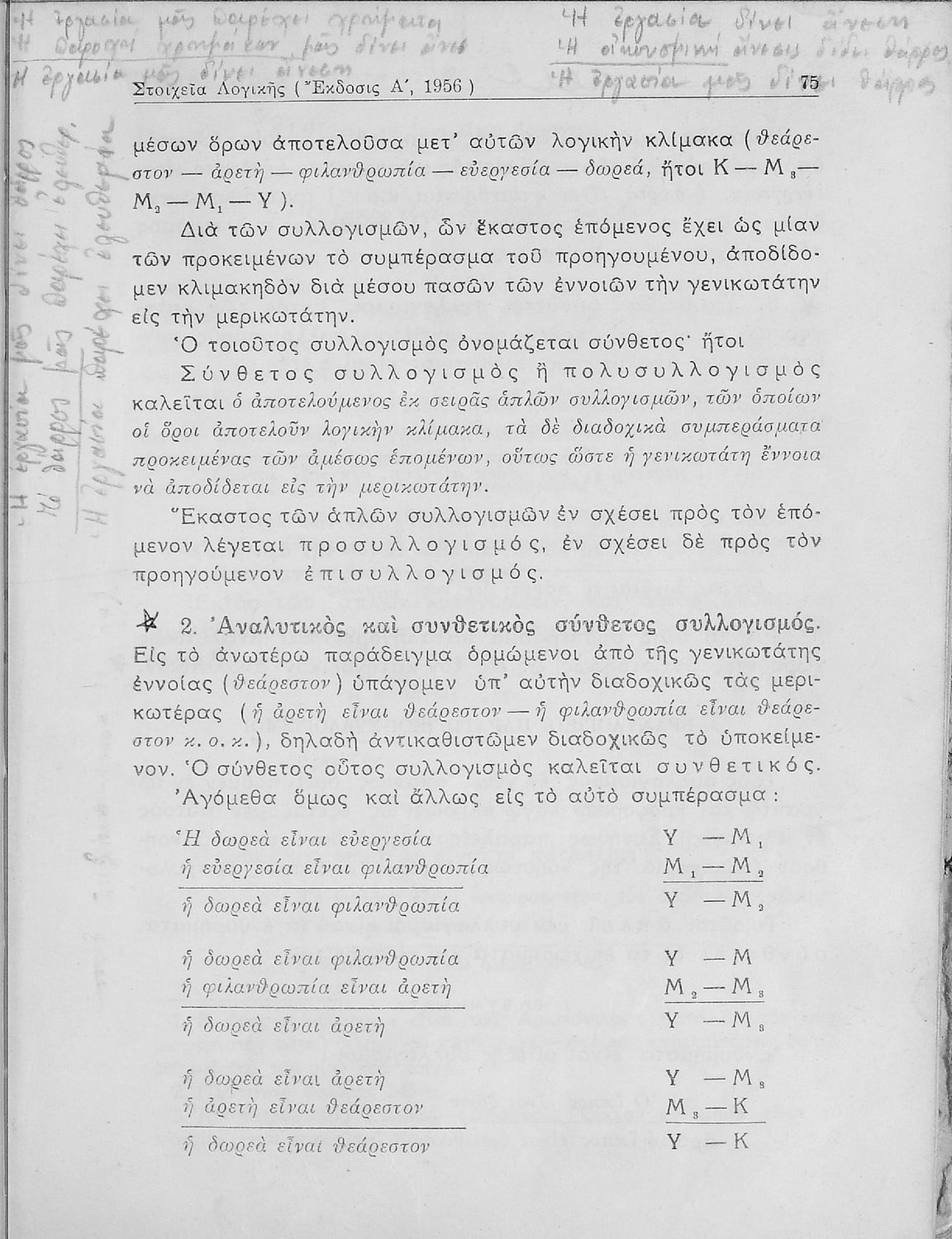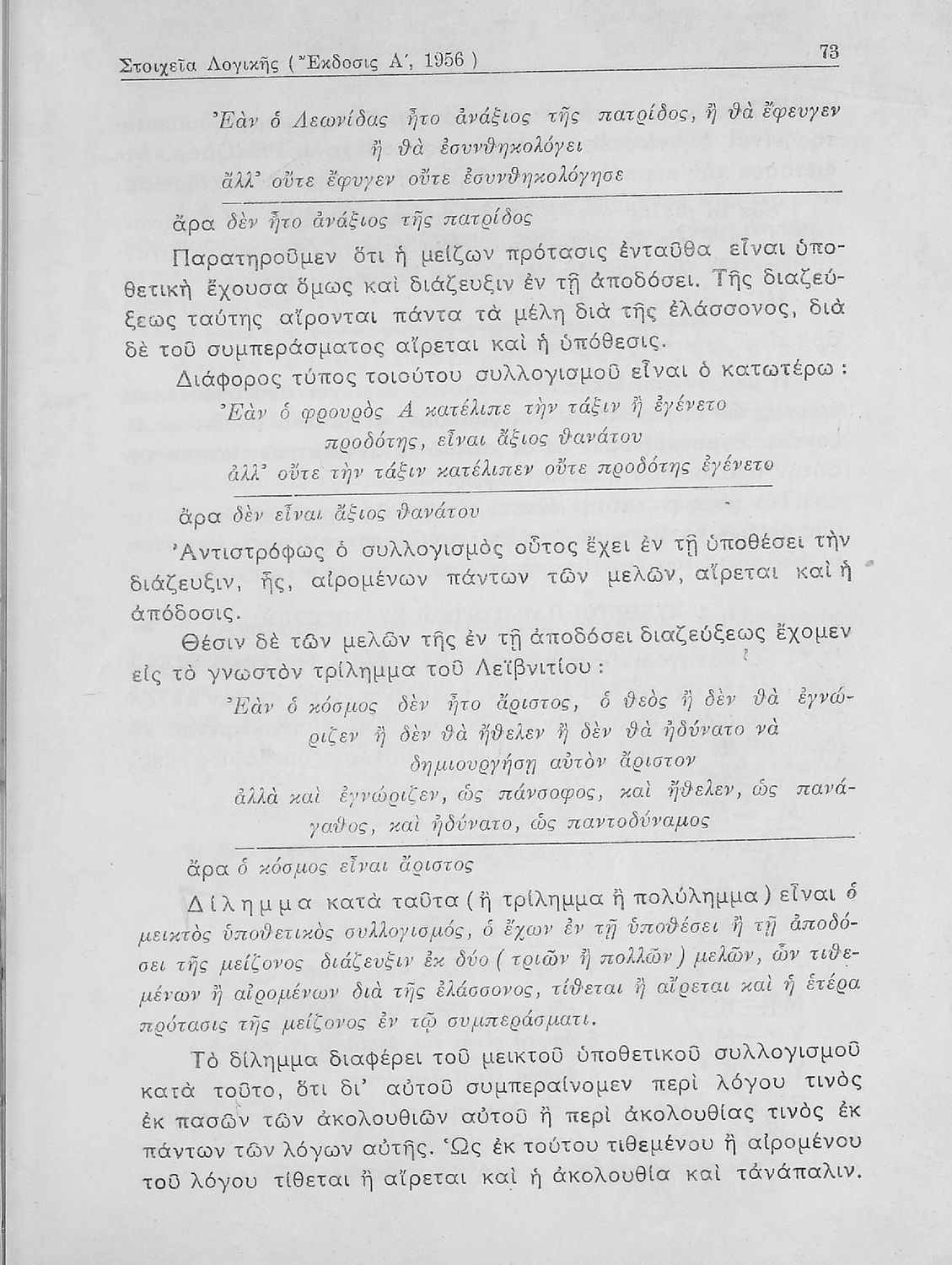 Σχολικό εγχειρίδιο Λογικής που χωρίζεται σε τρία τμήματα: την τυπική λογική, την μεθοδολογία και τη γνωσιολογία. Περιέχει ασκήσεις λογικής.