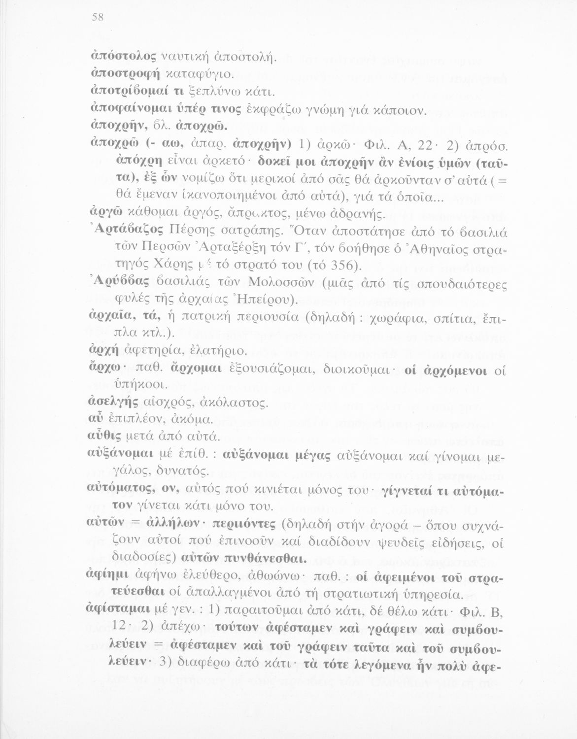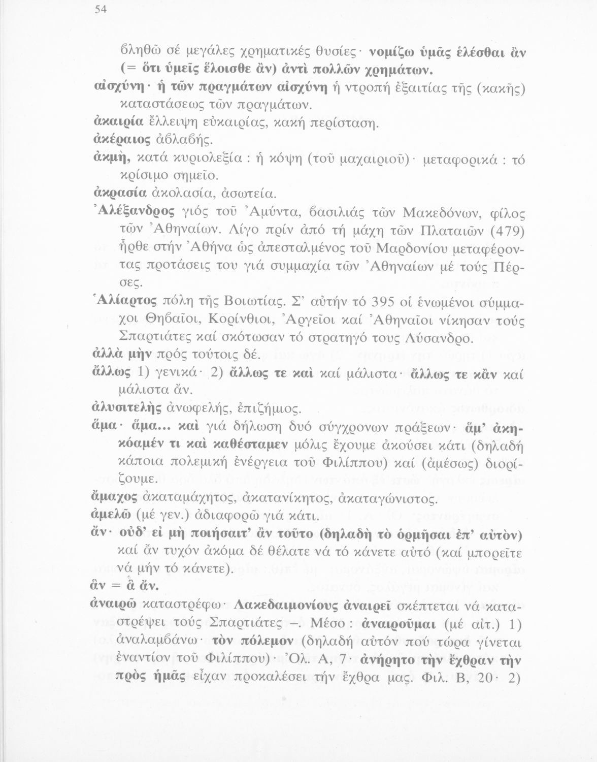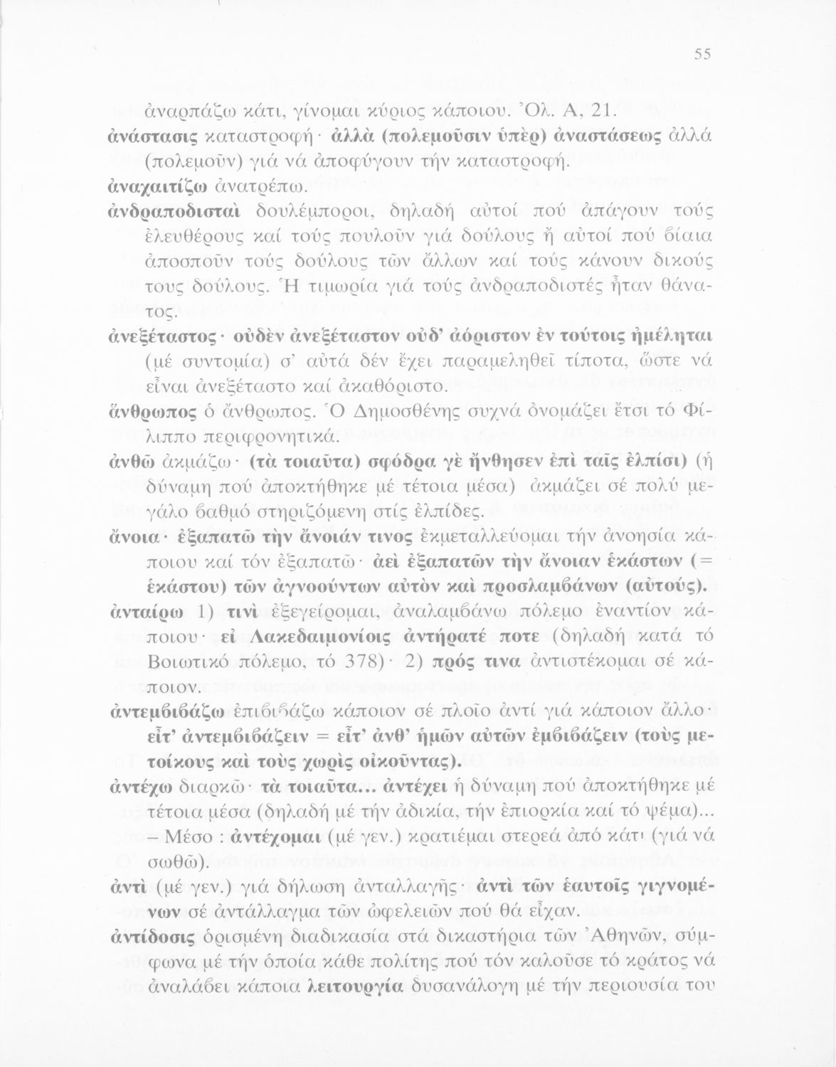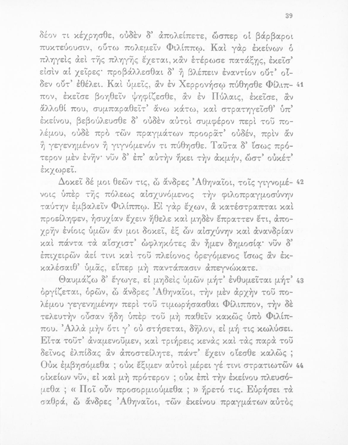 Σχολικό εγχειρίδιο Αρχαίων Ελληνικών Δ΄ Γυμνασίου που περιλαμβάνει εισαγωγή στη ζωή και στο έργο του Δημοσθένη, τον Α΄ κατά Φιλίππου, και τους Α΄ και Β΄ Ολυνθιακούς και ερμηνευτικά και ετυμολογικά σχόλια.