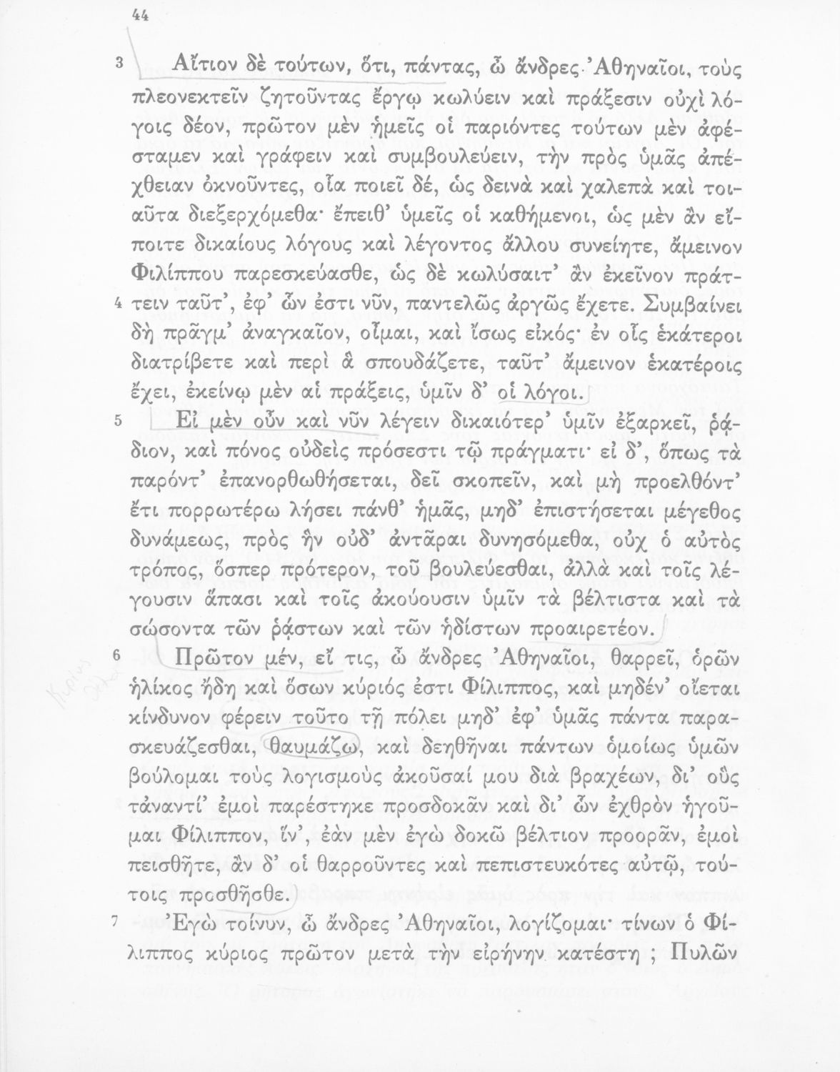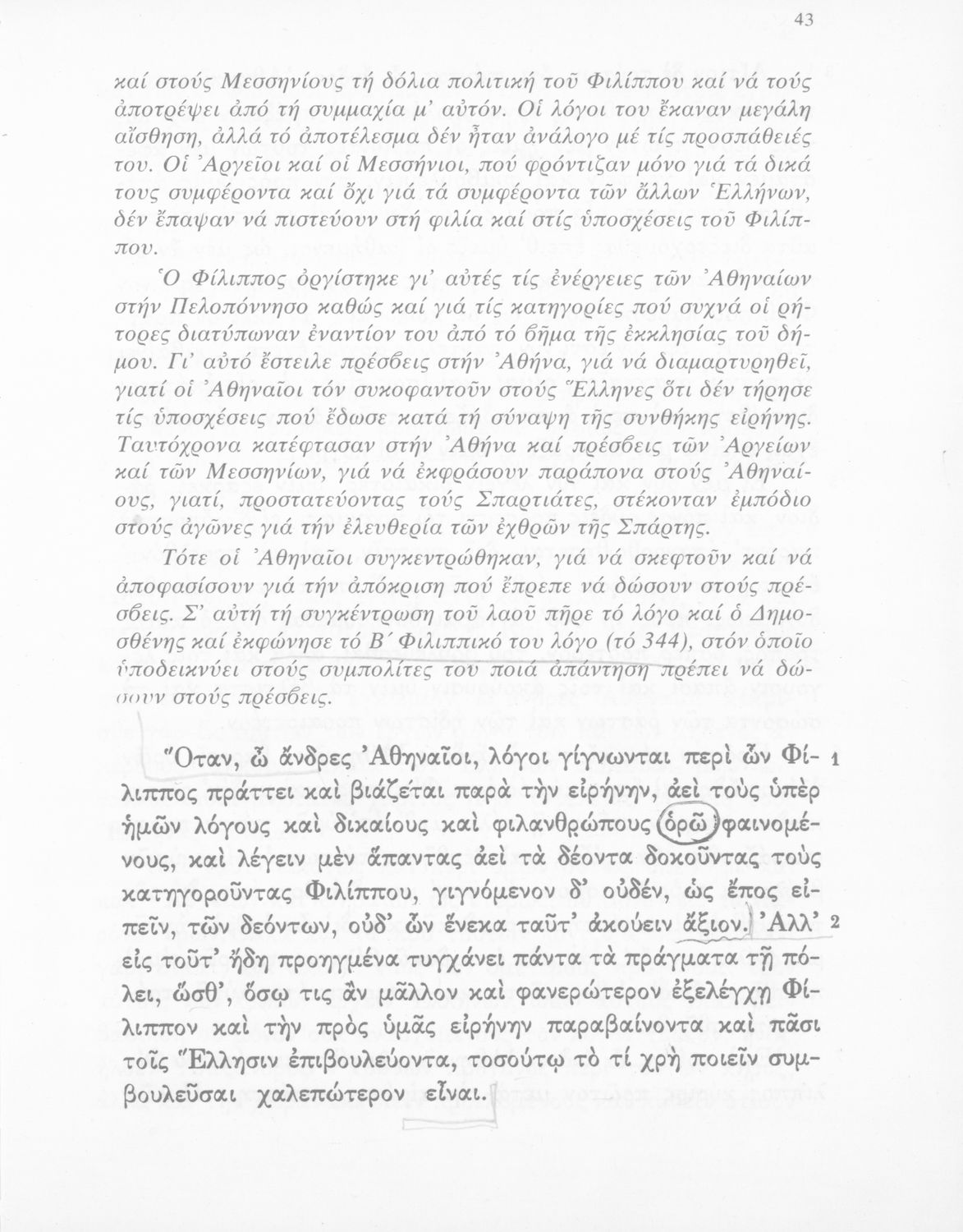 Σχολικό εγχειρίδιο Αρχαίων Ελληνικών Δ΄ Γυμνασίου που περιλαμβάνει τους Ολυνθιακούς Α΄ και Β΄ και τους Φιλιππικούς Α΄ και Β' του Δημοσθένη, εισαγωγή και ερμηνευτικά σχόλια. Φέρει το σύμβολο της δικτατορίας.