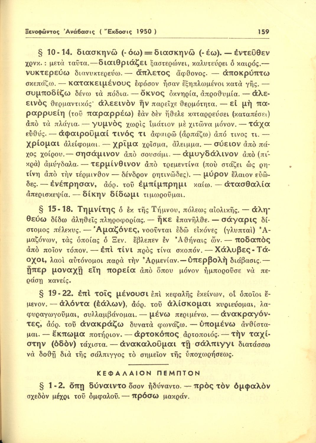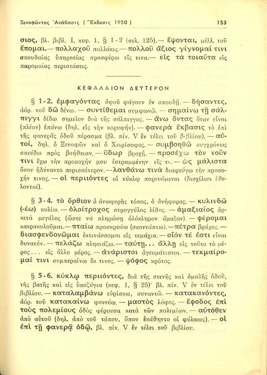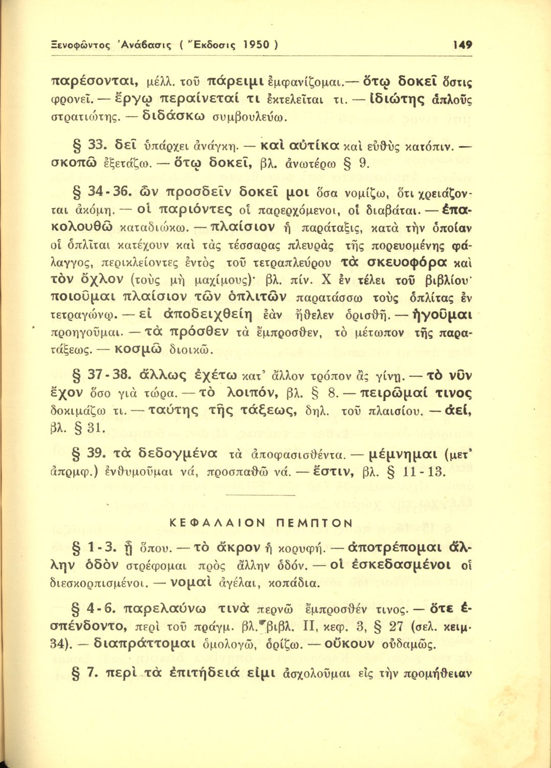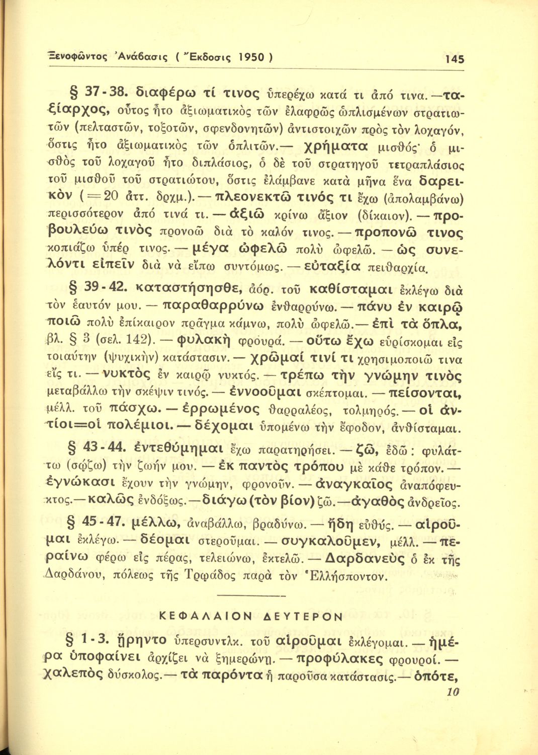 Το σύγγραμμα ήταν σχολικό εγχειρίδιο για το μάθημα των Αρχαίων Ελληνικών στο Γυμνάσιο. Περιλαμβάνει το πρωτότυπο κείμενο από το έργο του Ξενοφώντα, καθώς και ερμηνευτικές και λεξιλογικές παρατηρήσεις του ...