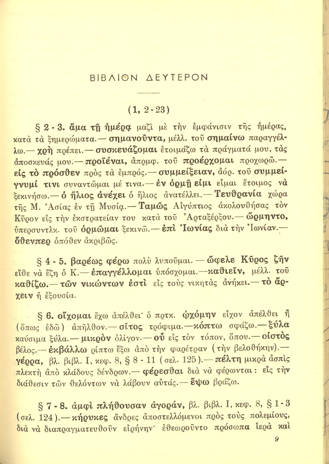 Σχολικό εγχειρίδιο Αρχαίων Ελληνικών Β΄ Γυμνασίου που περιέχει αποσπάσματα από τα έργα του Ξενοφώντα Ελληνικά και Κύρου Ανάβασις, λεξιλογικές παρατηρήσεις, ερμηνευτικά, πραγματολογικά σχόλια και γραμματικές παρατηρήσεις.