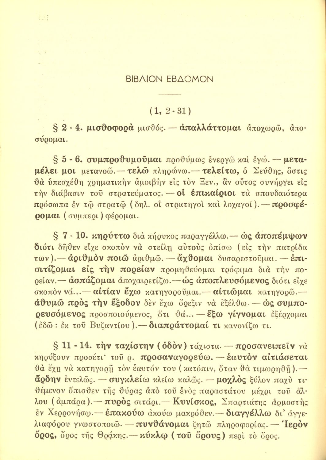 Σχολικό εγχειρίδιο Αρχαίων Ελληνικών για τη Β΄ Γυμνασίου. Πρόκειται για βιβλίο αρχαίων σε μετάφραση από το έργο του Ξενοφώντα. Στο βιβλίο απεικονίζεται το σύμβολο της επταετίας.