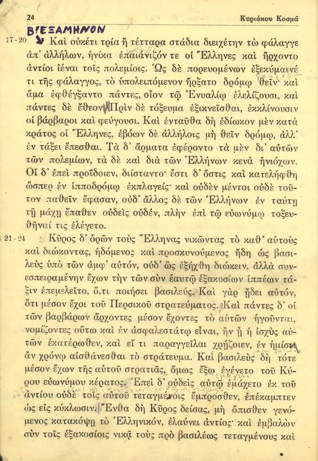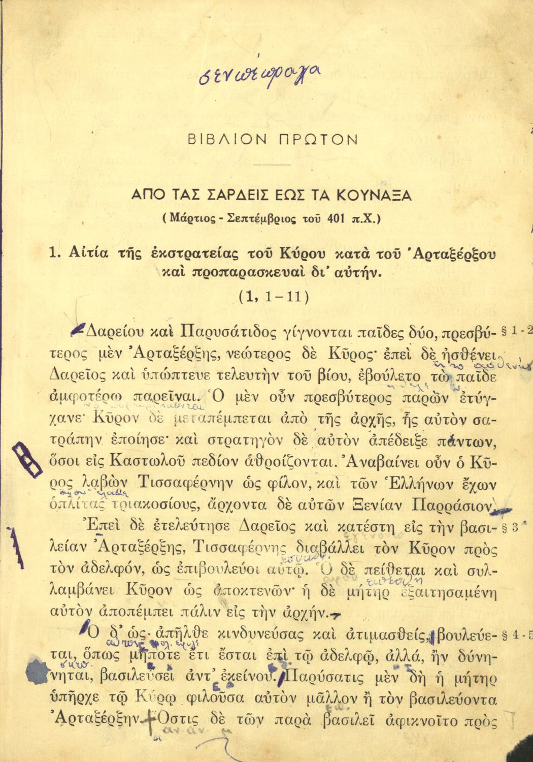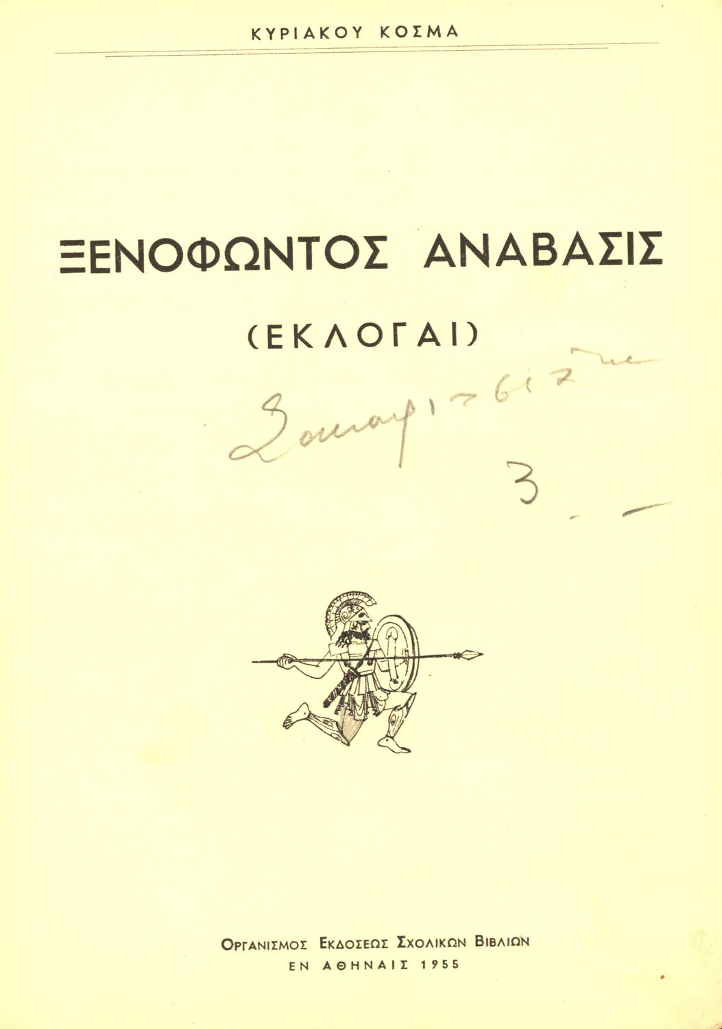 Σχολικό εγχειρίδιο Αρχαίων Ελληνικών για τη Β΄ Γυμνασίου. Πρόκειται για βιβλίο αρχαίων σε μετάφραση από το έργο του Ξενοφώντα. Στο βιβλίο απεικονίζεται το σύμβολο της επταετίας.