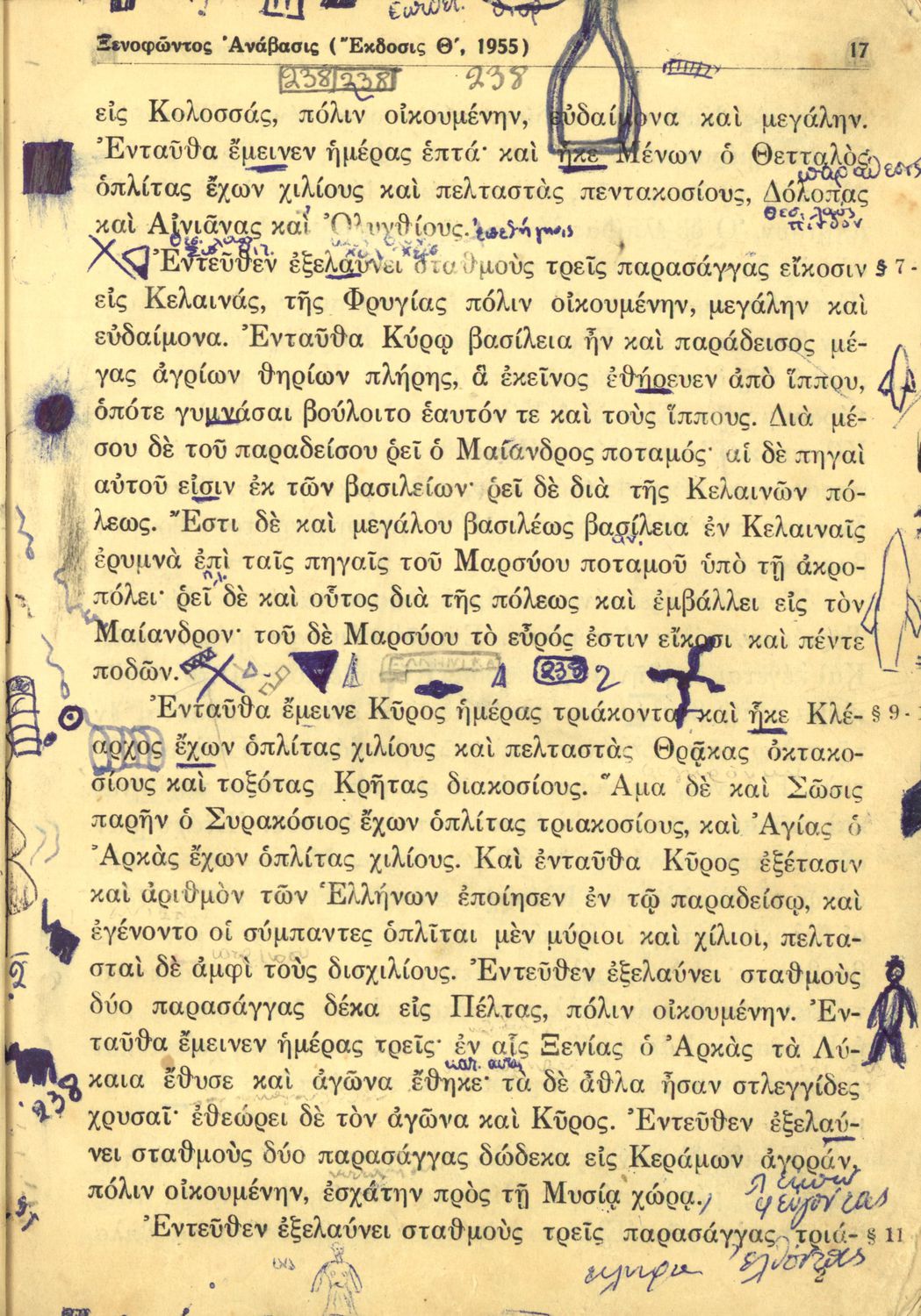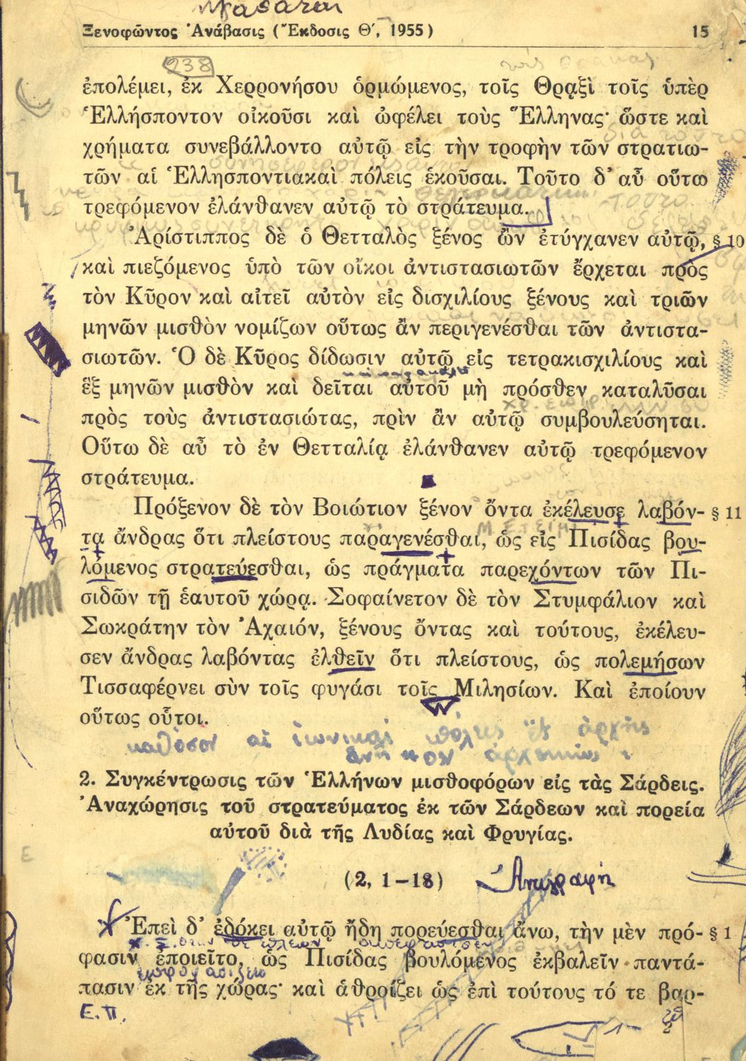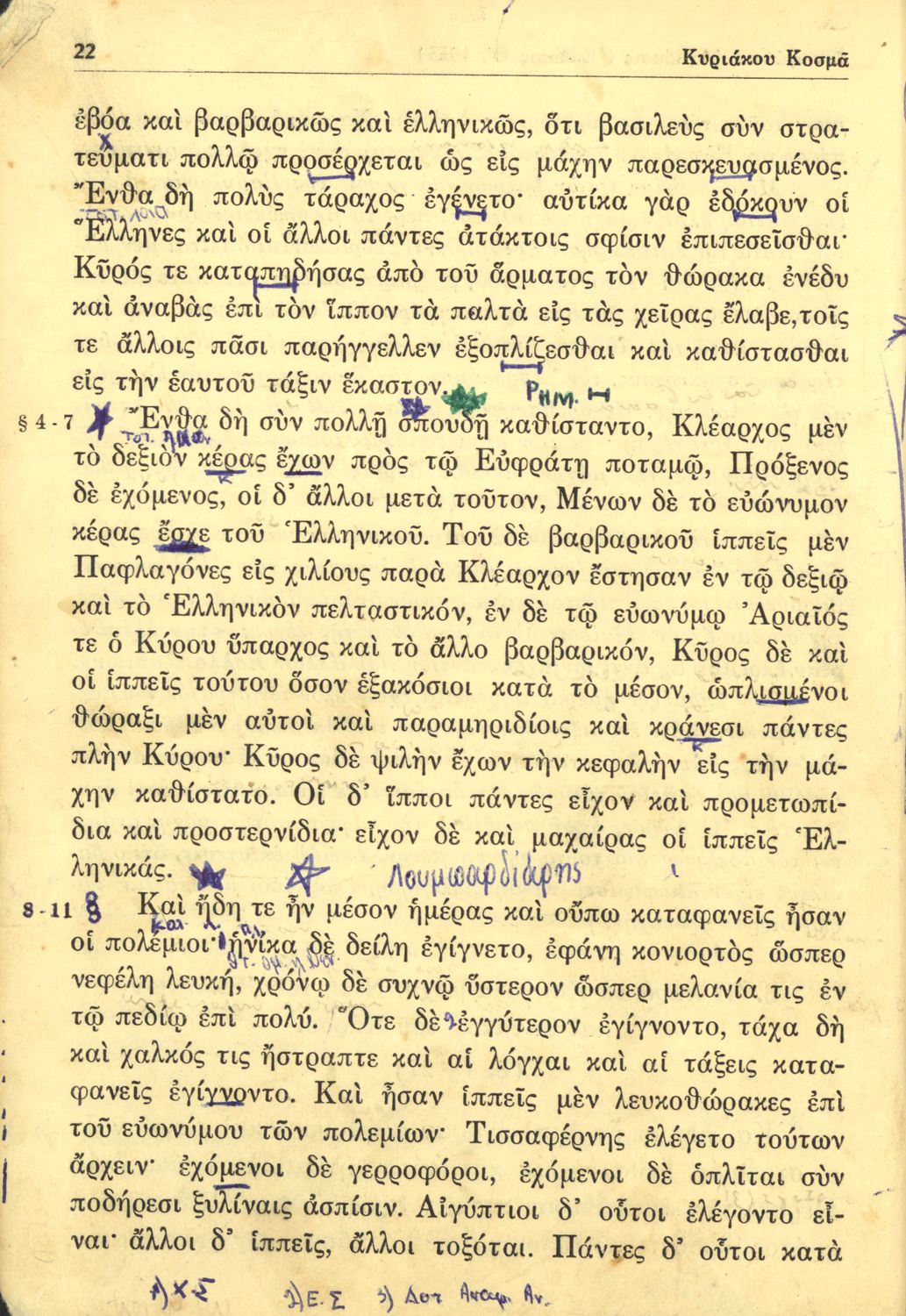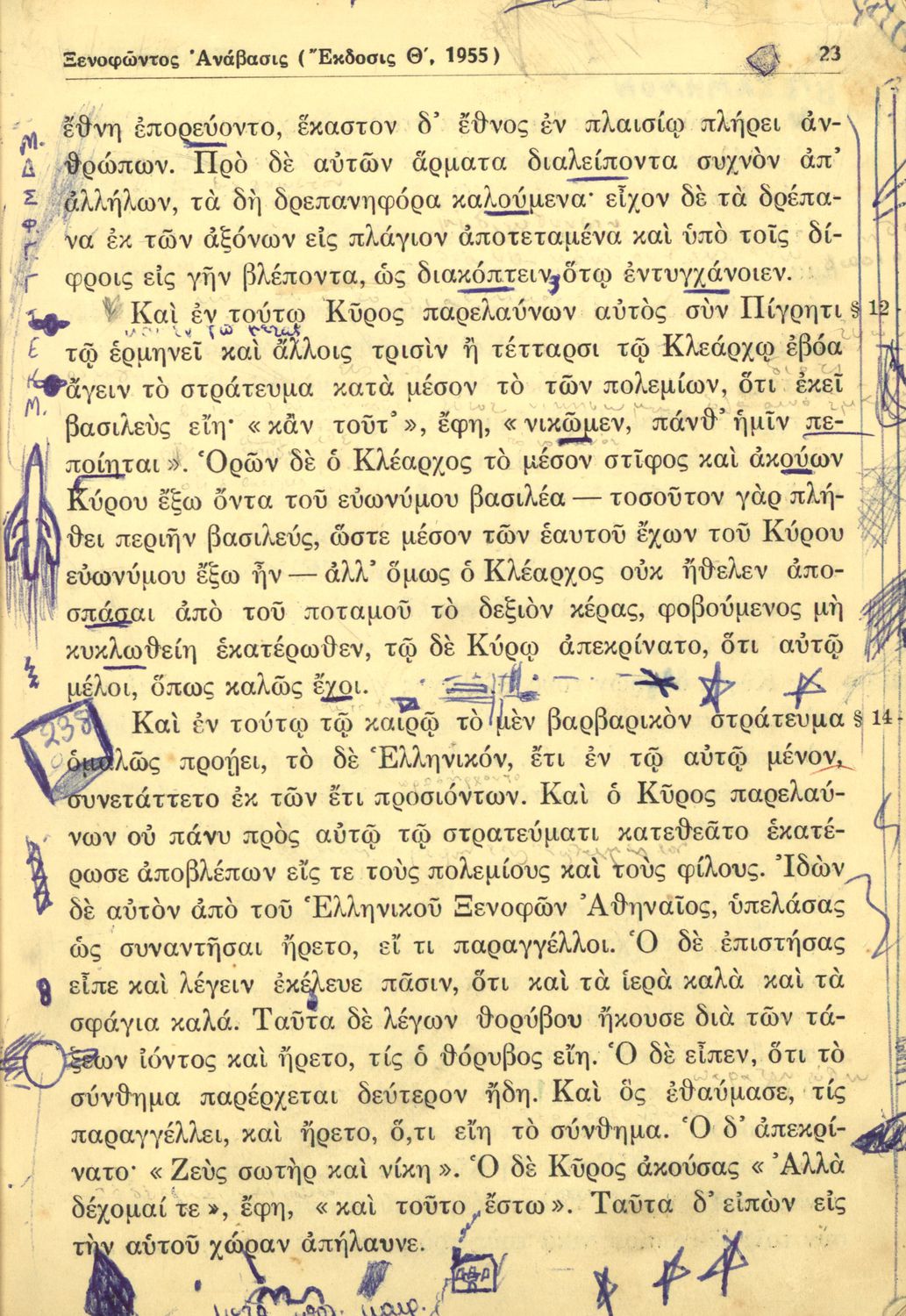 Σχολικό εγχειρίδιο Αρχαίων Ελληνικών για τη Β΄ Γυμνασίου. Πρόκειται για βιβλίο αρχαίων σε μετάφραση από το έργο του Ξενοφώντα. Στο βιβλίο απεικονίζεται το σύμβολο της επταετίας.