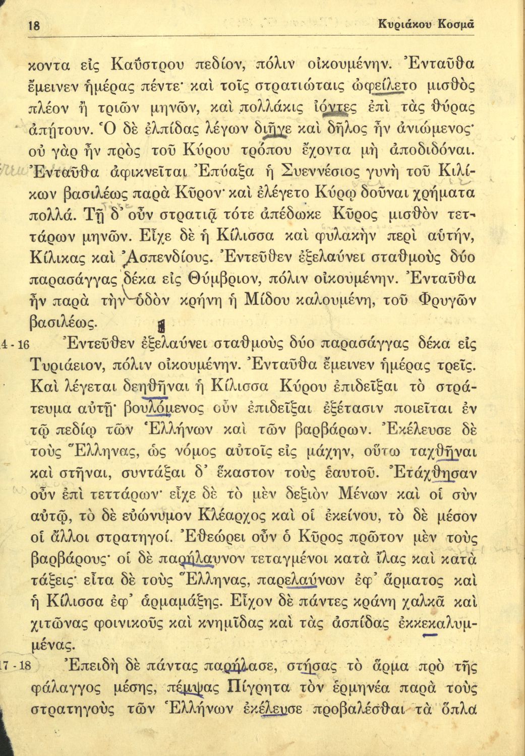 Σχολικό εγχειρίδιο Αρχαίων Ελληνικών Β΄ Γυμνασίου που περιέχει αποσπάσματα από το έργο Κύρου Ανάβασις του Ξενοφώντα, λεξιλογικές παρατηρήσεις, ερμηνευτικά, πραγματολογικά σχόλια και γραμματικές παρατηρήσεις.