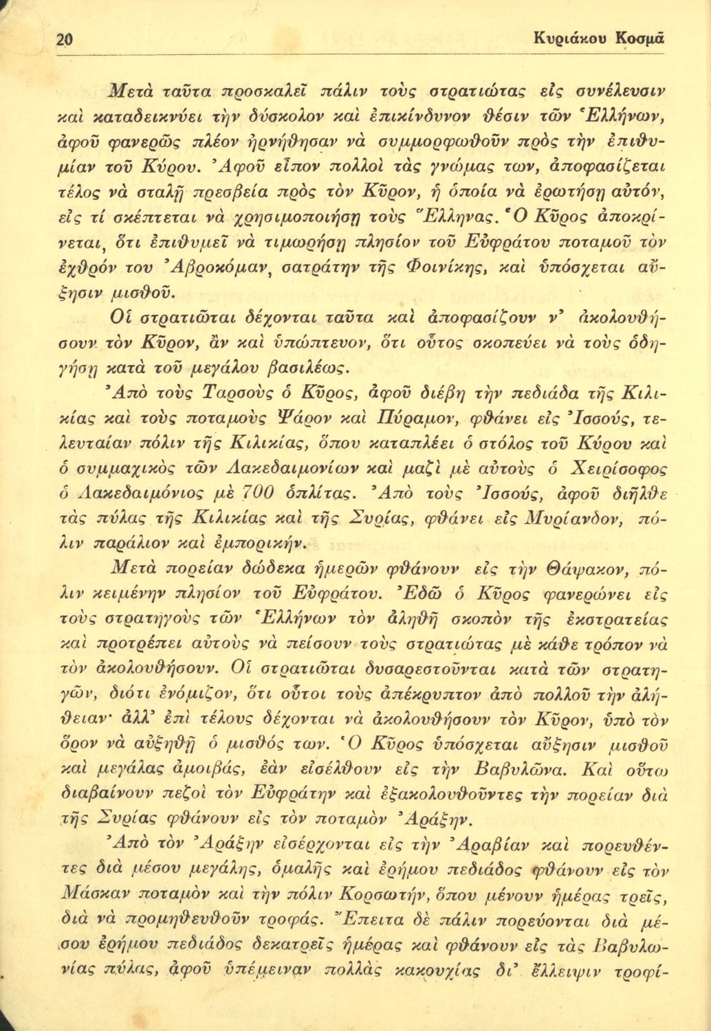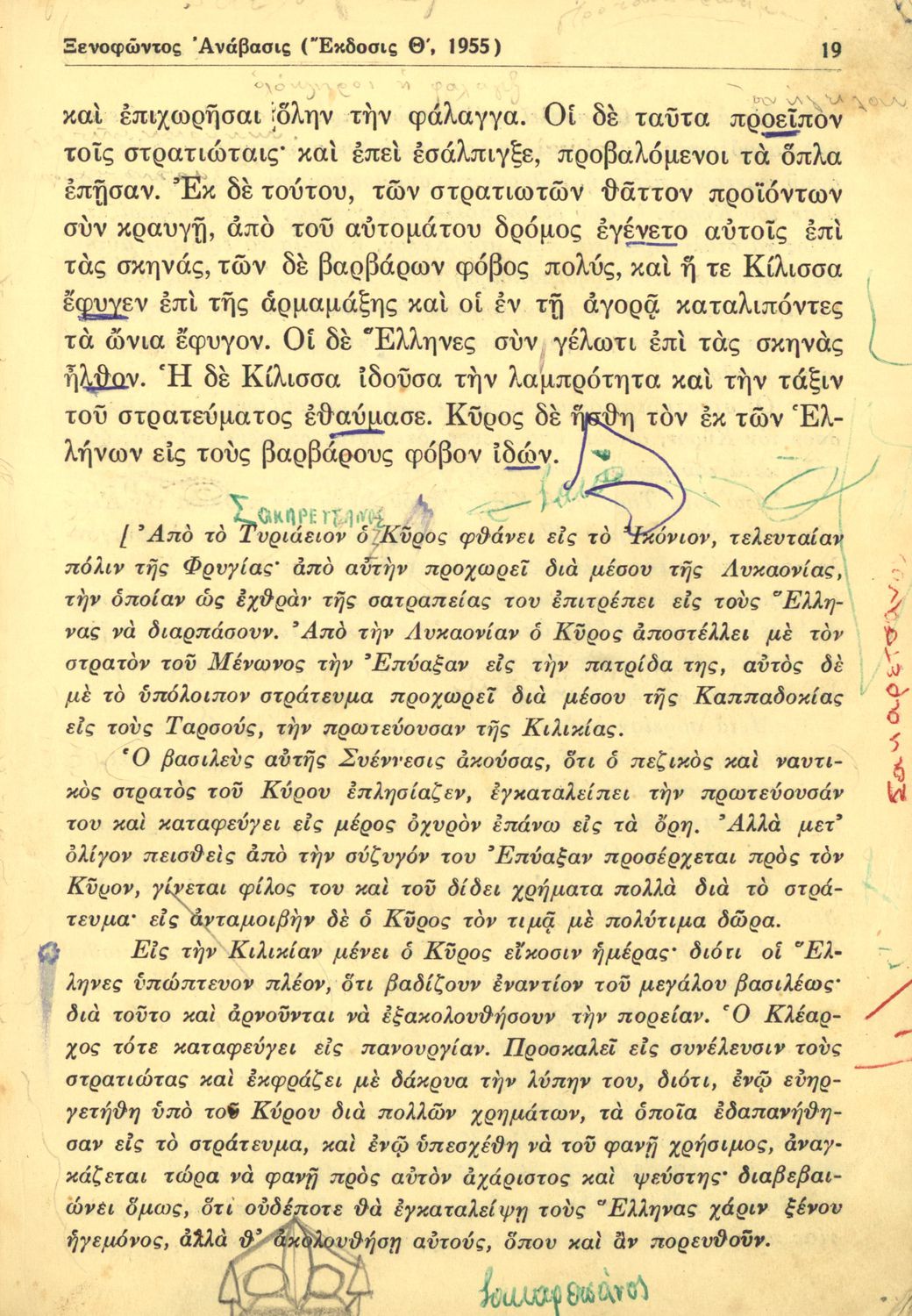 Σχολικό εγχειρίδιο της Γ΄ Γυμνασίου για το μάθημα των Αρχαίων. Περιέχει αποσπάσματα από το έργο του Ξενοφώντα, ερμηνευτικά και πραγματολογικά σχόλια και λεξιλογικές παρατηρήσεις.