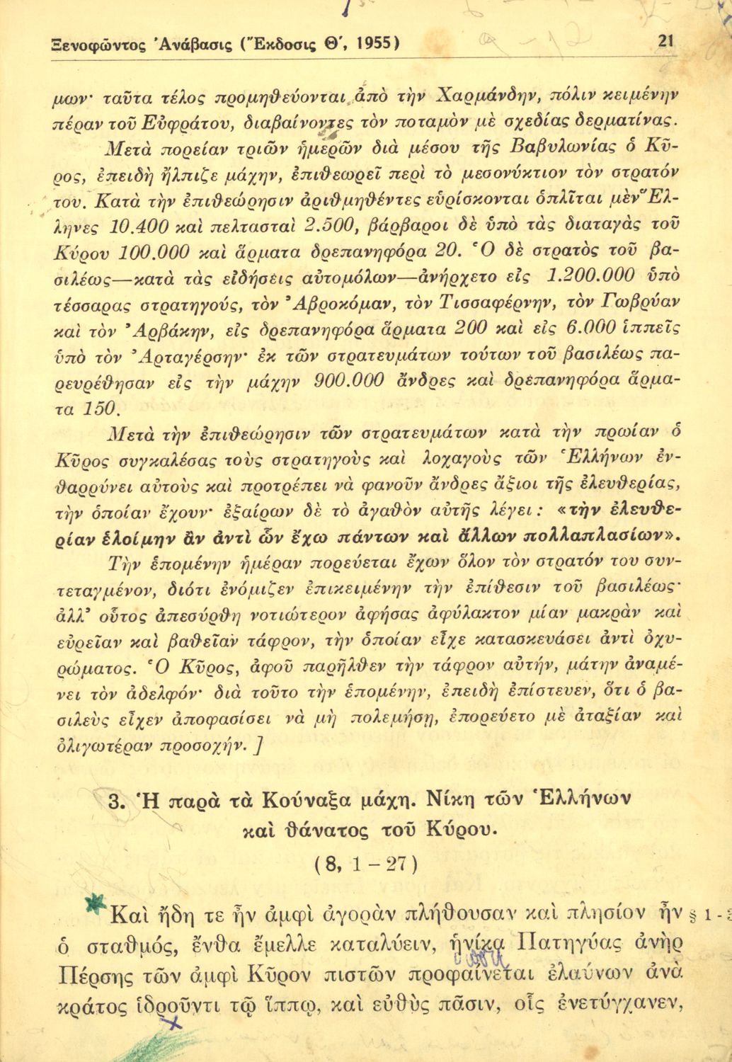 Σχολικό εγχειρίδιο Αρχαίων Ελληνικών για τη Γ' Γυμνασίου που περιέχει αποσπάσματα από την Ανάβαση του Ξενοφώντα και ερμηνευτικά και ετυμολογικά σχόλια.
