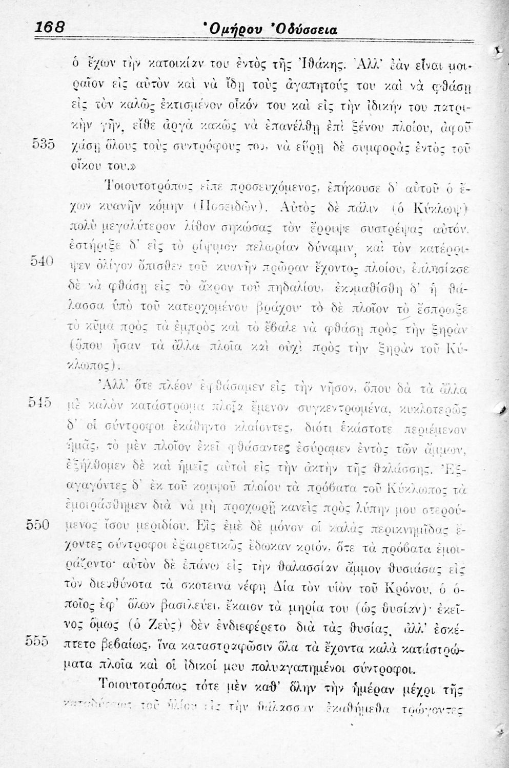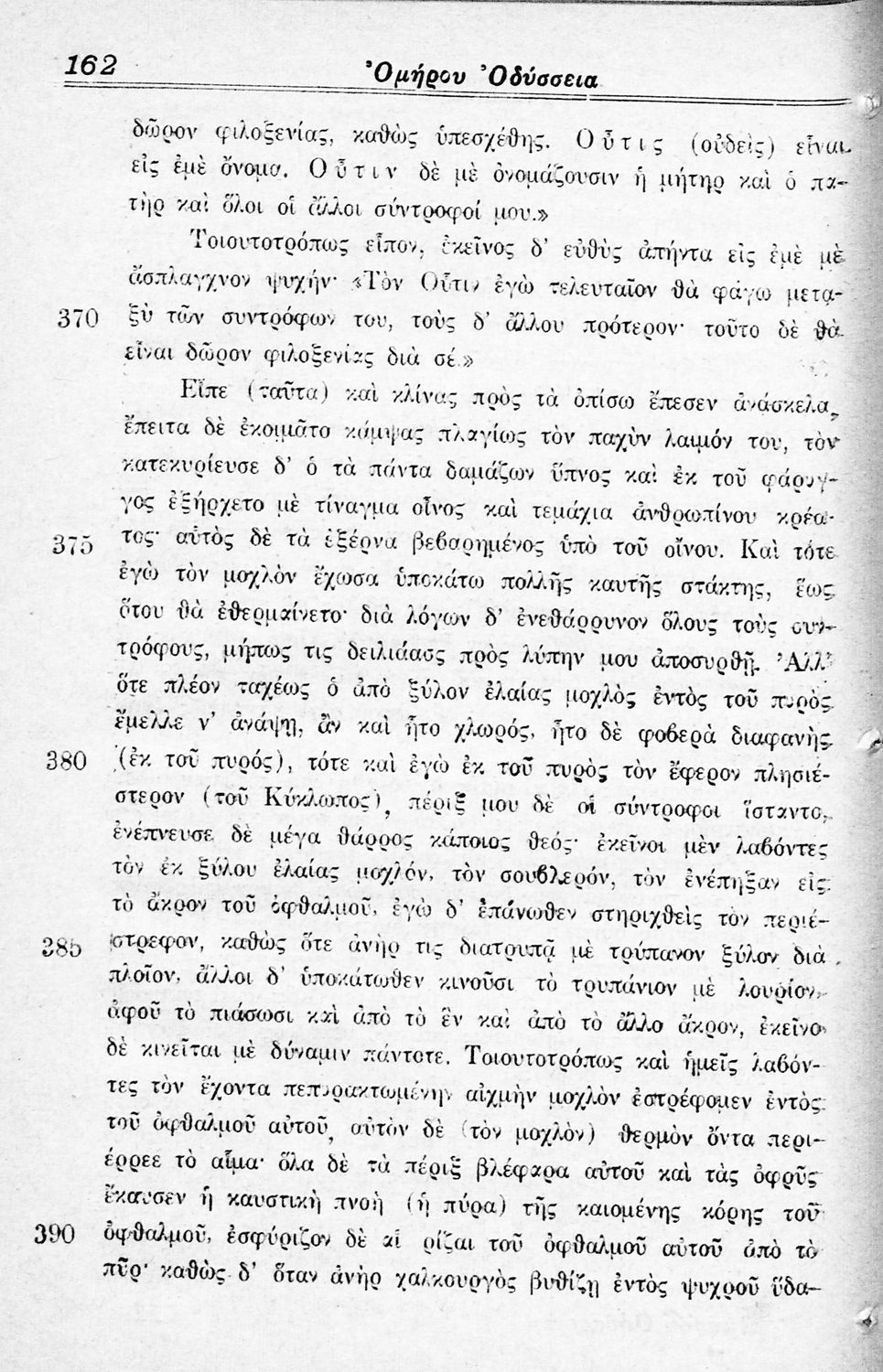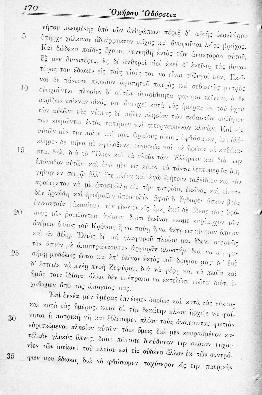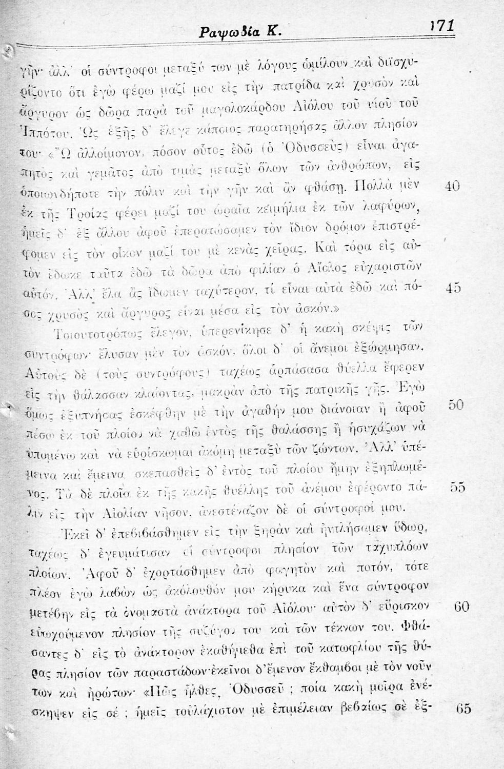 Σχολικό εγχειρίδιο της Α΄, Β΄, Γ΄ Γυμνασίου για το μάθημα των Αρχαίων Ελληνικών. Περιέχει τις ραψωδίες της Οδύσσειας, μετάφραση, ερμηνευτικά και πραγματολογικά σχόλια, καθώς και γραμματικές παρατηρήσεις.