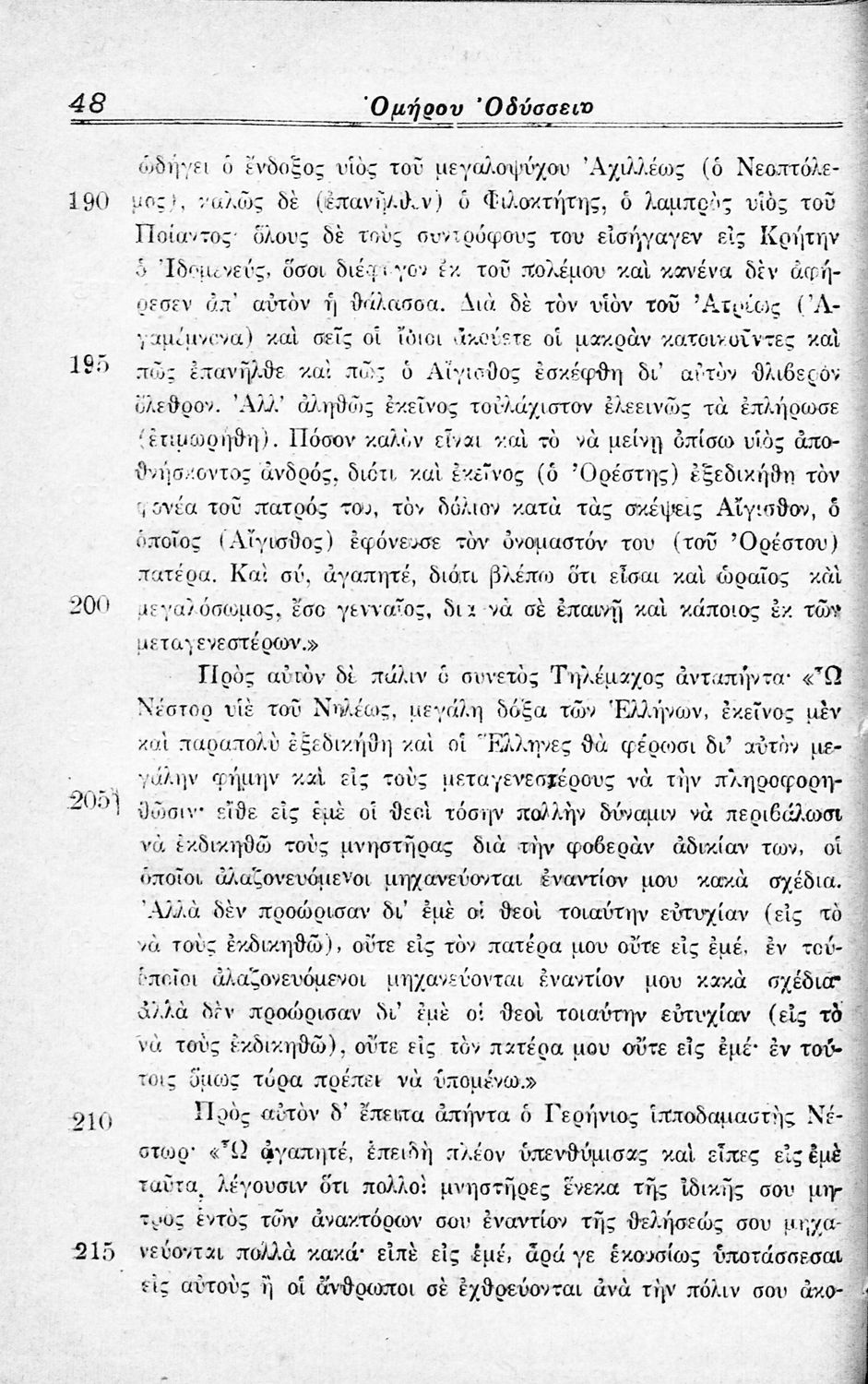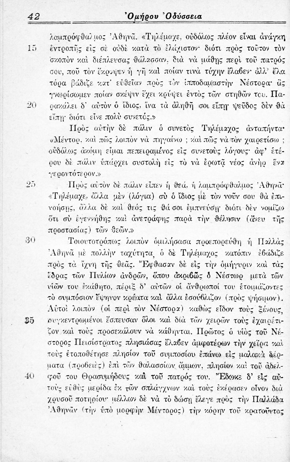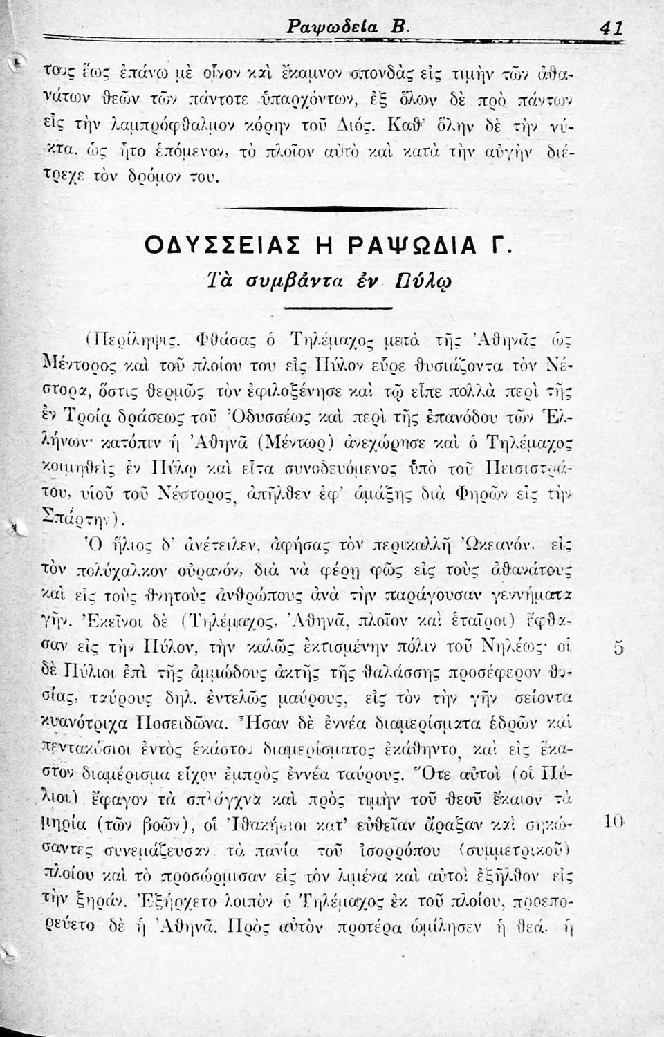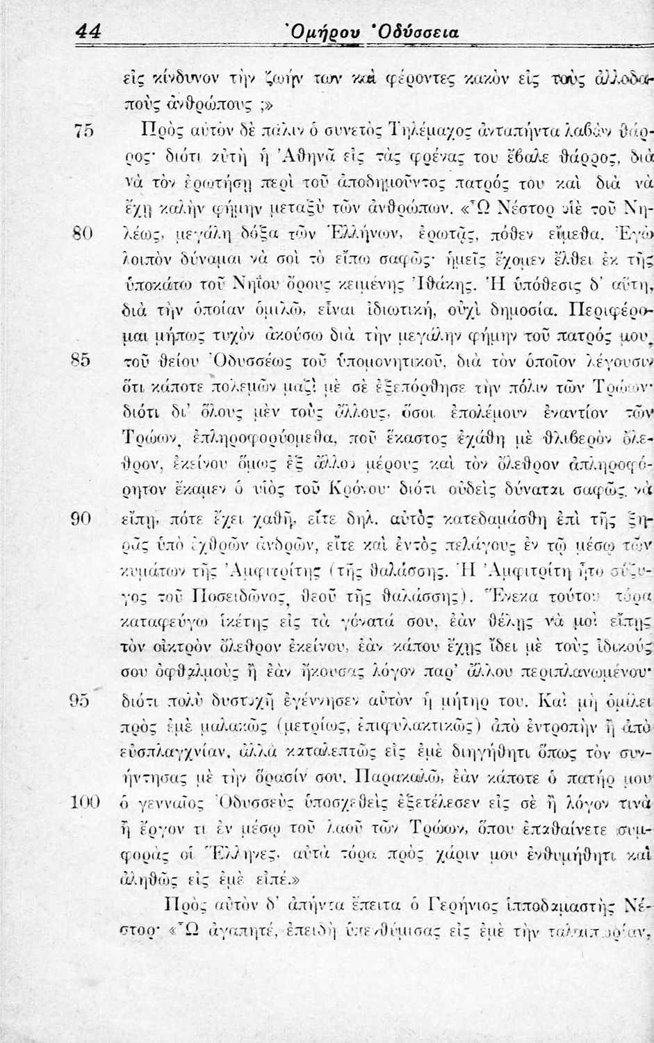 Σχολικό εγχειρίδιο της Α΄, Β΄, Γ΄ Γυμνασίου για το μάθημα των Αρχαίων Ελληνικών. Περιέχει τις ραψωδίες της Οδύσσειας, μετάφραση, ερμηνευτικά και πραγματολογικά σχόλια, καθώς και γραμματικές παρατηρήσεις.