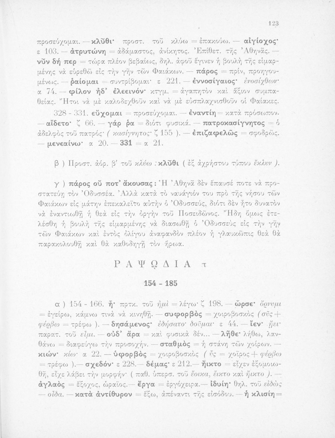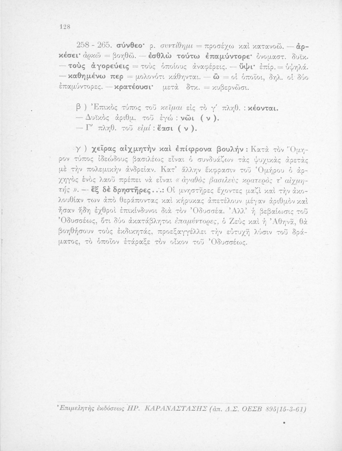 Σχολικό εγχειρίδιο Αρχαίων Ελληνικών Γυμνασίου που περιλαμβάνει αποσπάσματα από τις ραψωδίες της Οδύσσειας, ερμηνευτικά και πραγματολογικά σχόλια, και λεξιλογικές παρατηρήσεις.