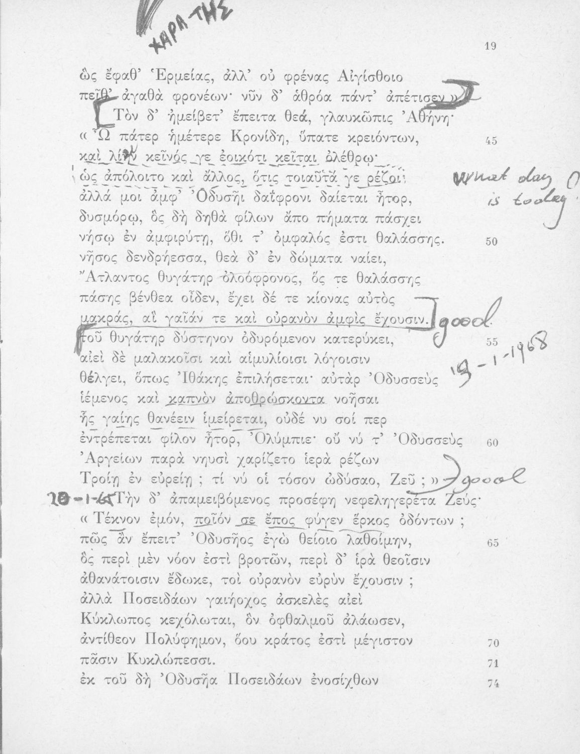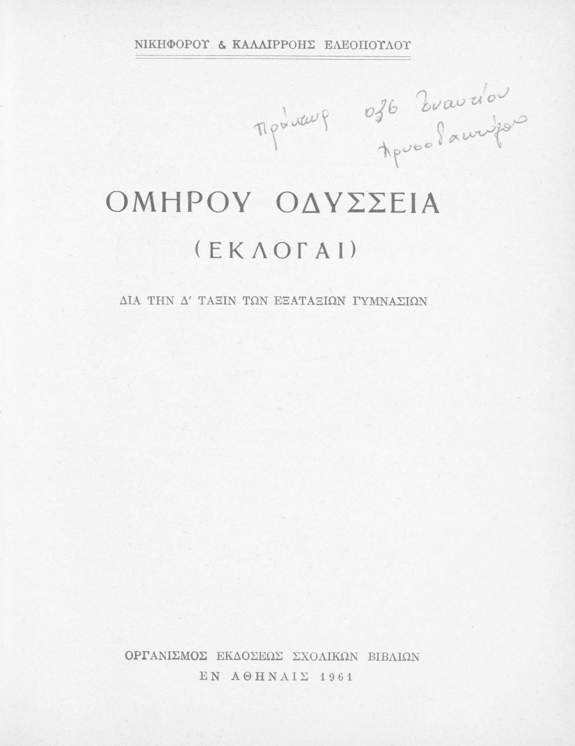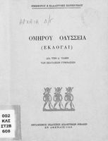 Βαθμίδα εκπαίδευσης: Δευτεροβάθμια Τάξη: Γυμνάσιο Μάθημα: Αρχαία Ελληνικά Γλώσσα: Απλή καθαρεύουσα Παρουσίαση περιεχομένου: Σχολικό εγχειρίδιο Αρχαίων Ελληνικών Γυμνασίου που περιλαμβάνει αποσπάσματα από τις ραψωδίες της Οδύσσειας, ερμηνευτικά και πραγματολογικά σχόλια, και λεξιλογικές παρατηρήσεις. |