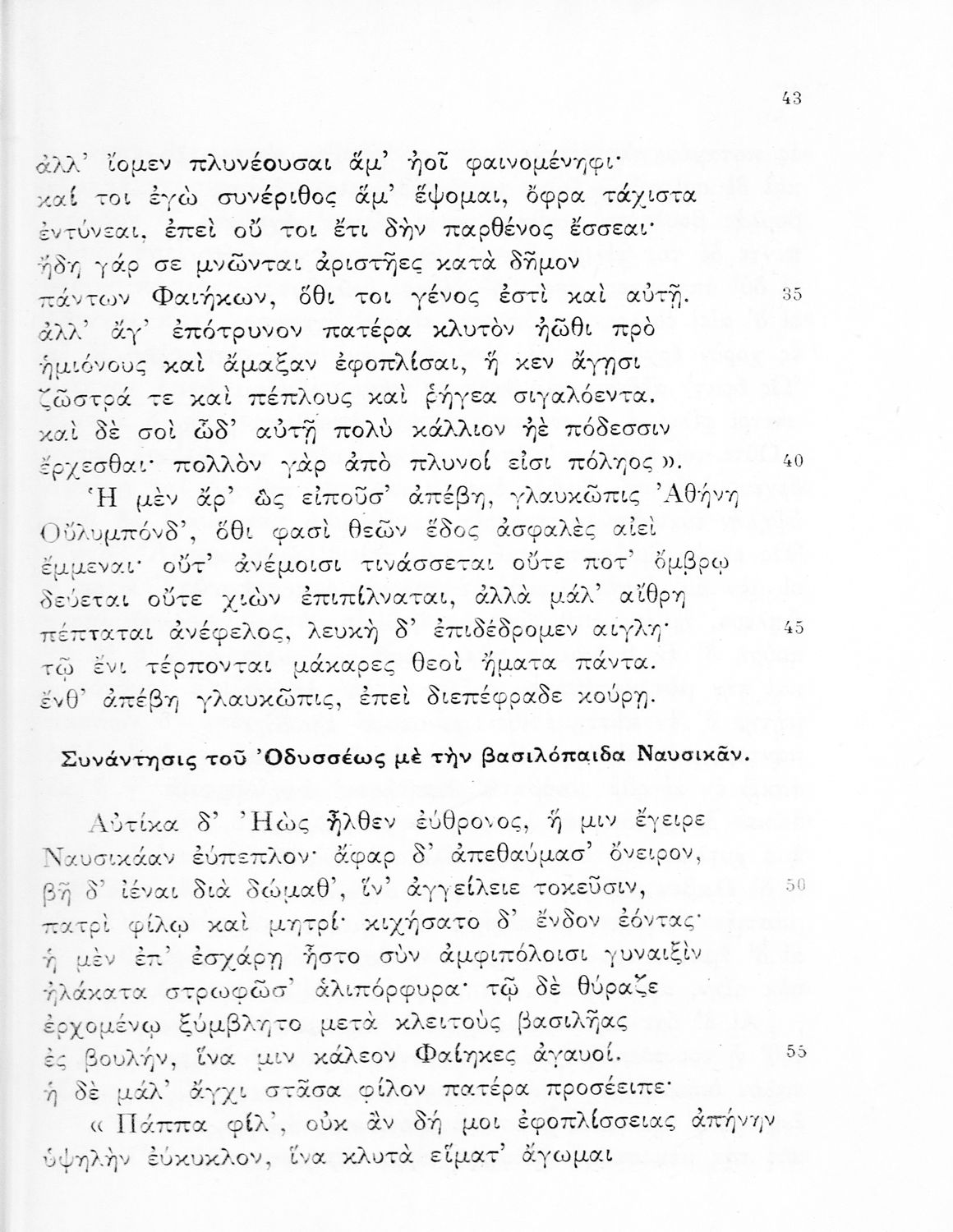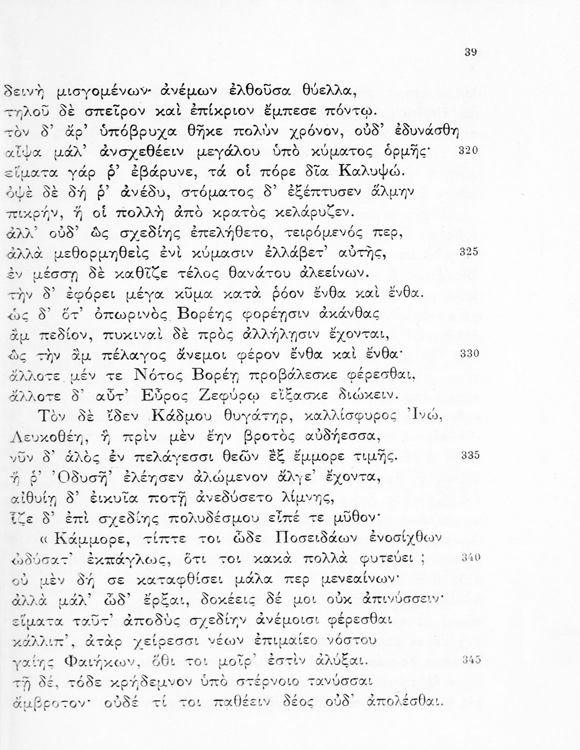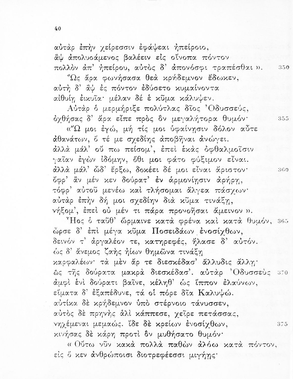 Σχολικό εγχειρίδιο της Ε΄ Γυμνασίου για το μάθημα των Αρχαίων Ελληνικών. Περιέχει αποσπάσματα από τις ραψωδίες της Οδύσσειας, ερμηνευτικά και πραγματολογικά σχόλια και τις γραμματικές παρατηρήσεις.