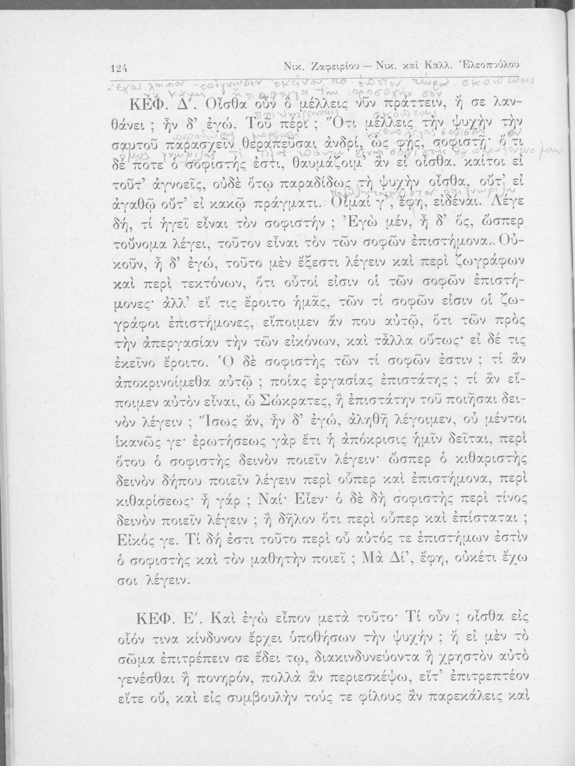 Σχολικό εγχειρίδιο για τις Τάξεις του Γυμνασίου για το μάθημα των Αρχαίων Ελληνικών. Περιλαμβάνει αποσπάσματα του αρχαίου κειμένου από τους διαλόγους του Πλάτωνα. Περιέχει μετάφραση ερμηνευτικά, πραγματολογικά