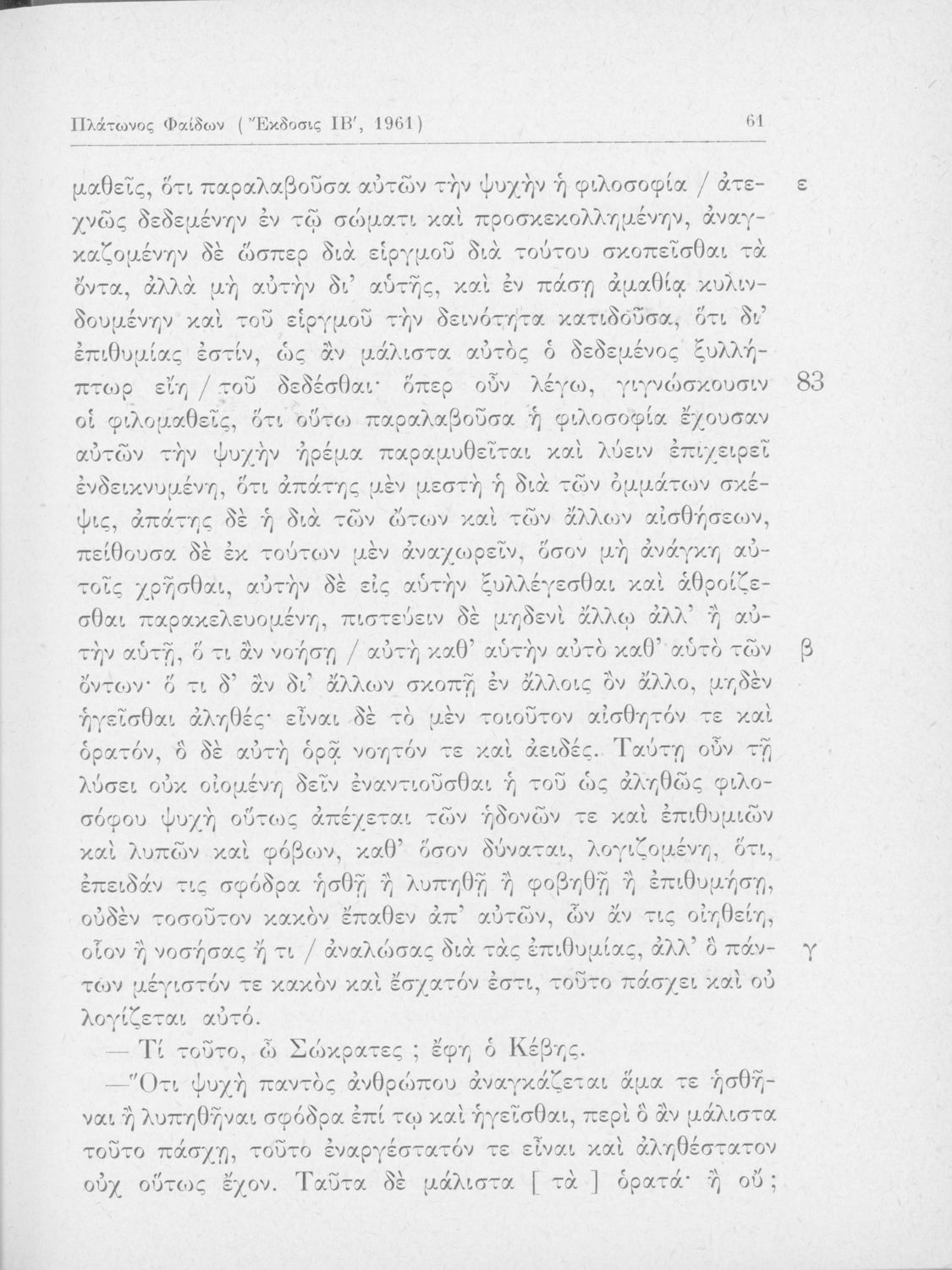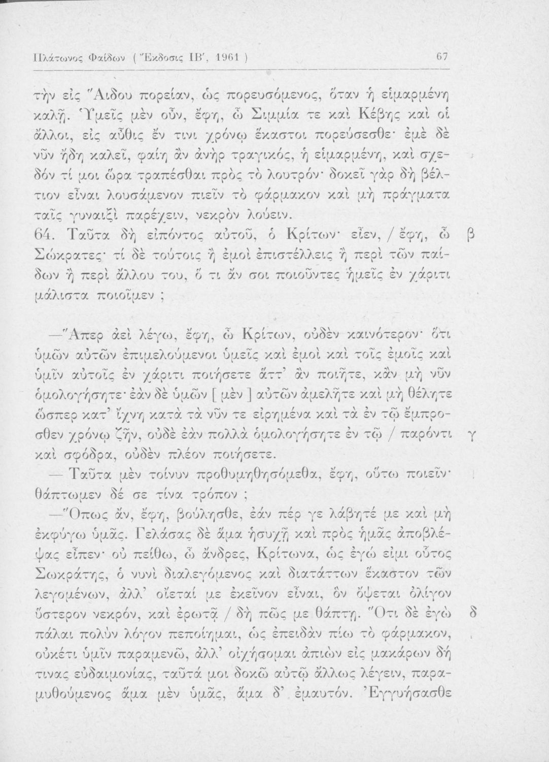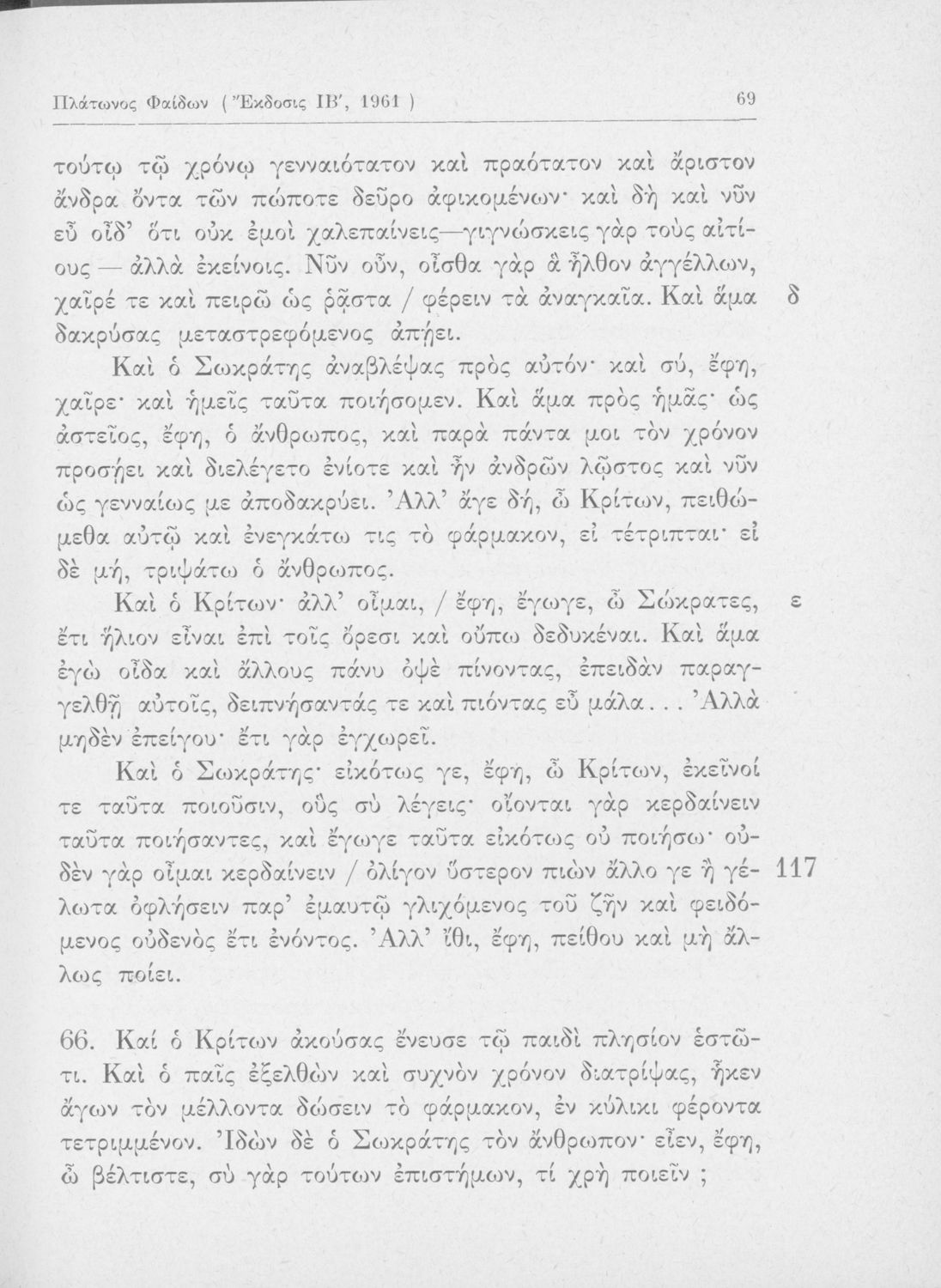 Σχολικό εγχειρίδιο για τις Τάξεις του Γυμνασίου για το μάθημα των Αρχαίων Ελληνικών. Περιλαμβάνει αποσπάσματα του αρχαίου κειμένου από τους διαλόγους του Πλάτωνα. Περιέχει μετάφραση ερμηνευτικά, πραγματολογικά