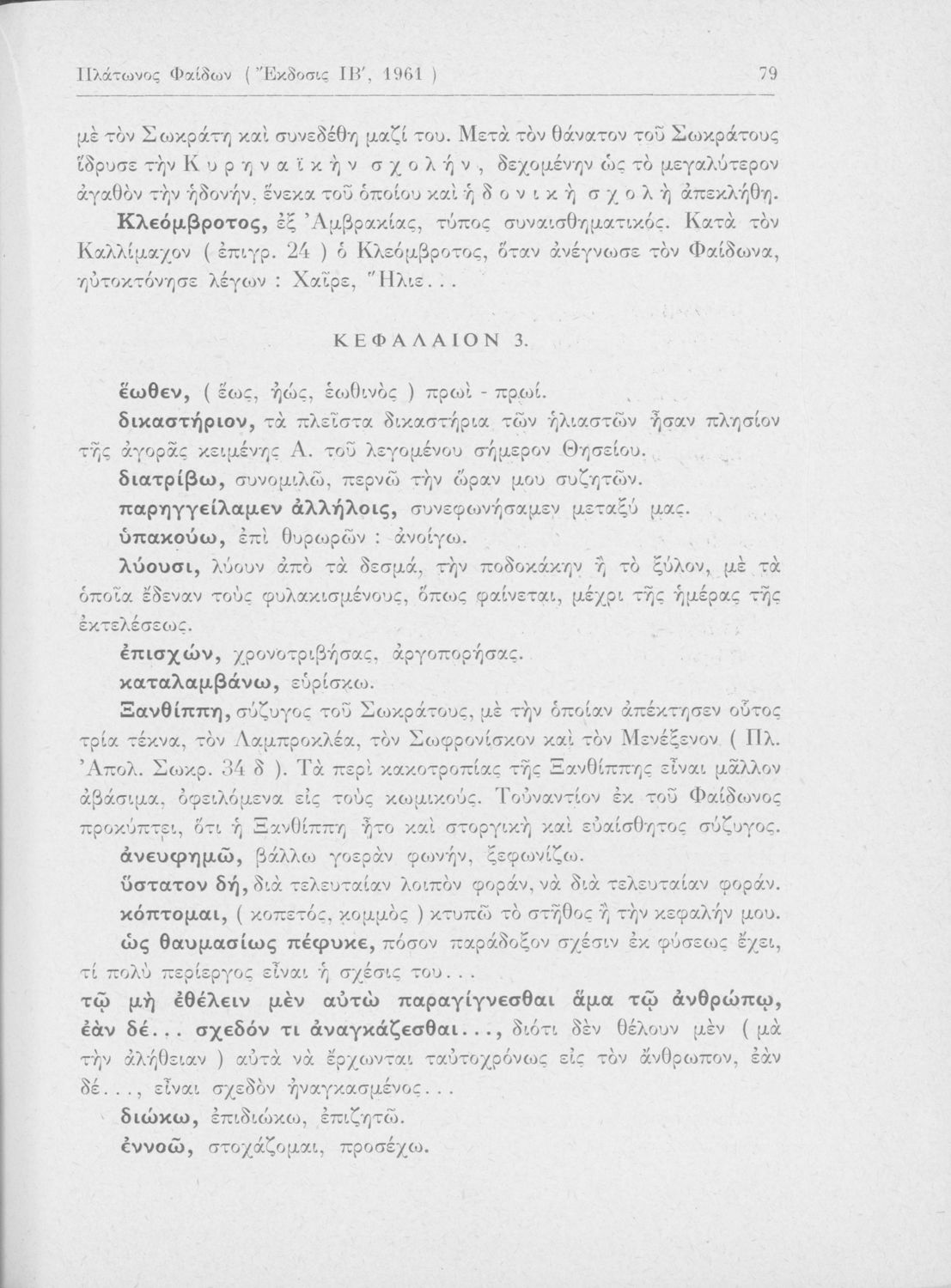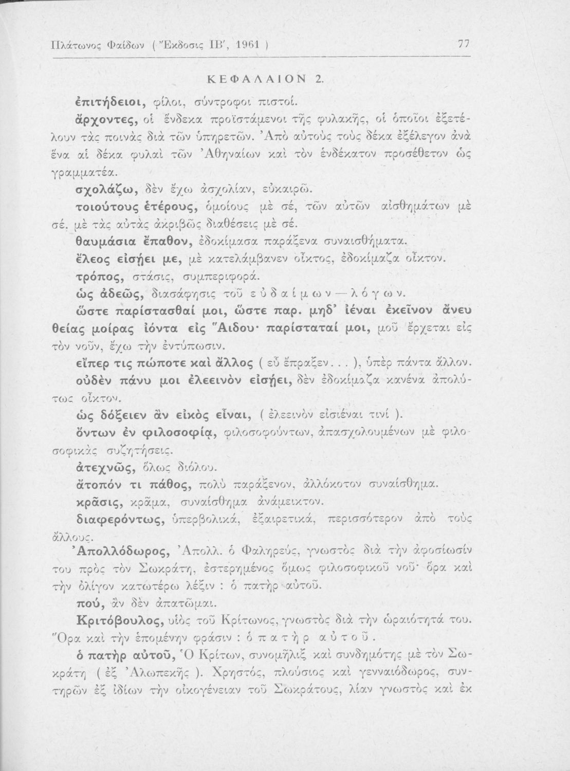 Σχολικό εγχειρίδιο για τις Τάξεις του Γυμνασίου για το μάθημα των Αρχαίων Ελληνικών. Περιλαμβάνει αποσπάσματα του αρχαίου κειμένου από τους διαλόγους του Πλάτωνα. Περιέχει μετάφραση ερμηνευτικά, πραγματολογικά