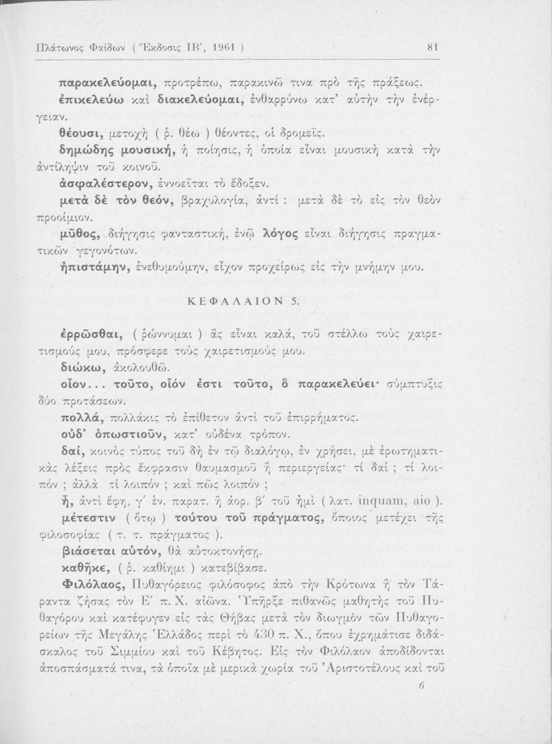 Σχολικό εγχειρίδιο Αρχαίων Ελληνικών για την ΣΤ΄ Γυμνασίου. Πρόκειται για βιβλίο με το πρωτότυπο κείμενο του Πλάτωνα. Υπάρχουν ερμηνευτικά σχόλια και εισαγωγή στη καθαρεύουσα. Το βιβλίο έχει εισαγωγές και ...