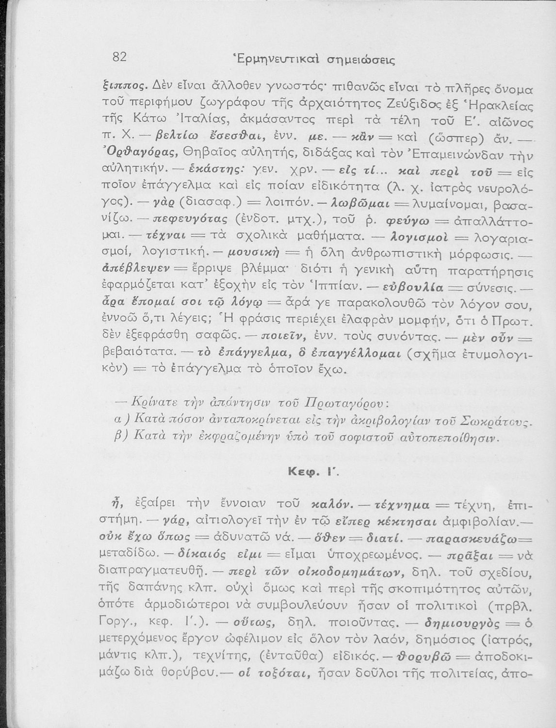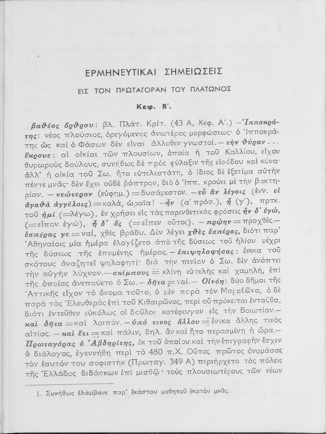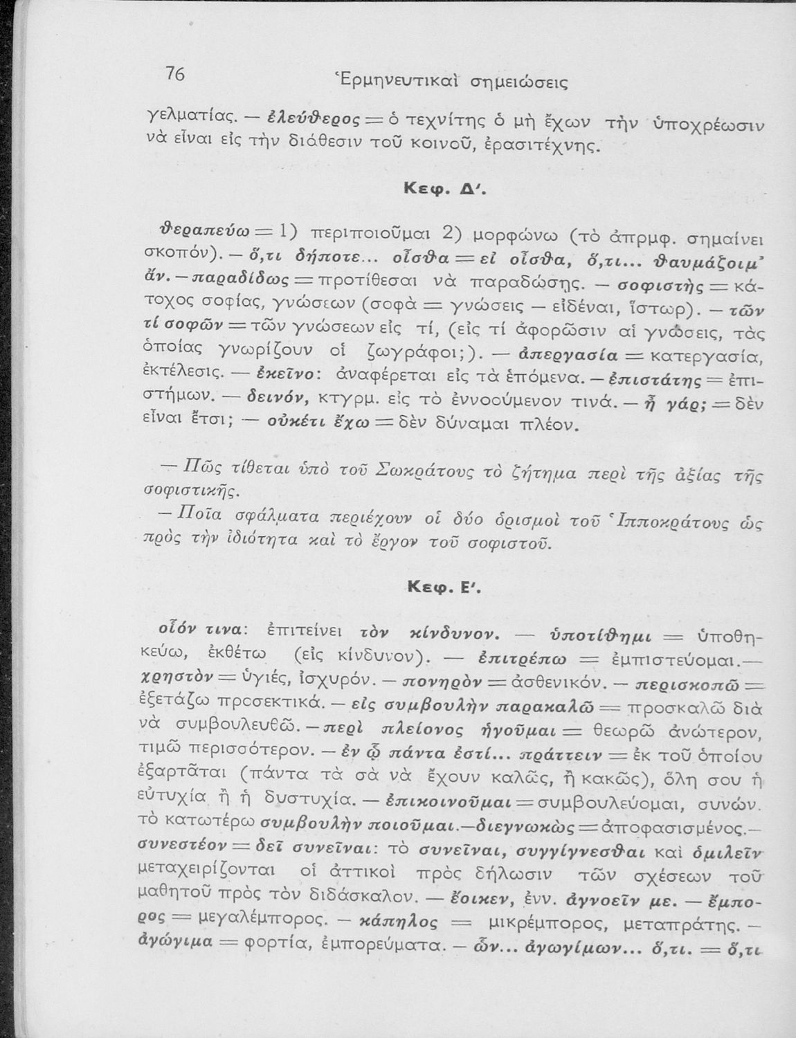 Βαθμίδα εκπαίδευσης: Δευτεροβάθμια Τάξη: ΣΤ' Γυμνασίου Μάθημα: Αρχαία Ελληνικά Γλώσσα: Καθαρεύουσα Παρουσίαση περιεχομένου: Σχολικό εγχειρίδιο Αρχαίων Ελληνικών ΣΤ΄ Γυμνασίου που περιλαμβάνει εισαγωγή στη διδασκαλία του Σωκράτη, περίληψη του έργου, τα κεφάλαια Β΄ έως ΚΕ΄, περίληψη των κεφαλαίων 26 έως 33., και ερμηνευτικές σημειώσεις. |