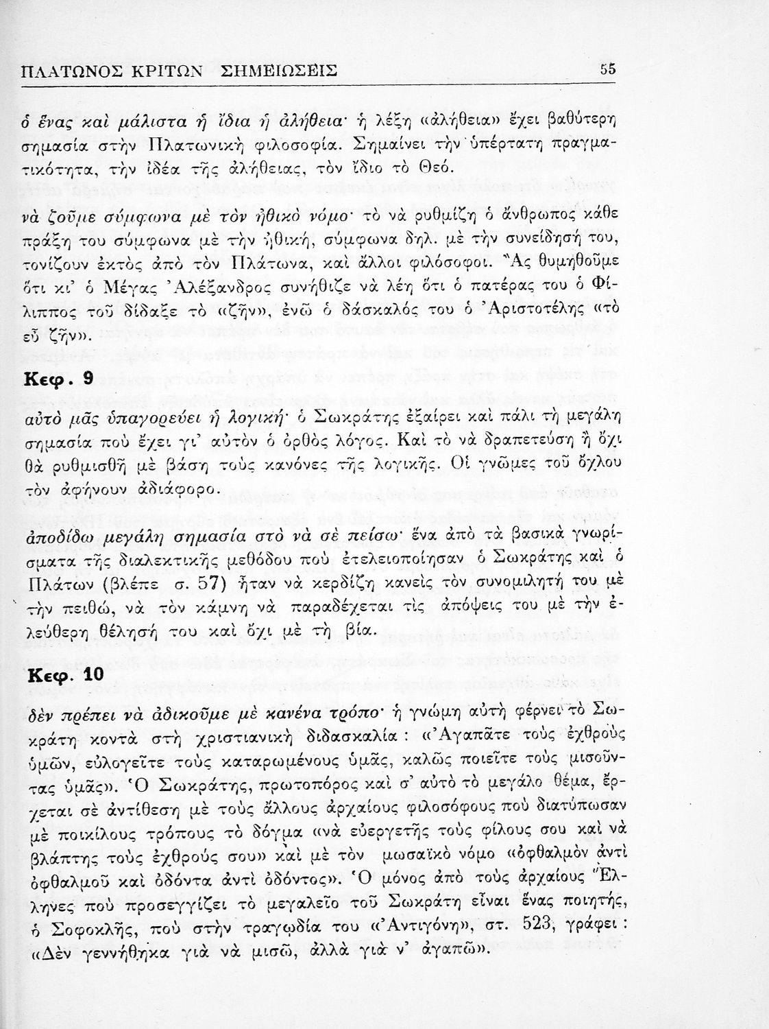 Σχολικό εγχειρίδιο Αρχαίων Ελληνικών Γ΄ Γυμνασίου που περιλαμβάνει το έργο του Πλάτωνα Κρίτων, εισαγωγή, μετάφραση και ερμηνευτικές παρατηρήσεις.