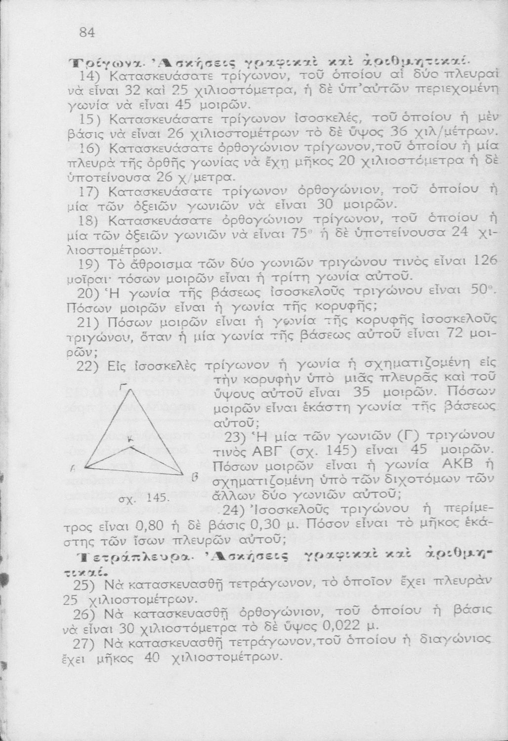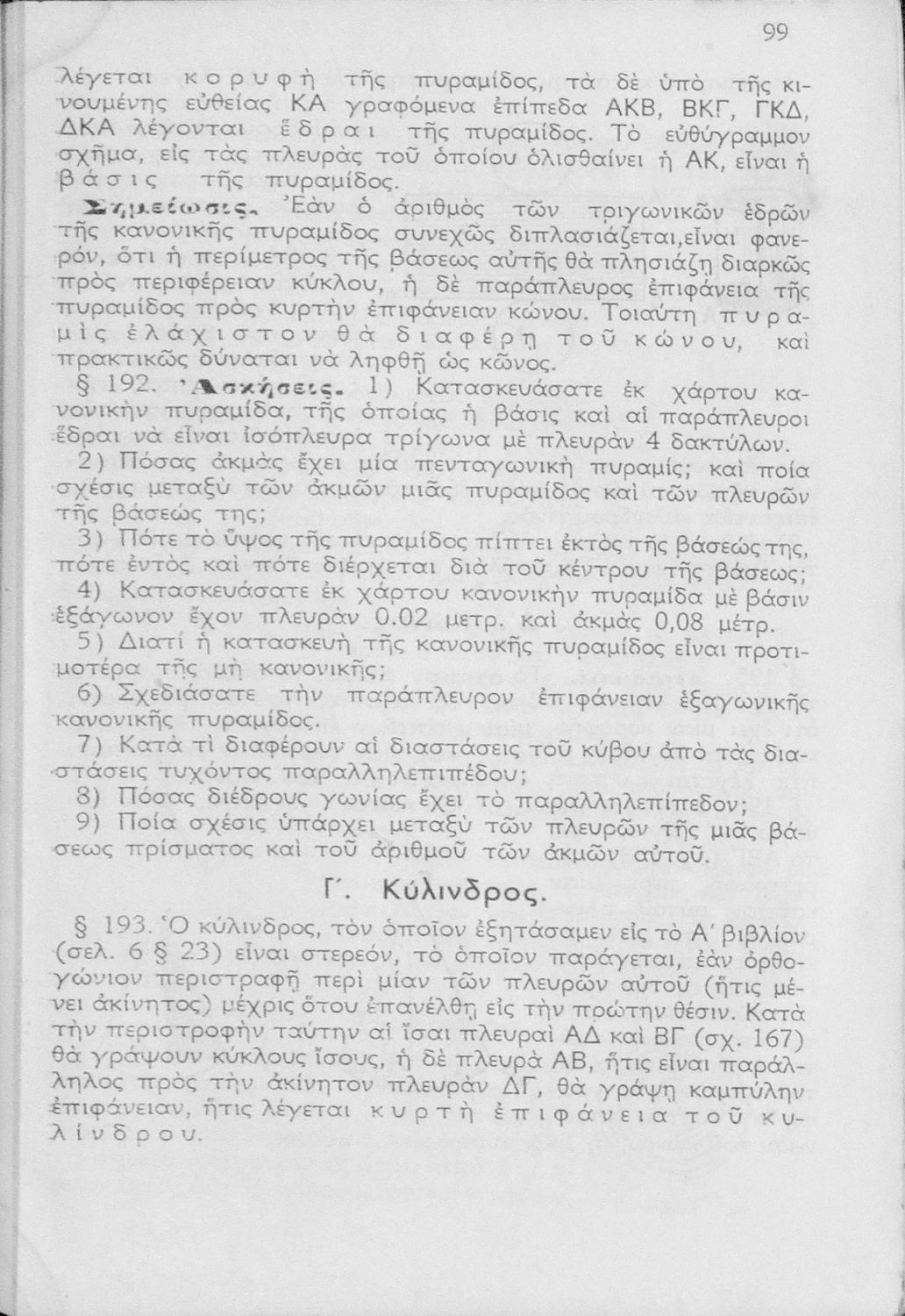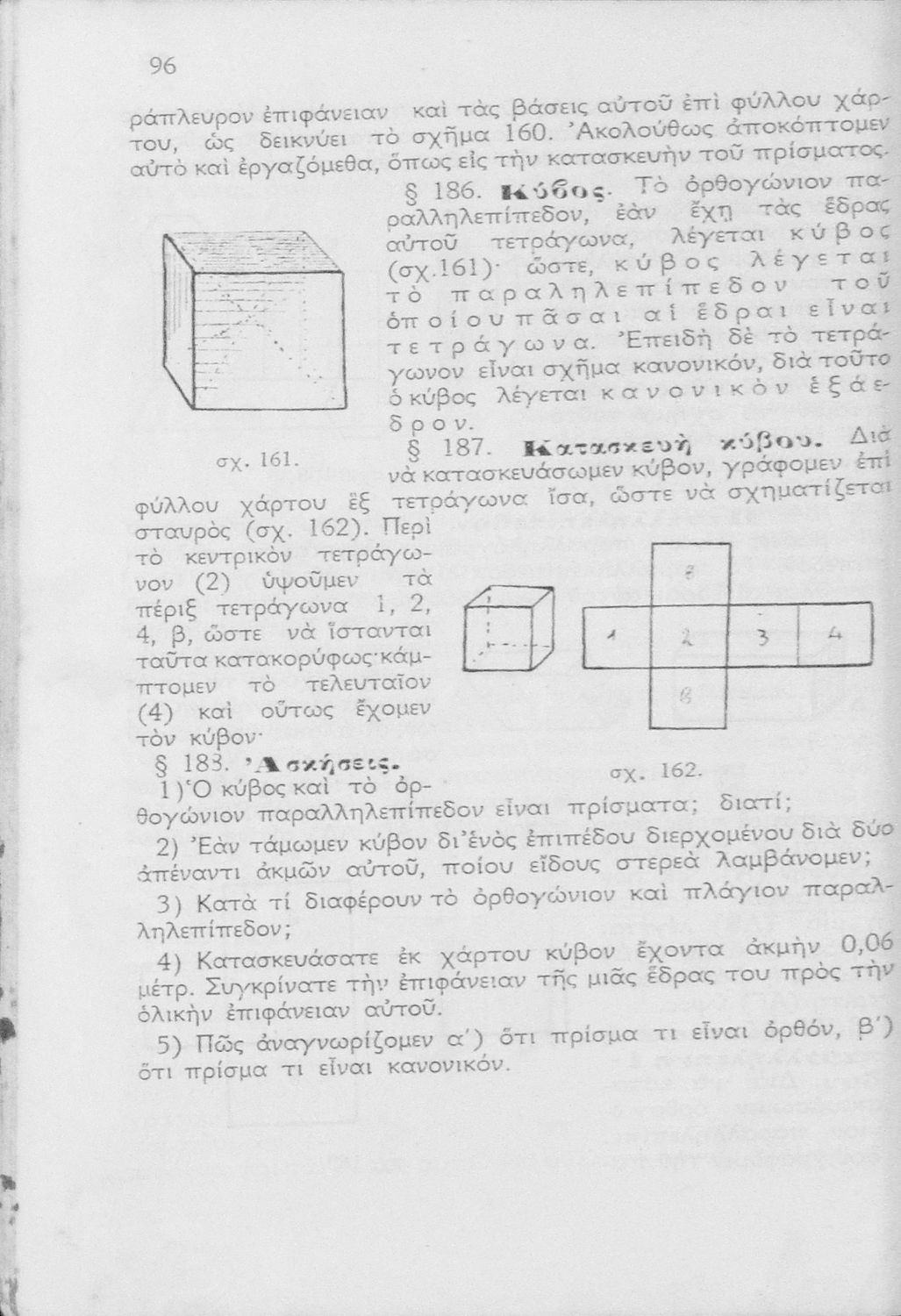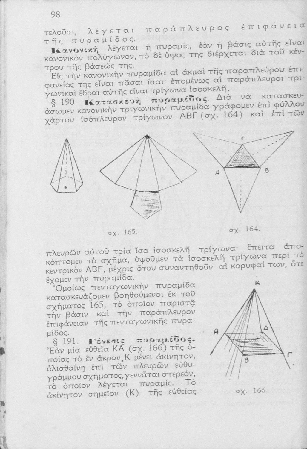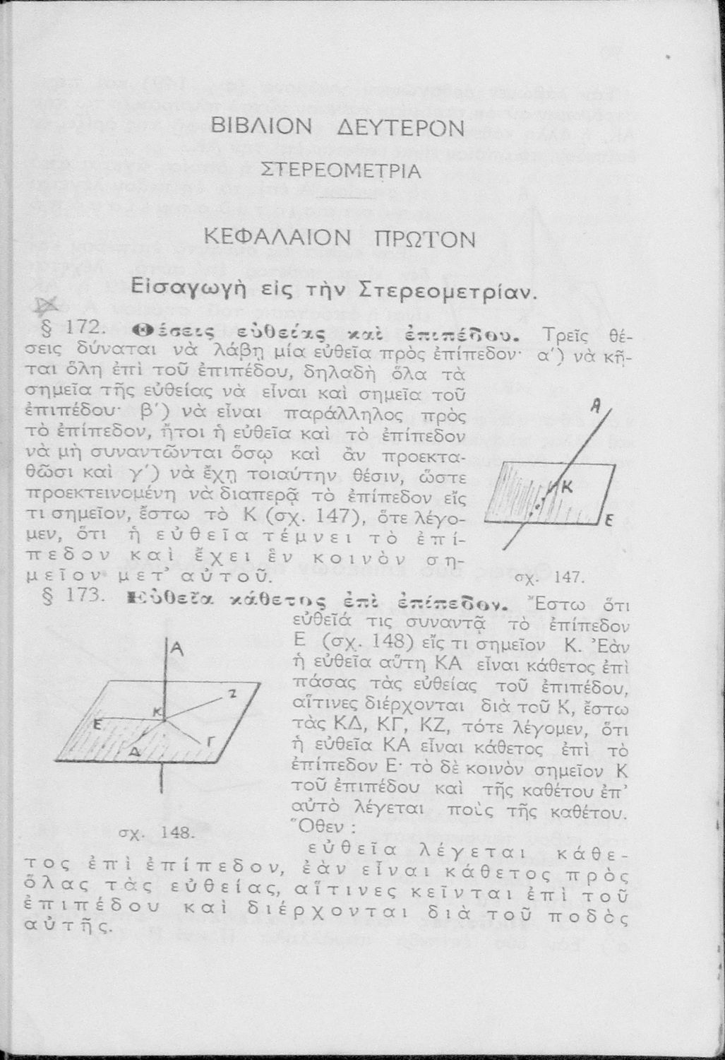 Σχολικό εγχειρίδιο Γεωμετρίας για την Α΄, Β΄ και Γ΄ τάξη των Ελληνικών και Αστικών Σχολείων και Παρθεναγωγείων που είναι χωρισμένο σε Επιπεδομετρία και Στερεομετρία και περιλαμβάνει θεωρία και ασκήσεις.