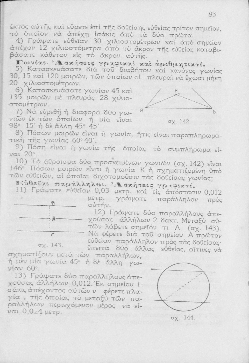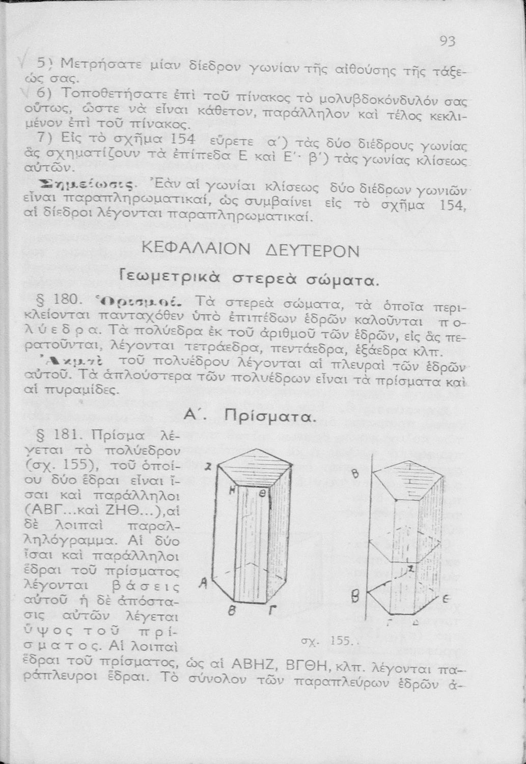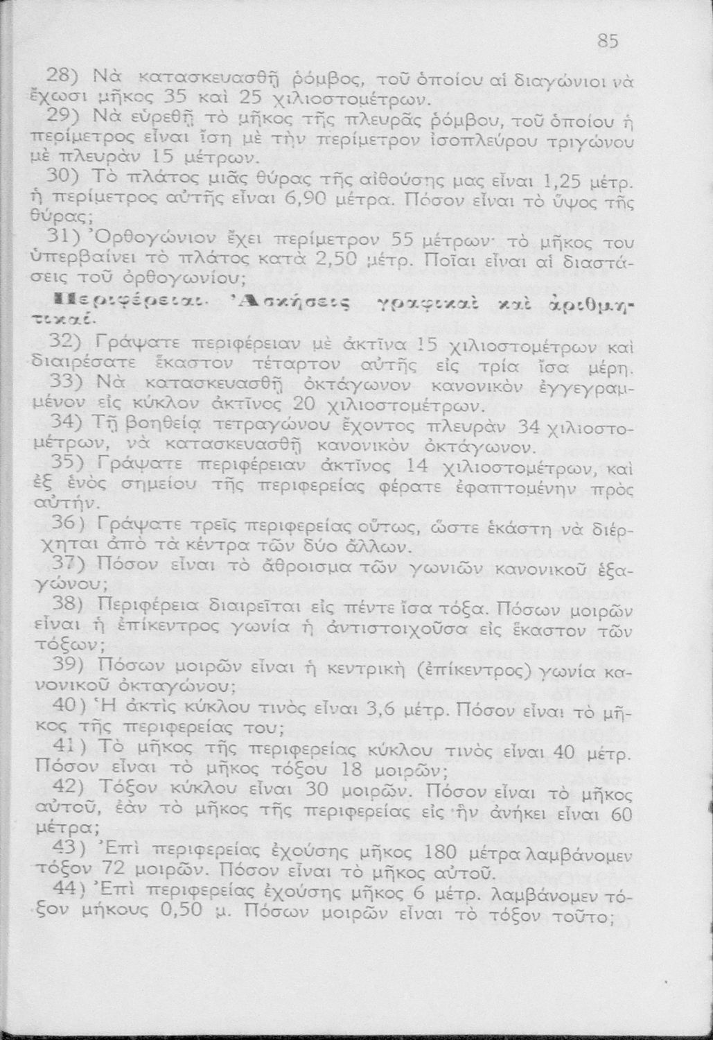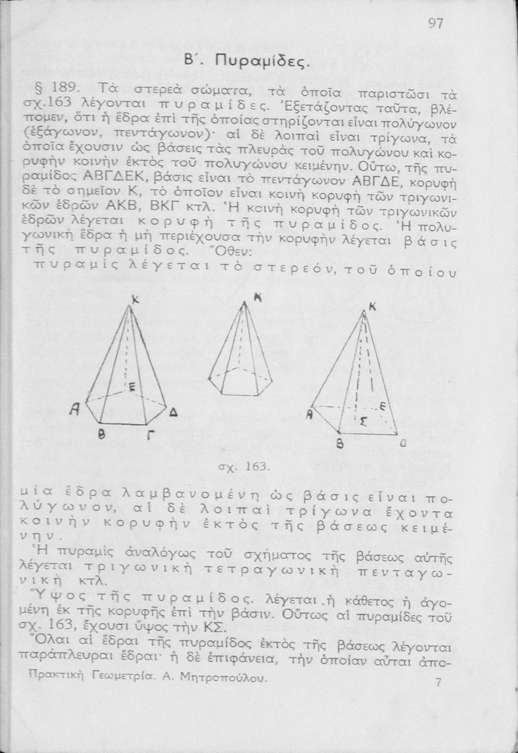 Σχολικό εγχειρίδιο Γεωμετρίας για την Α΄, Β΄ και Γ΄ τάξη των Ελληνικών και Αστικών Σχολείων και Παρθεναγωγείων που είναι χωρισμένο σε Επιπεδομετρία και Στερεομετρία και περιλαμβάνει θεωρία και ασκήσεις.