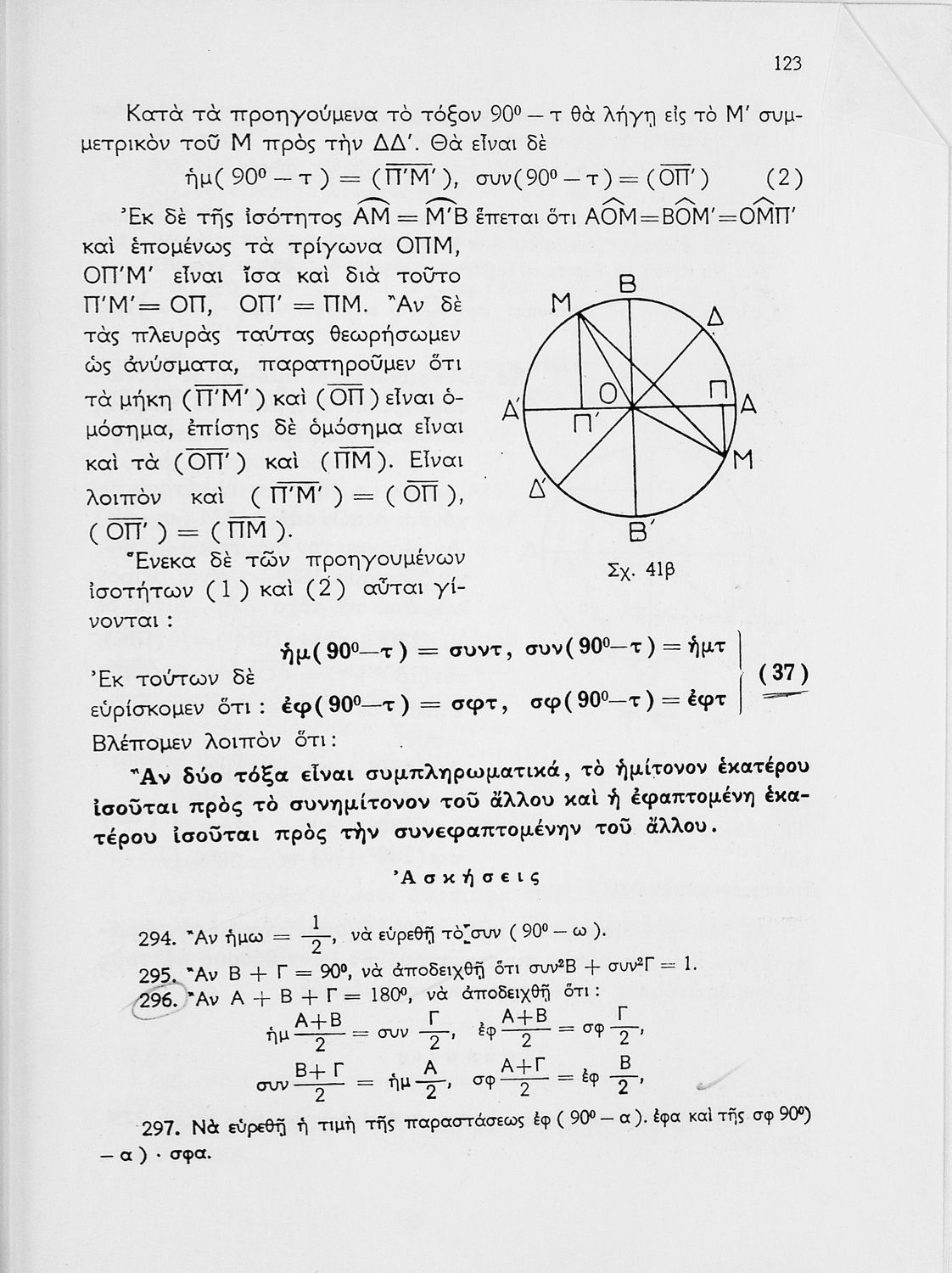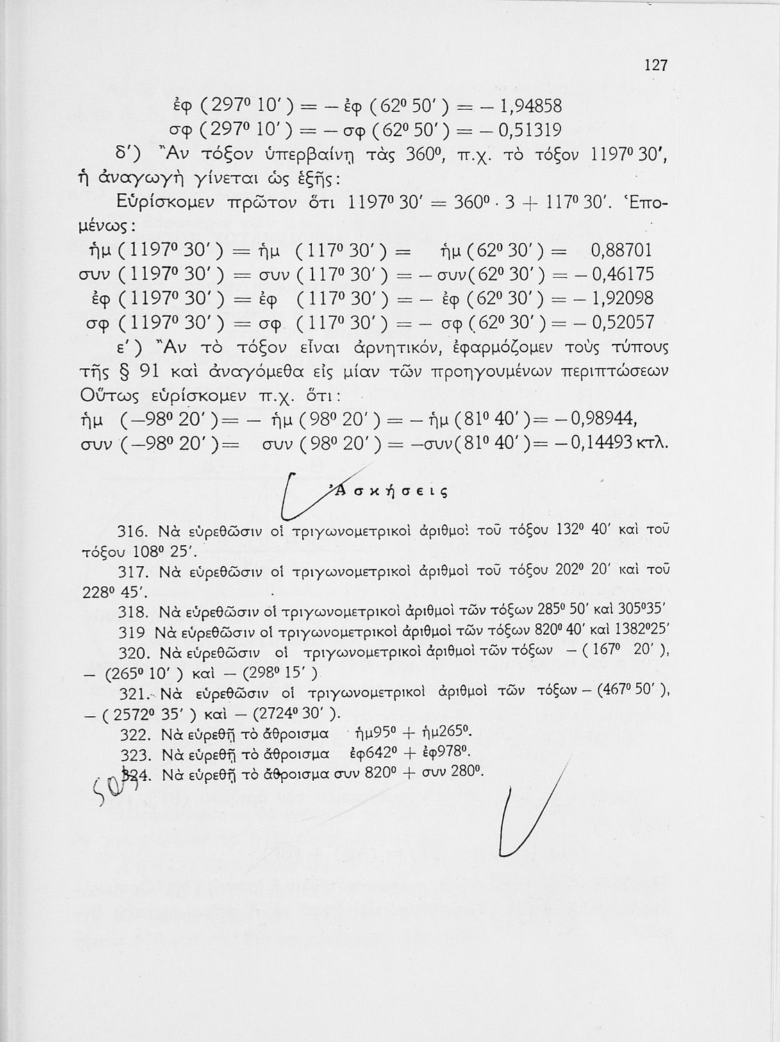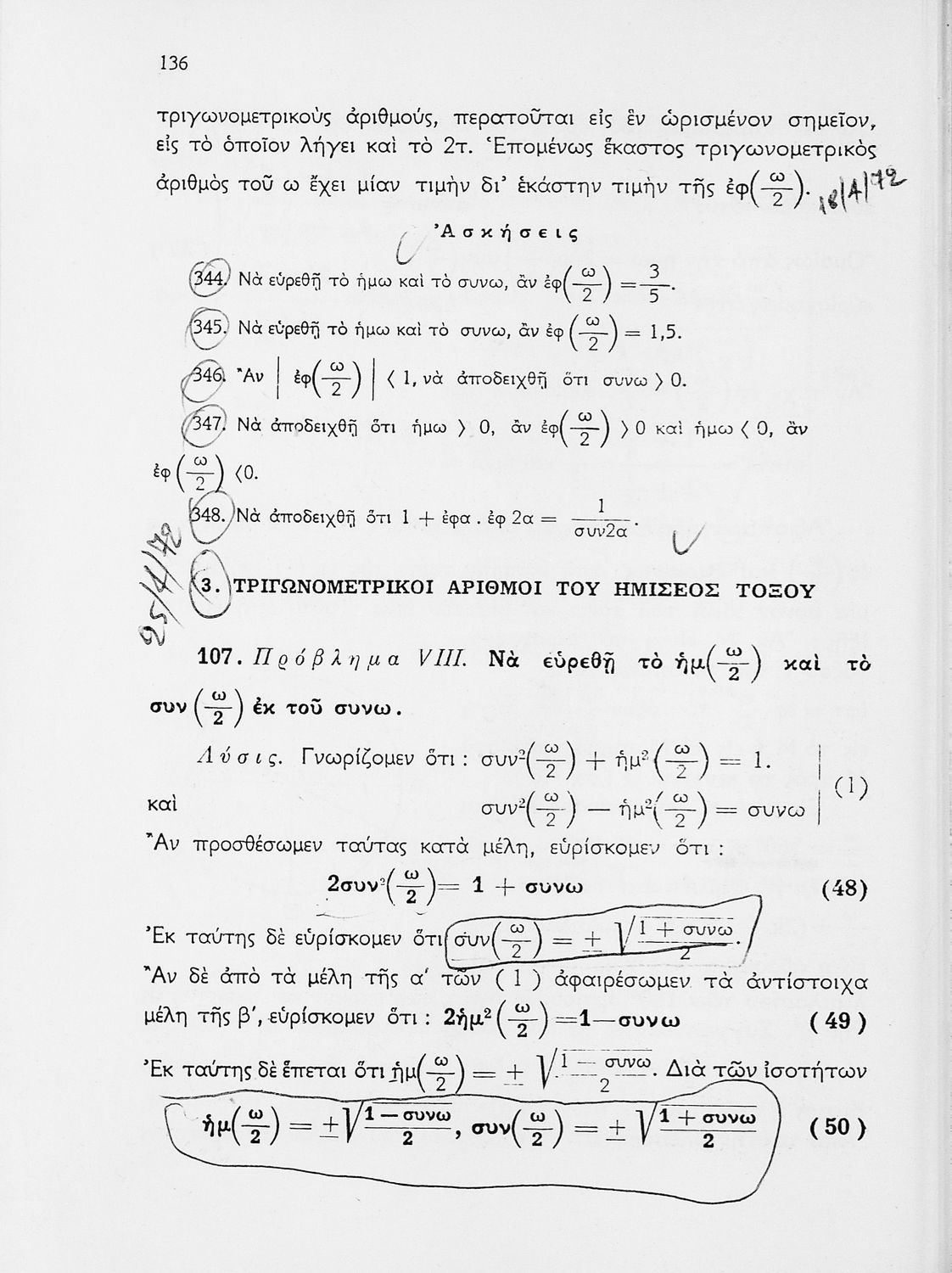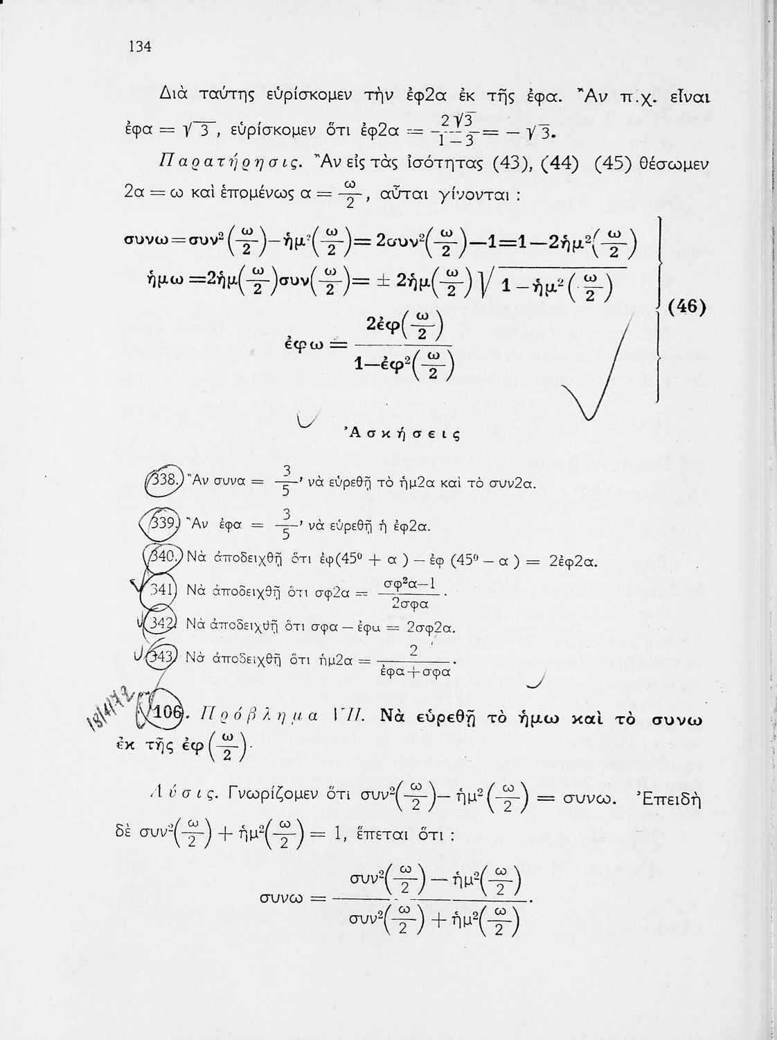 Σχολικό εγχειρίδιο Τριγωνομετρίας για τις Δ΄, Ε΄ και ΣΤ΄ Γυμνασίου που περιλαμβάνει θεωρία και ασκήσεις. Φέρει το σύμβολο της δικτατορίας.