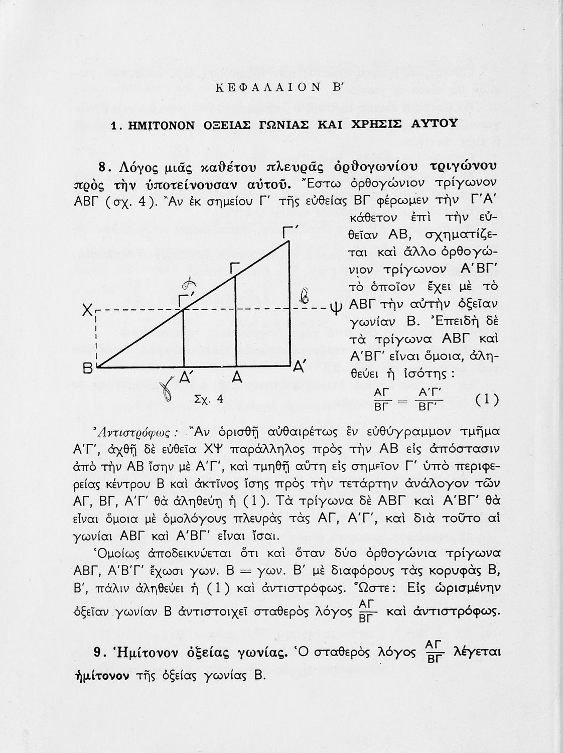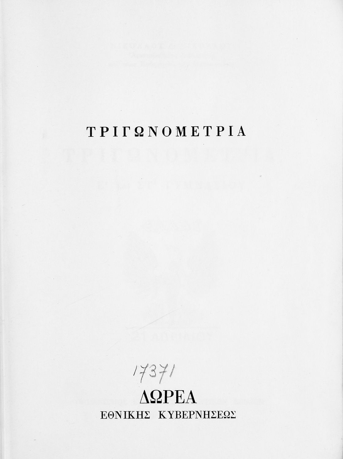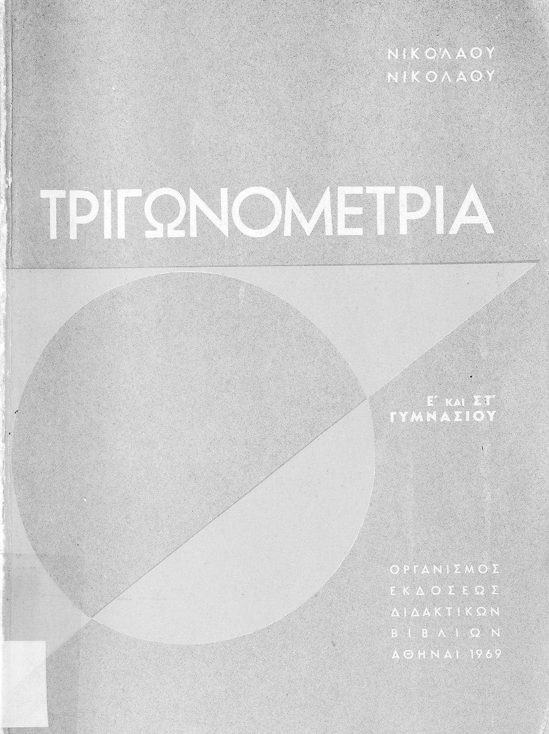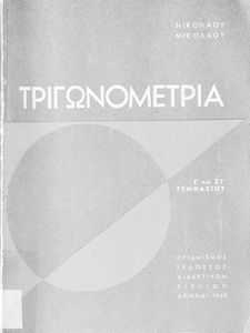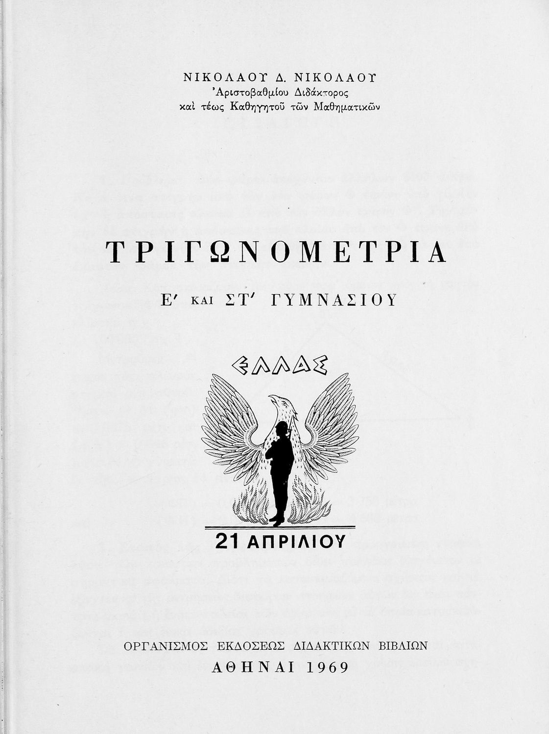 Σχολικό εγχειρίδιο Τριγωνομετρίας για τις Δ΄, Ε΄ και ΣΤ΄ Γυμνασίου που περιλαμβάνει θεωρία και ασκήσεις. Φέρει το σύμβολο της δικτατορίας.