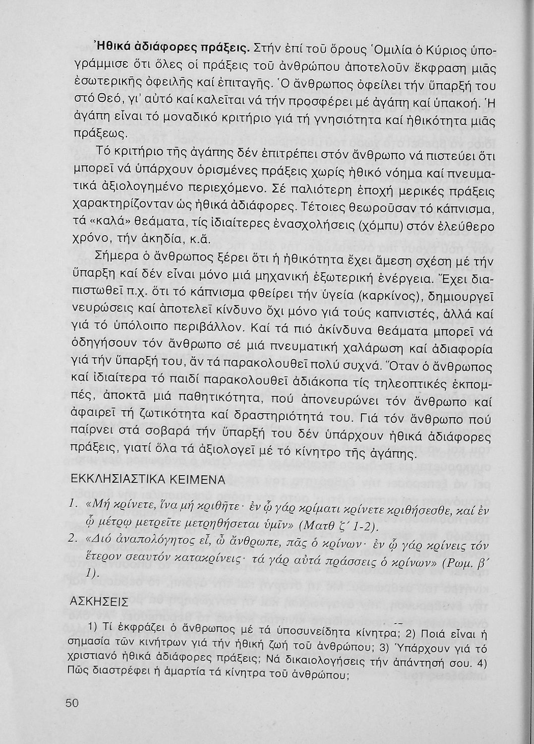 Σχολικό εγχειρίδιο Θρησκευτικών Γ΄ Λυκείου που πραγματεύεται ζητήματα Χριστιανικής ηθικής από φιλοσοφική σκοπιά.
