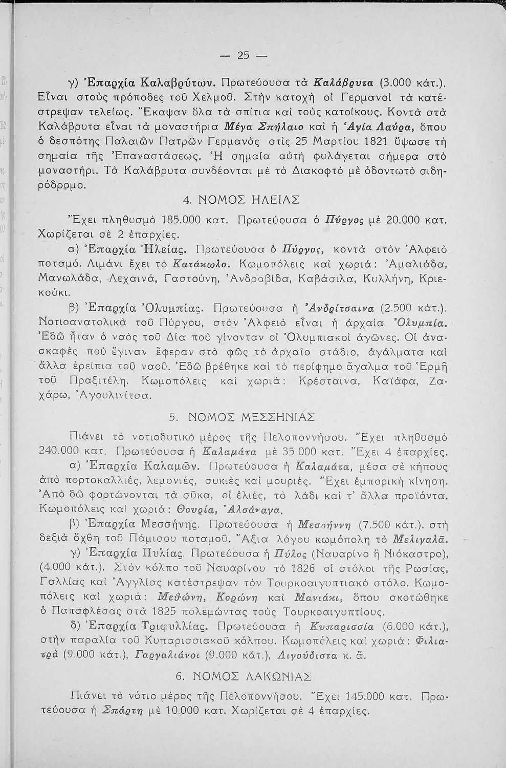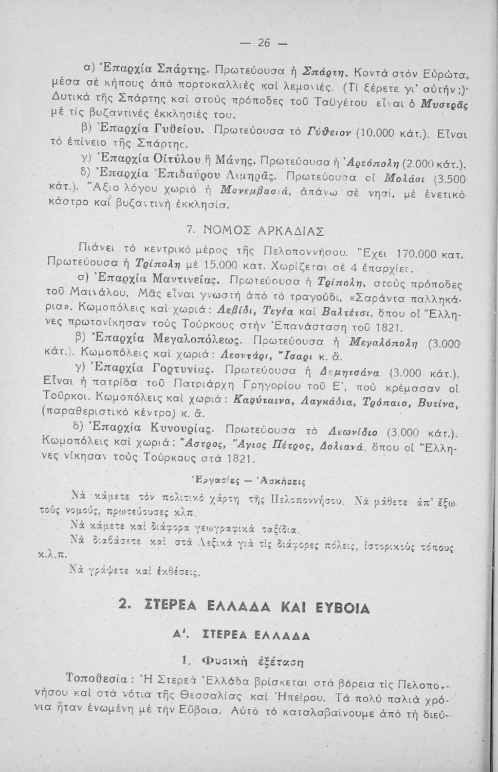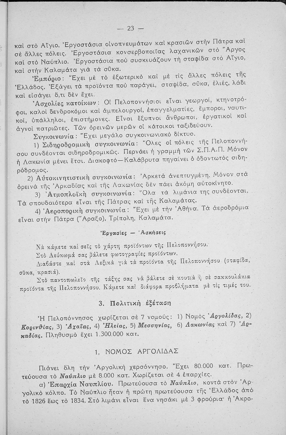 Σχολικό εγχειρίδιο Γεωγραφίας για τη Γ΄, Δ΄ Δημοτικού. Μελετά την Ελλάδα ανά γεωγραφικό νομό με πληροφορίες από το χάρτη της περιοχής και στοιχεία της ιστορίας και της οικονομικής ζωής.