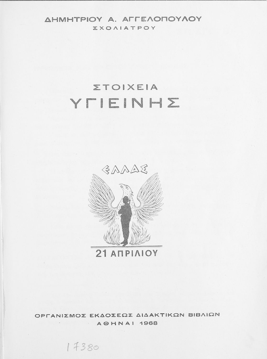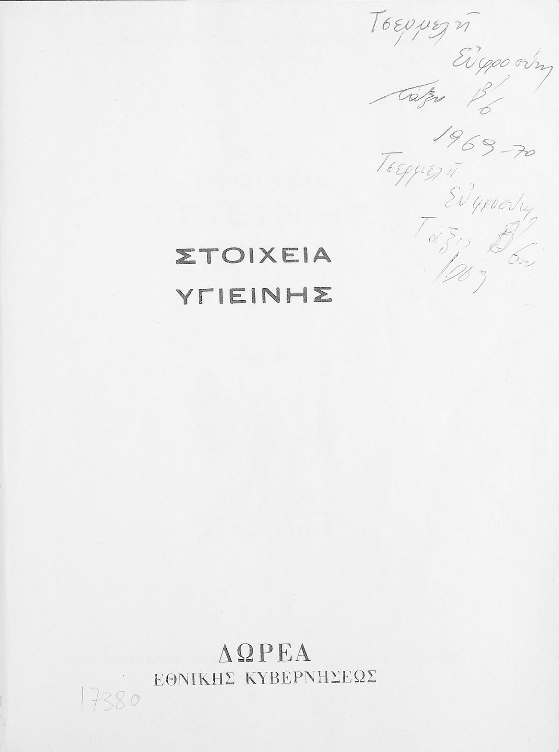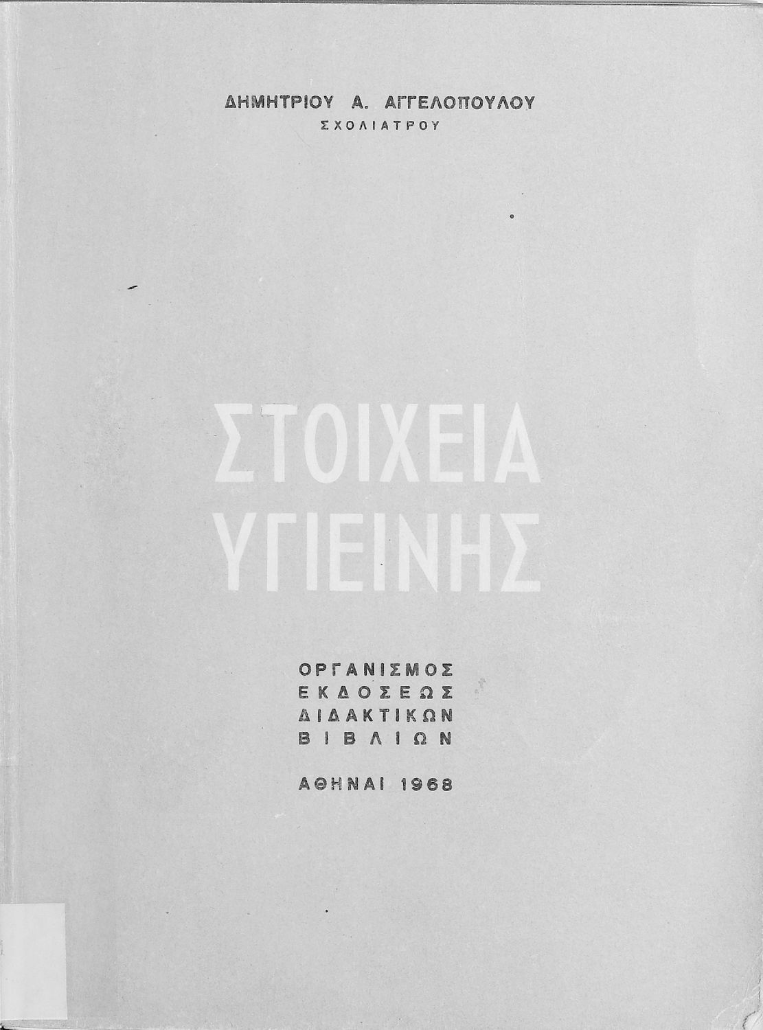 Μάθημα: Υγιεινή Γλώσσα: Απλή καθαρεύουσα Παρουσίαση περιεχομένου: Σχολικό εγχειρίδιο Υγιεινής που εστιάζει στους φυσικούς και βιολογικούς παράγοντες του περιβάλλοντος και τις πρώτες βοήθειες. Φέρει το σύμβολο της δικτατορίας. |
