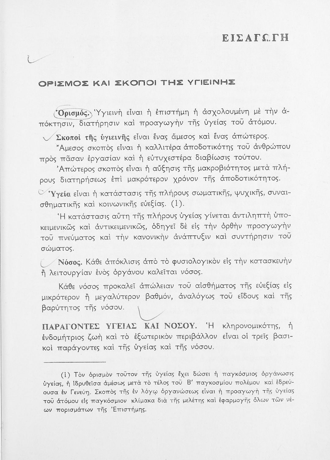 Σχολικό εγχειρίδιο Υγιεινής που εστιάζει στους φυσικούς και βιολογικούς παράγοντες του περιβάλλοντος και τις πρώτες βοήθειες. Φέρει το σύμβολο της δικτατορίας.