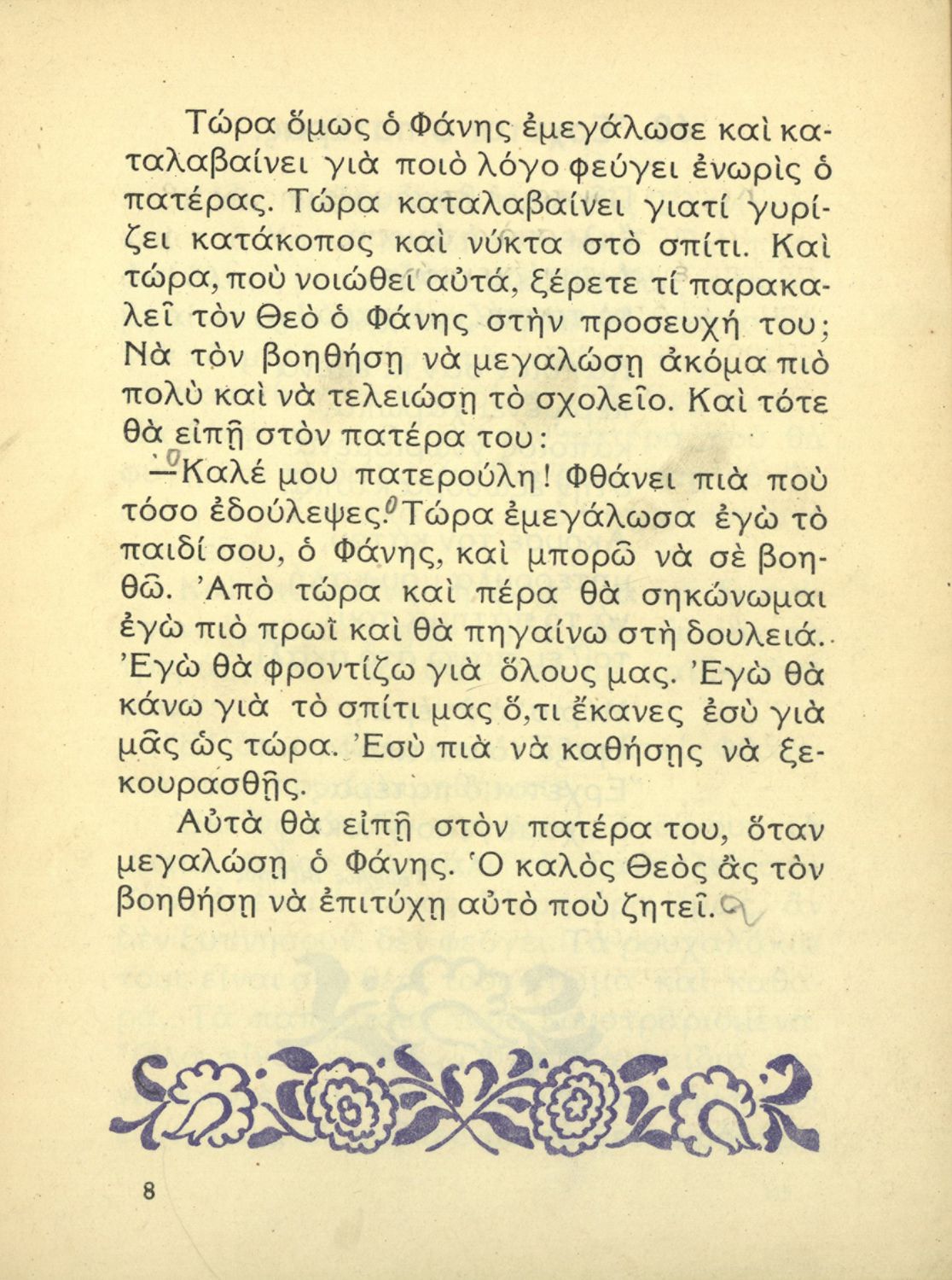 Αναγνωστικό Β' Δημοτικού που είναι χωρισμένο σύμφωνα με τις εποχές του χρόνου και περιλαμβάνει κείμενα ηθοποιητικού περιεχομένου εμπνευσμένα από τη θρησκευτική, εθνική, κοινωνική και οικογενειακή ζωή.