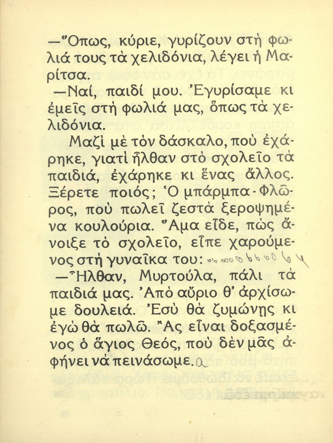 Αναγνωστικό Β' Δημοτικού που είναι χωρισμένο σύμφωνα με τις εποχές του χρόνου και περιλαμβάνει κείμενα ηθοποιητικού περιεχομένου εμπνευσμένα από τη θρησκευτική, εθνική, κοινωνική και οικογενειακή ζωή.