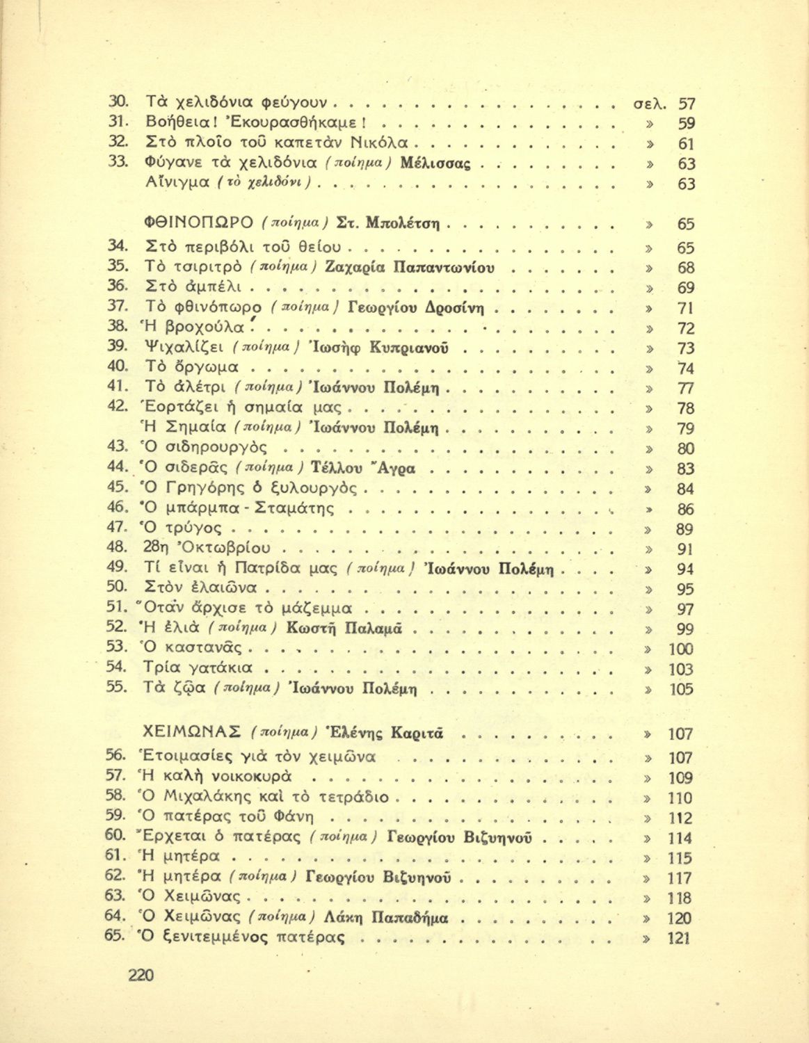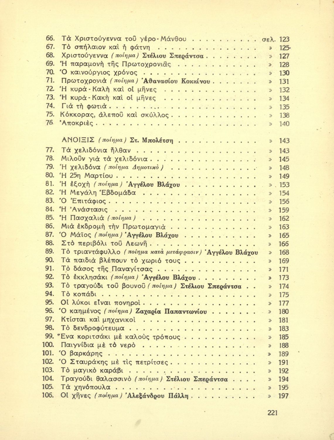 Αναγνωστικό Β' Δημοτικού που είναι χωρισμένο σύμφωνα με τις εποχές του χρόνου και περιλαμβάνει κείμενα ηθοποιητικού περιεχομένου εμπνευσμένα από τη θρησκευτική, εθνική, κοινωνική και οικογενειακή ζωή. Φέρει το