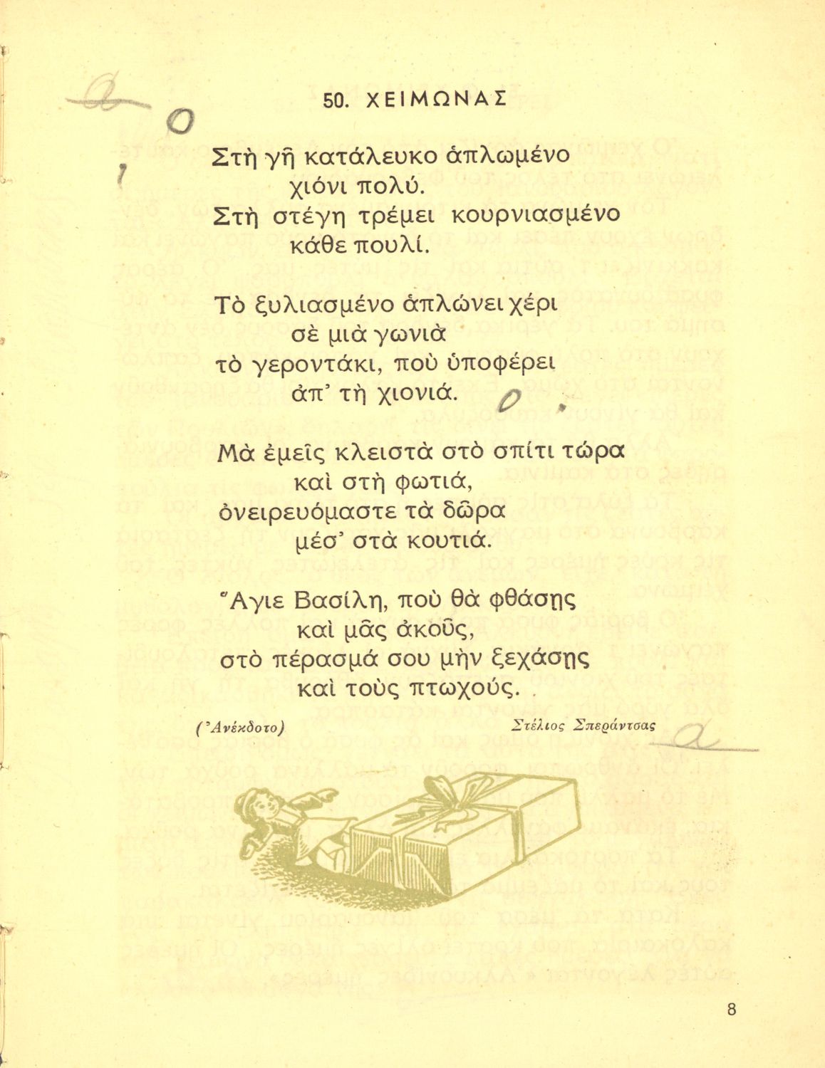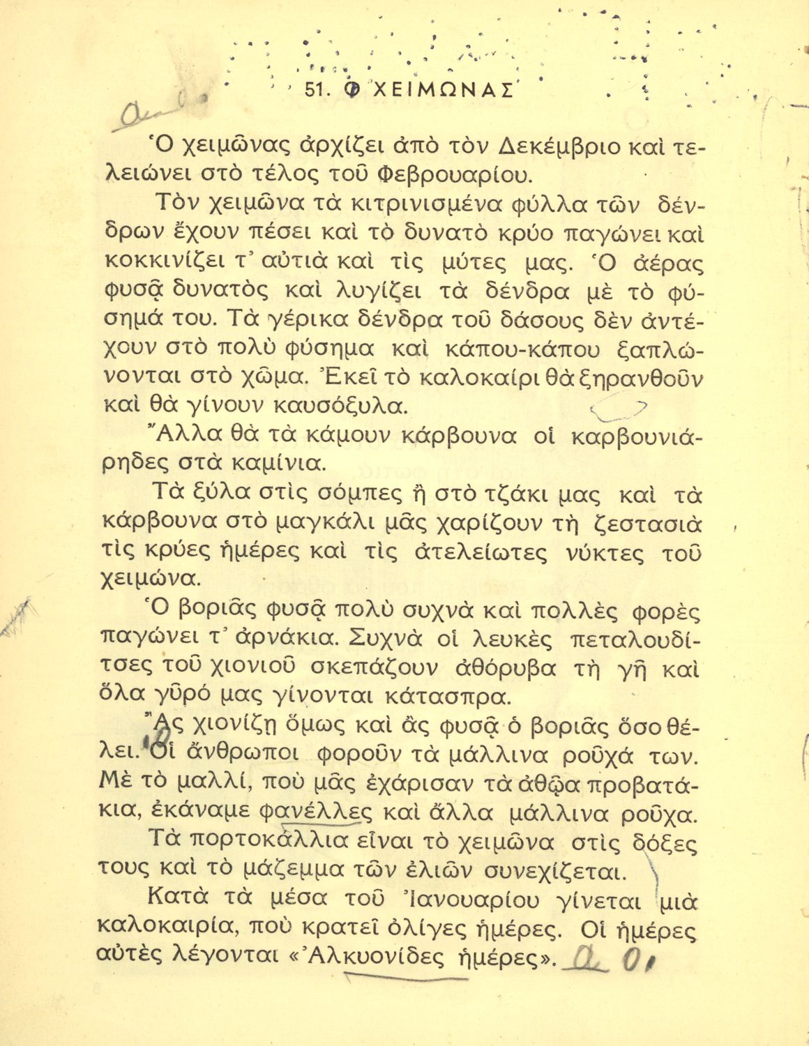 Αναγνωστικό Γ' Δημοτικού που είναι χωρισμένο σύμφωνα με τις εποχές του χρόνου και περιλαμβάνει ποιήματα και πεζά εμπνευσμένα από τη ζωή στην ύπαιθρο, την εθνική, οικογενειακή και κοινωνική ζωή, τη θρησκευτική παράδοση, τις ασχολίες των ανθρώπων, και την ελληνική φύση.