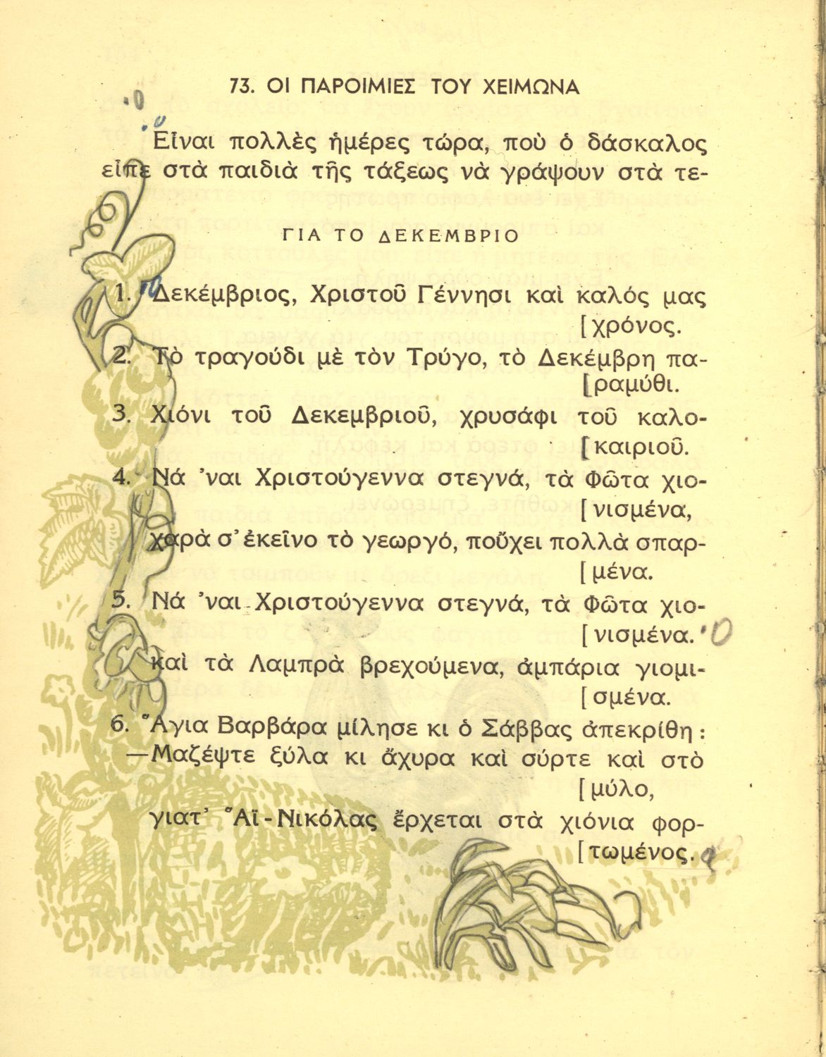 Αναγνωστικό Γ' Δημοτικού που είναι χωρισμένο σύμφωνα με τις εποχές του χρόνου και περιλαμβάνει ποιήματα και πεζά εμπνευσμένα από τη ζωή στην ύπαιθρο, την εθνική, οικογενειακή και κοινωνική ζωή, τη θρησκευτική παράδοση, τις ασχολίες των ανθρώπων, και την ελληνική φύση.