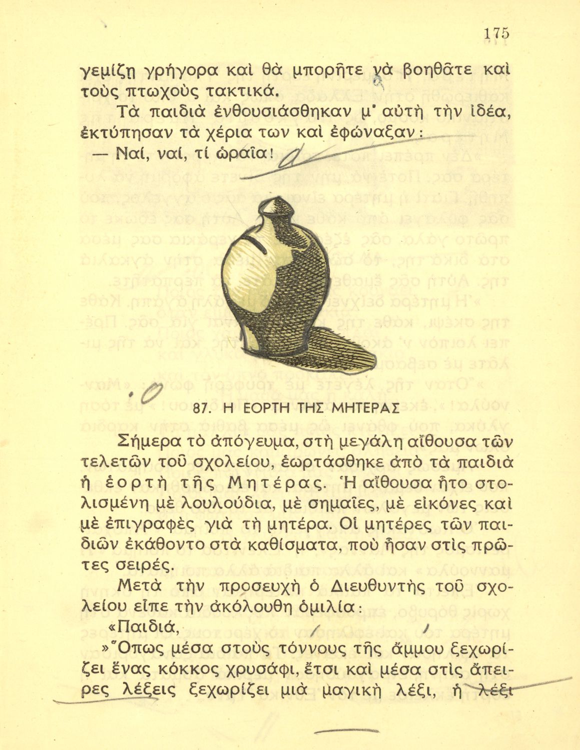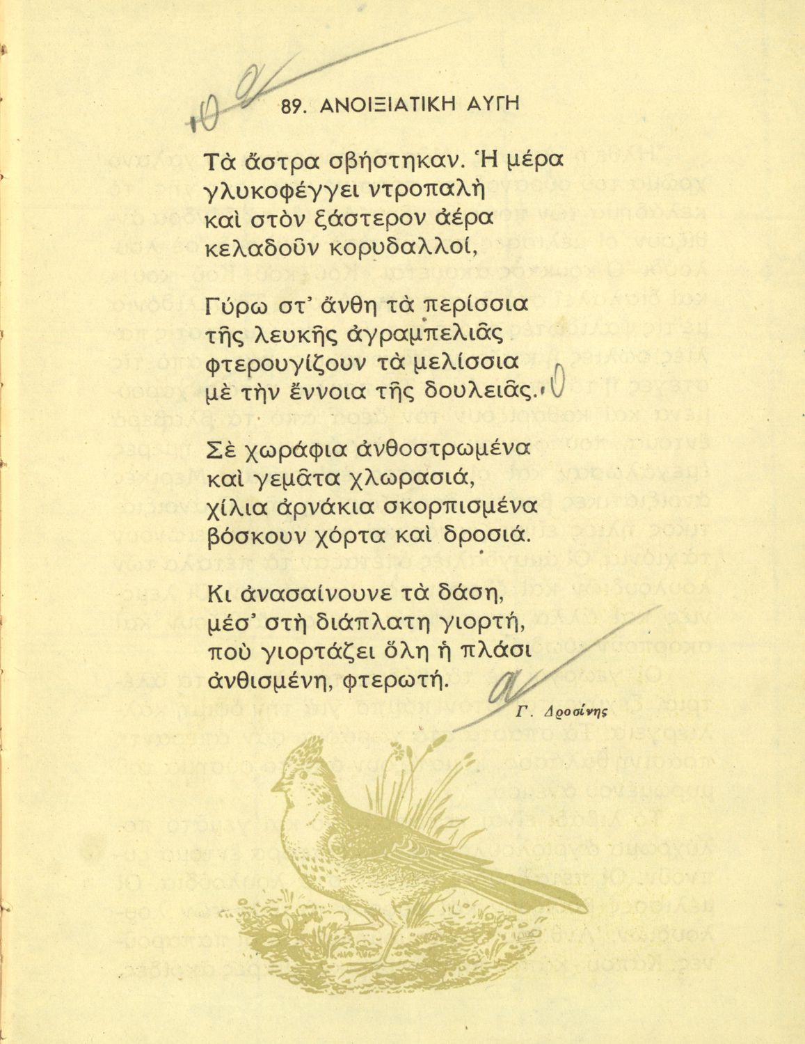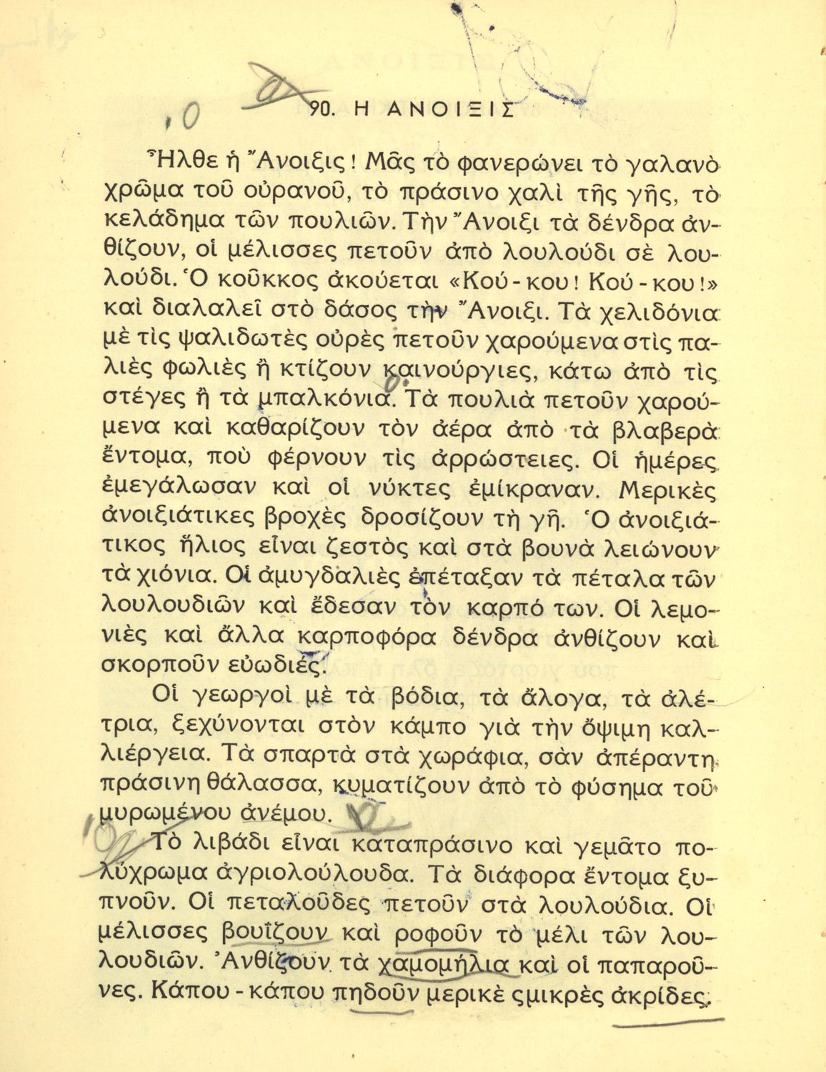 Αναγνωστικό Γ' Δημοτικού που είναι χωρισμένο σύμφωνα με τις εποχές του χρόνου και περιλαμβάνει ποιήματα και πεζά εμπνευσμένα από τη ζωή στην ύπαιθρο, την εθνική, οικογενειακή και κοινωνική ζωή, τη θρησκευτική παράδοση, τις ασχολίες των ανθρώπων, και την ελληνική φύση.