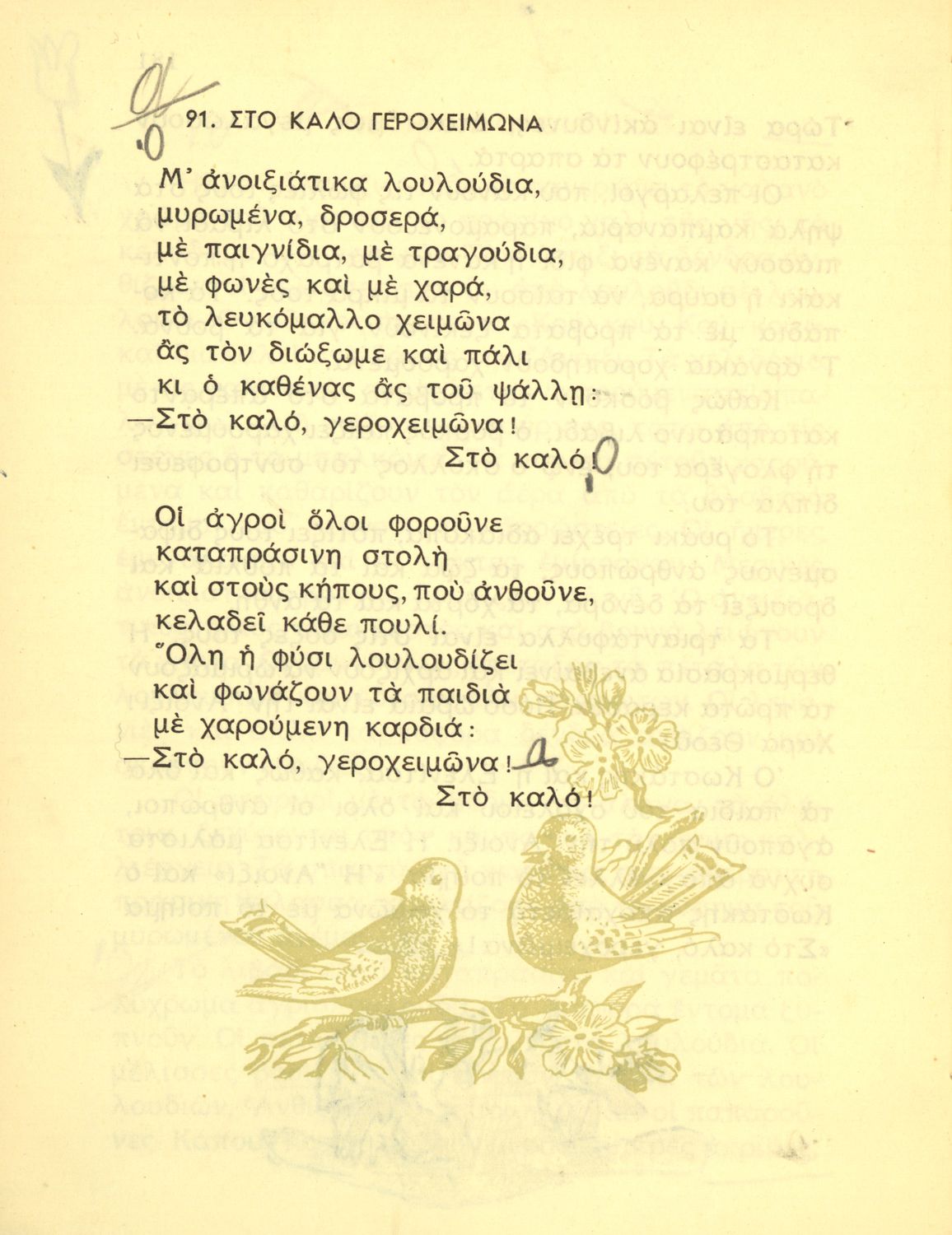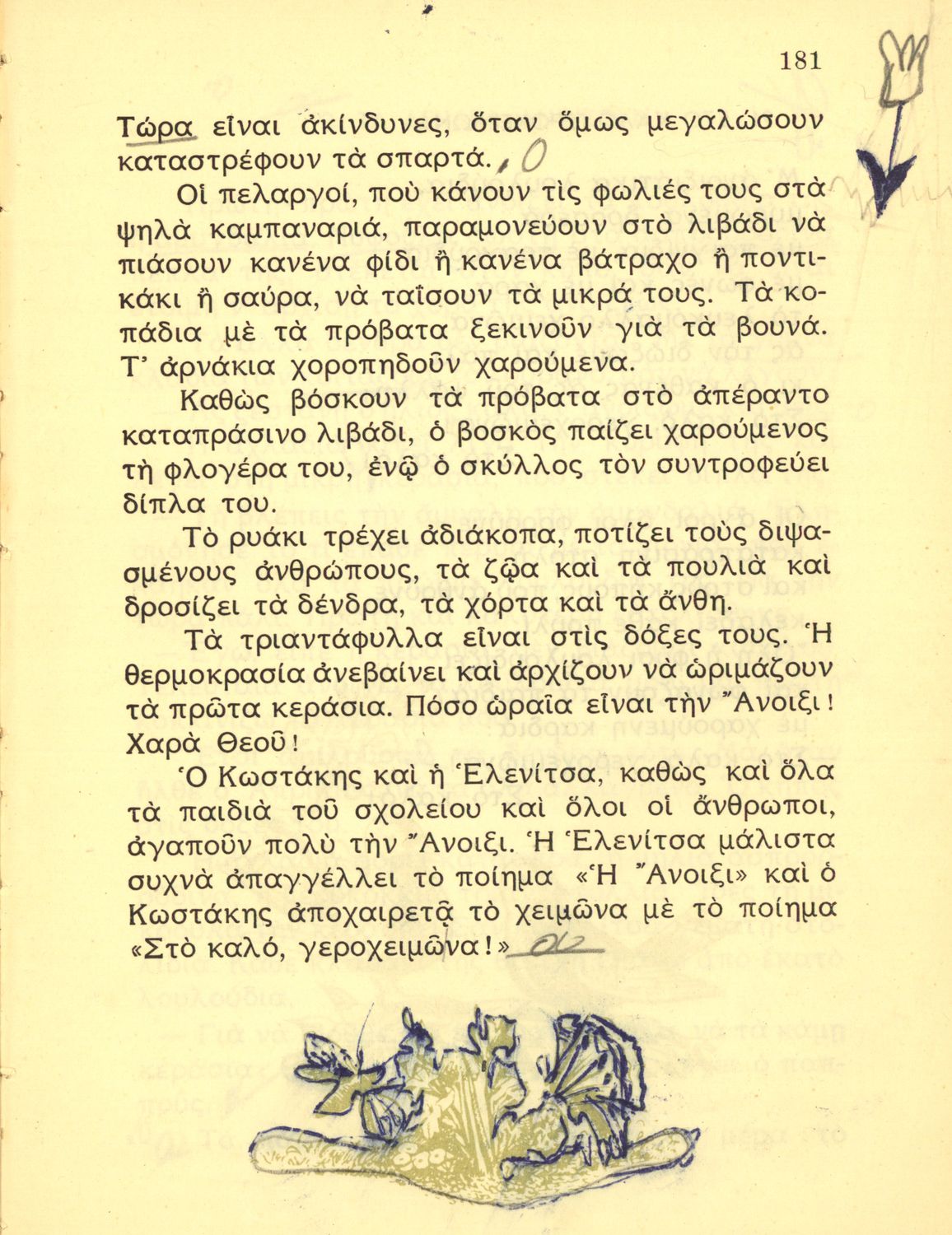 Αναγνωστικό Γ΄ Δημοτικού που περιλαμβάνει ποιήματα και πεζά εμπνευσμένα από την ελληνική φύση, τις ασχολίες των κατοίκων, την σύγχρονη ελληνική ιστορία, την ελληνική μυθολογία και τις θρησκευτικές γιορτές.