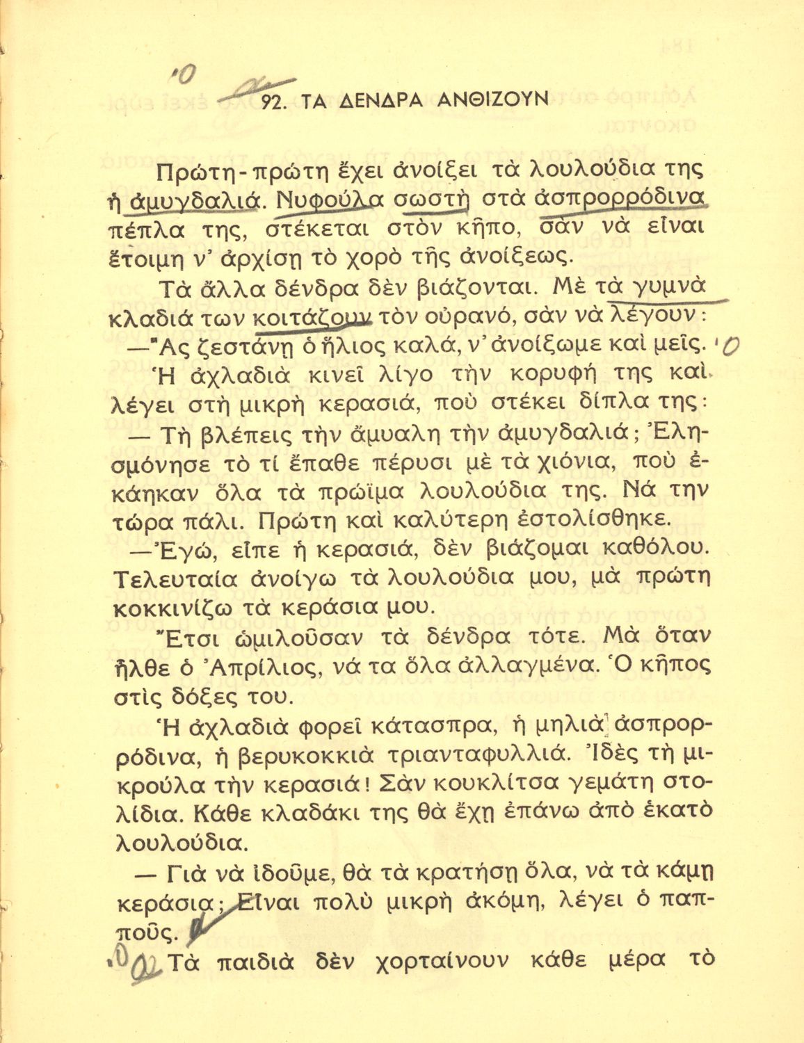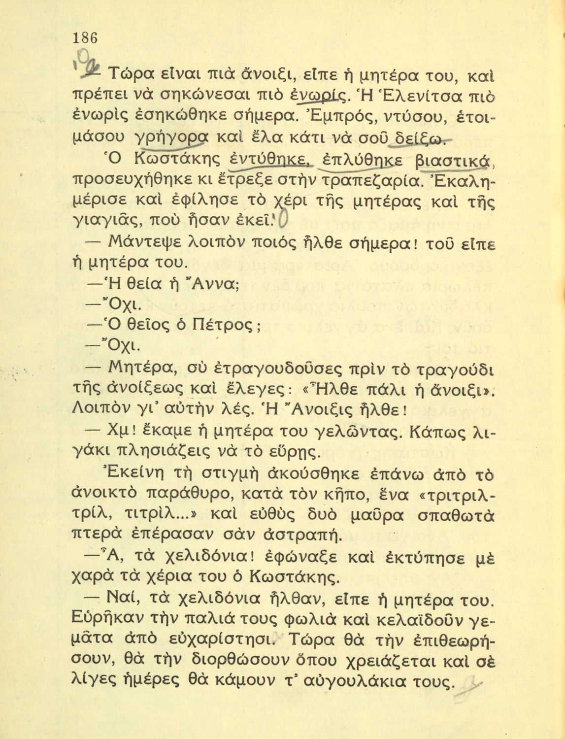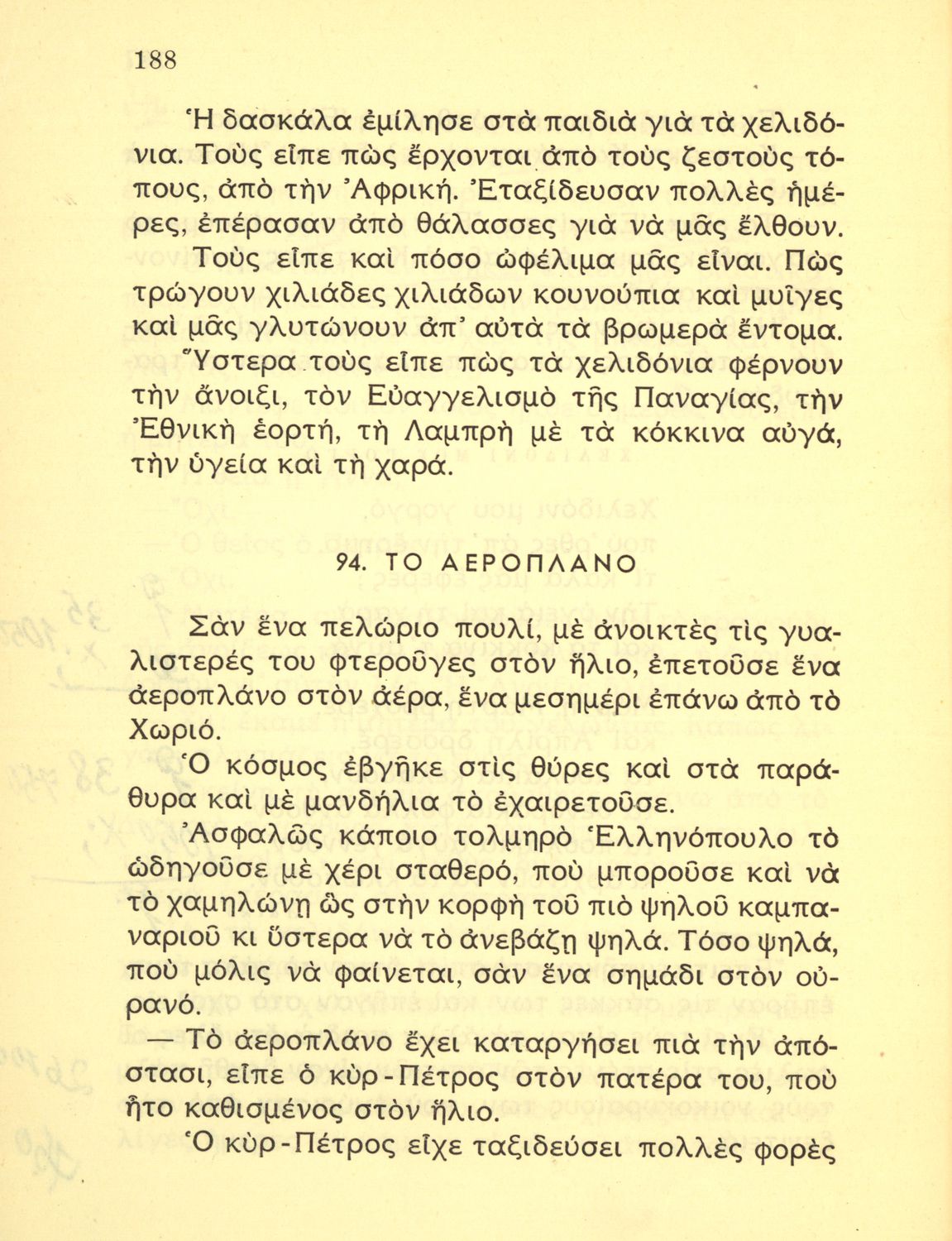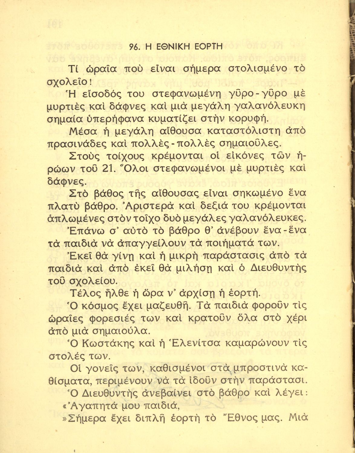 Αναγνωστικό της Γ΄ Δημοτικού που περιλαμβάνει μικρές ιστορίες εθνικιστικού περιεχομένου εμπνευσμένες από την ύπαιθρο, την οικογενειακή και κοινωνική ζωή αλλά και το εθνικό παρελθόν.