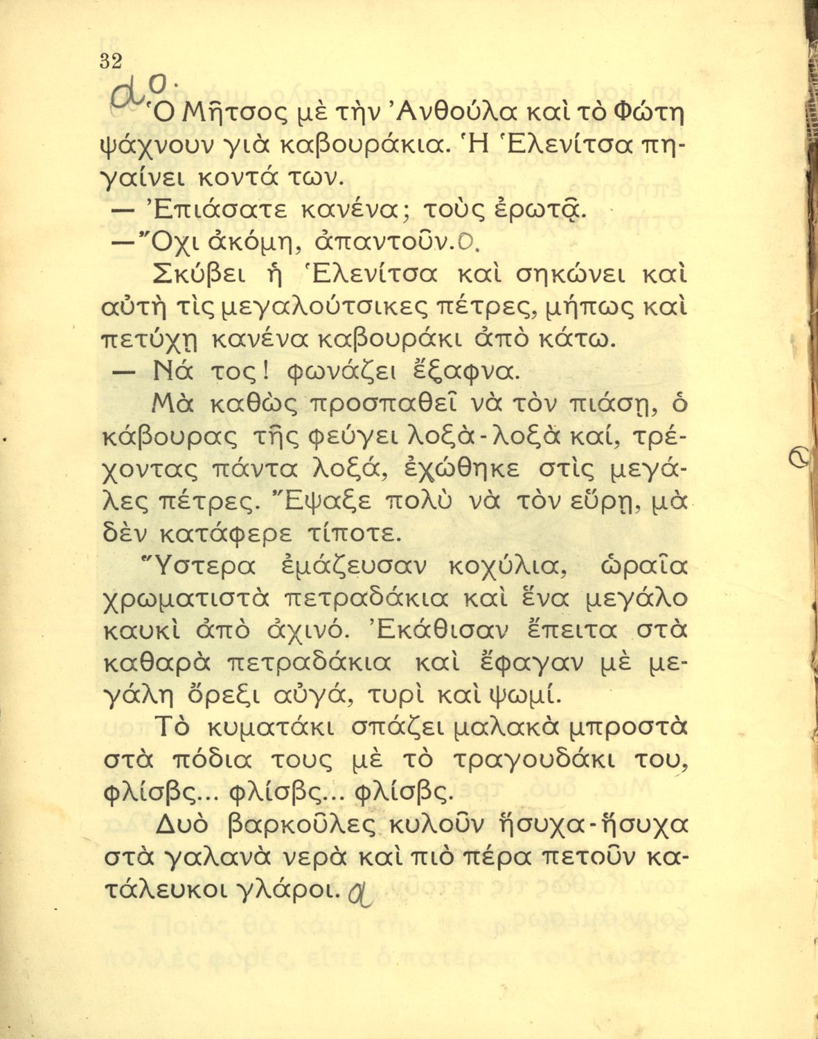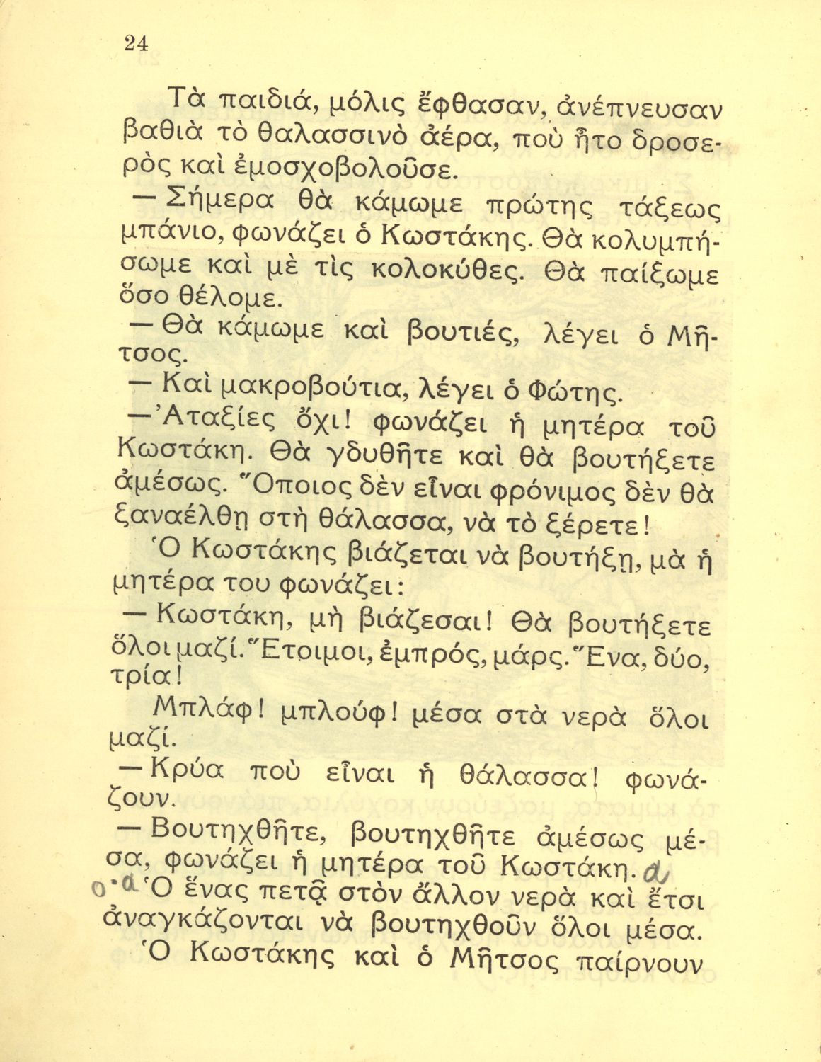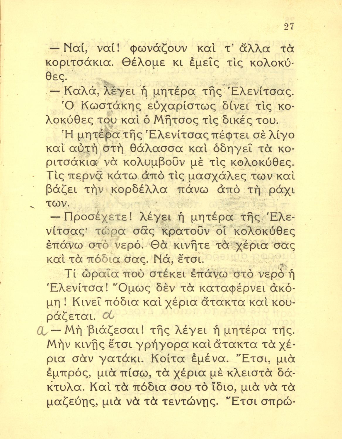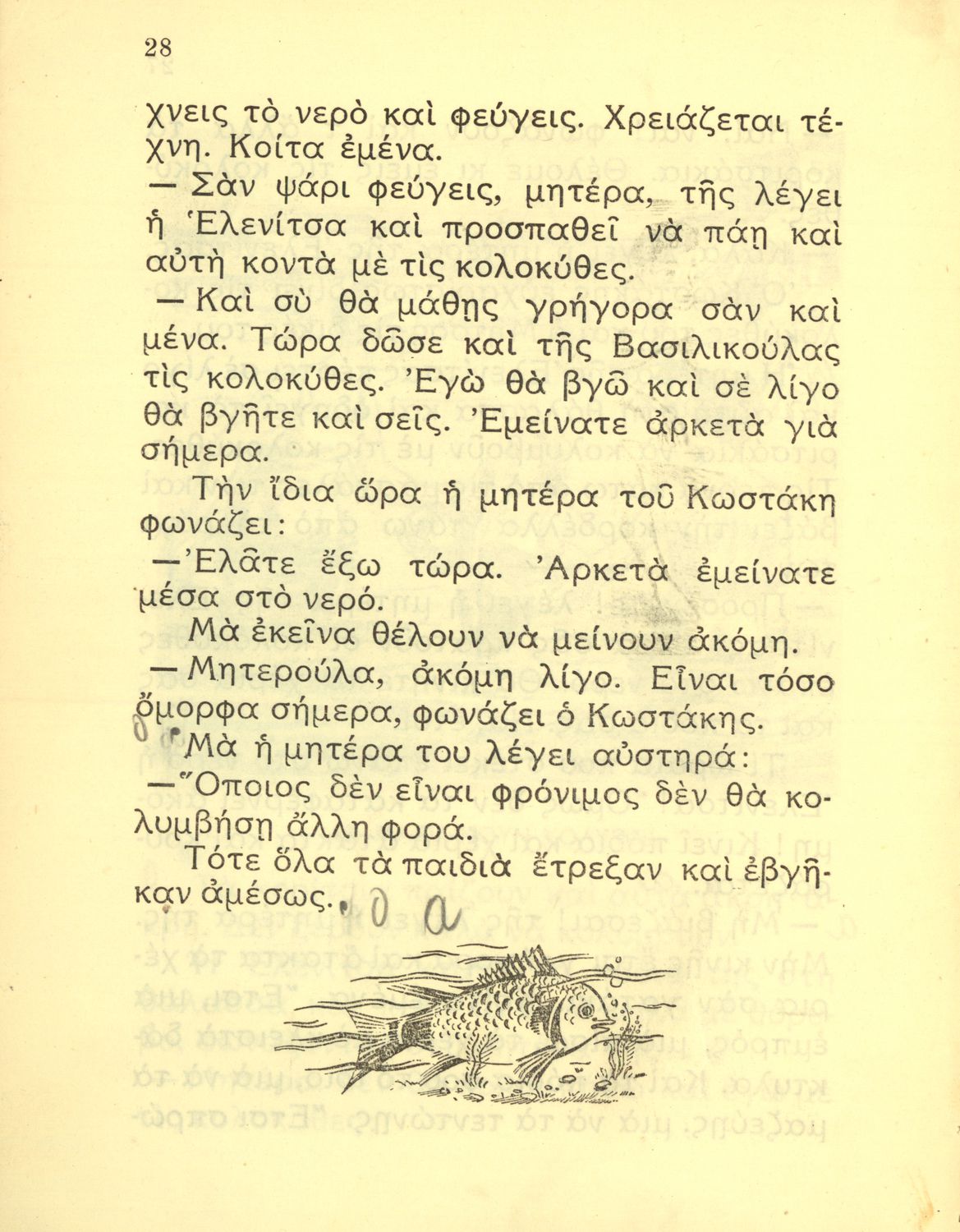 Αναγνωστικό της Γ΄ Δημοτικού που περιλαμβάνει μικρές ιστορίες εθνικιστικού περιεχομένου εμπνευσμένες από την ύπαιθρο, την οικογενειακή και κοινωνική ζωή αλλά και το εθνικό παρελθόν.
