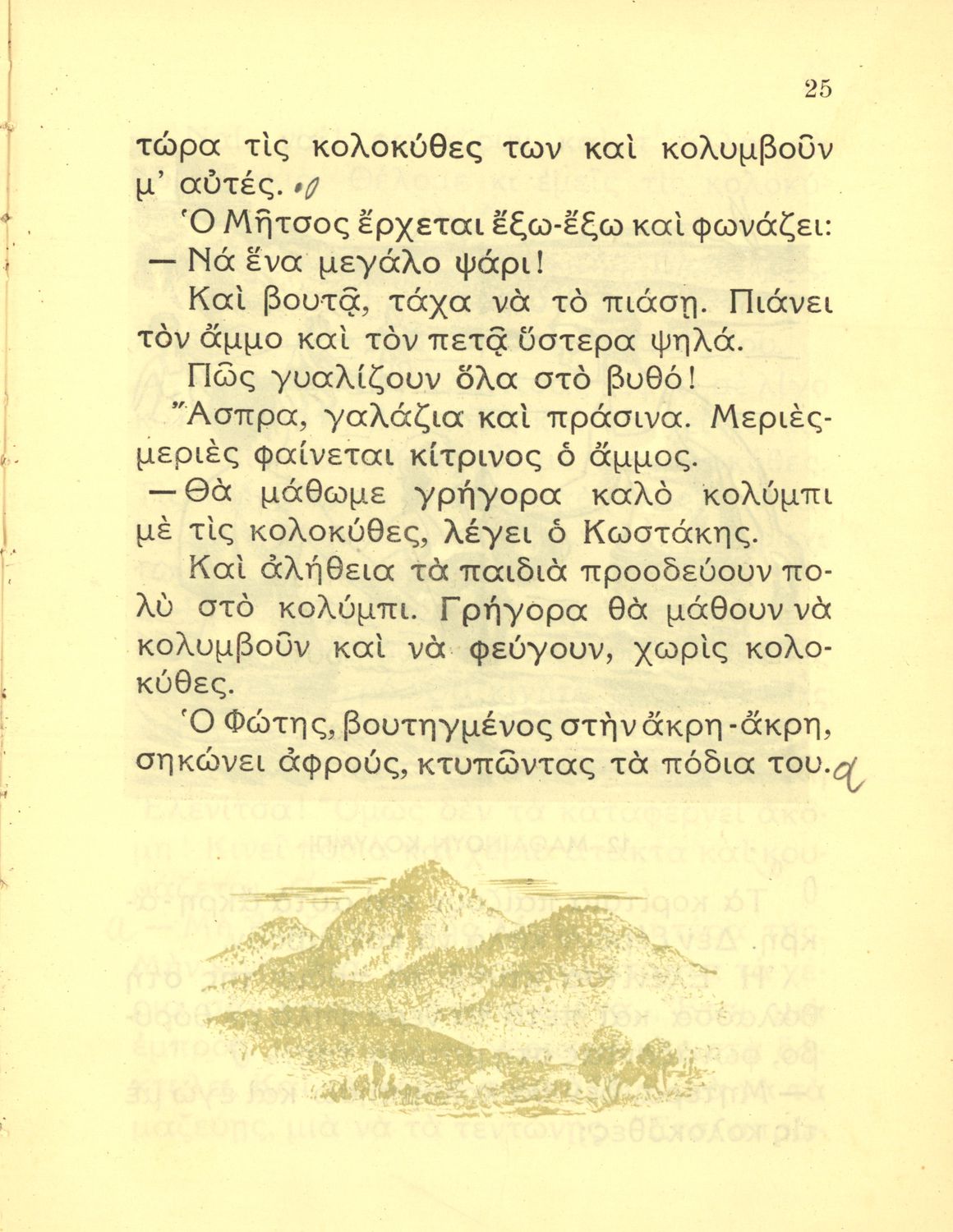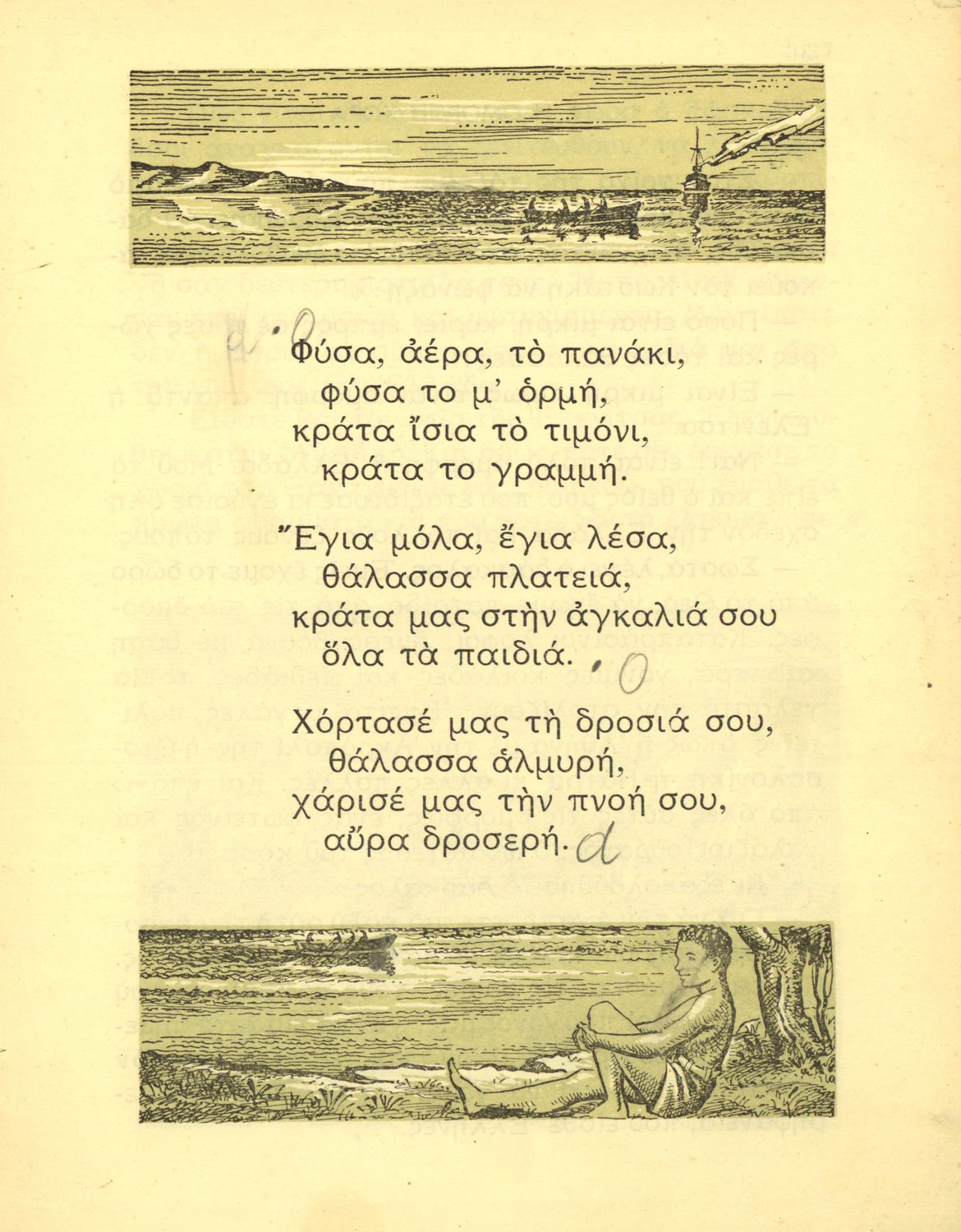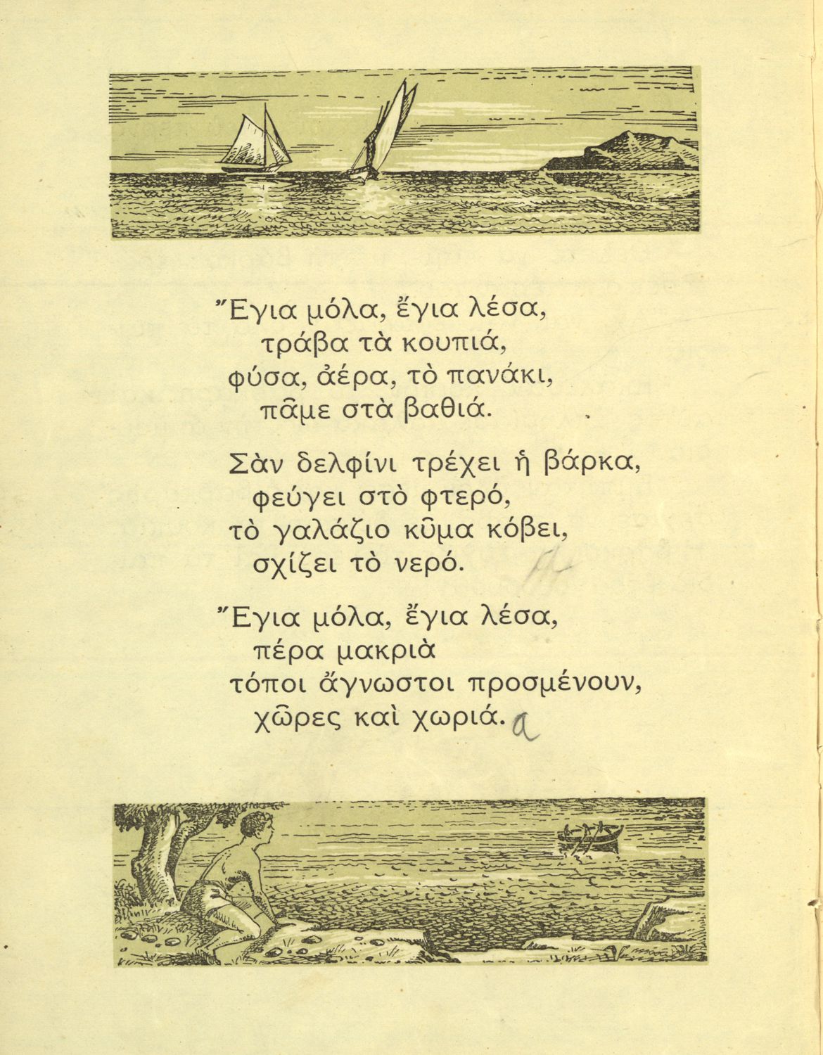 Αναγνωστικό Γ΄ Δημοτικού που περιλαμβάνει ποιήματα και πεζά εμπνευσμένα από την ελληνική φύση, τις ασχολίες των κατοίκων, την σύγχρονη ελληνική ιστορία, την ελληνική μυθολογία και τις θρησκευτικές γιορτές.