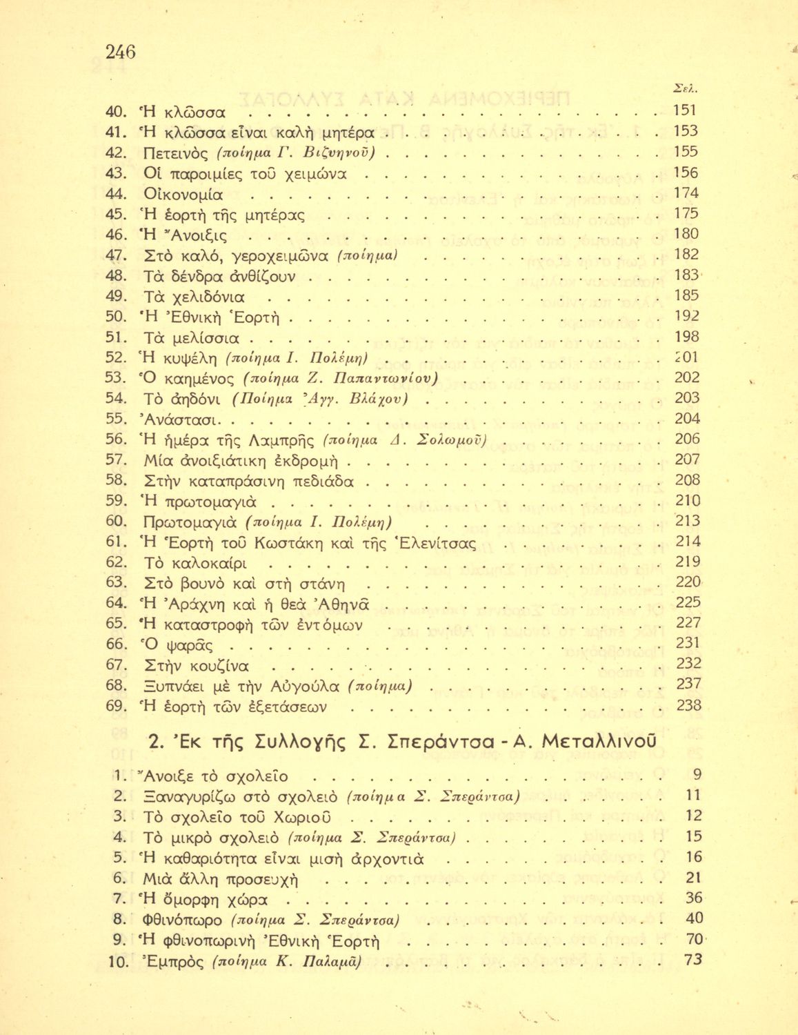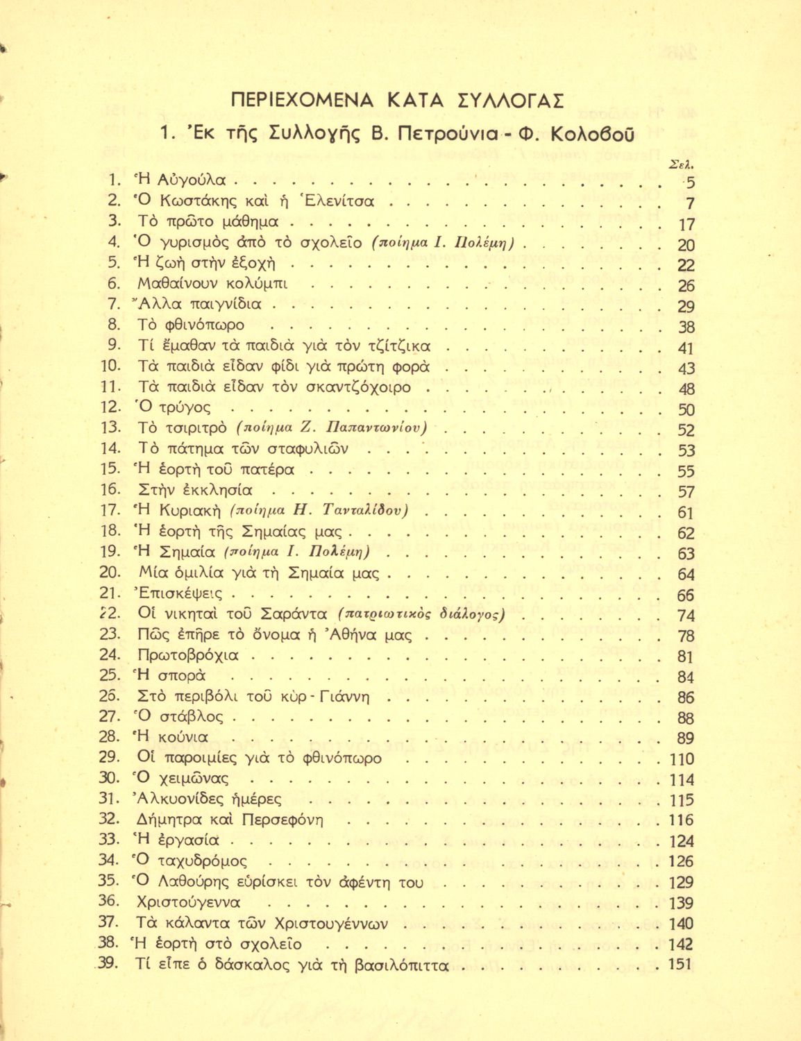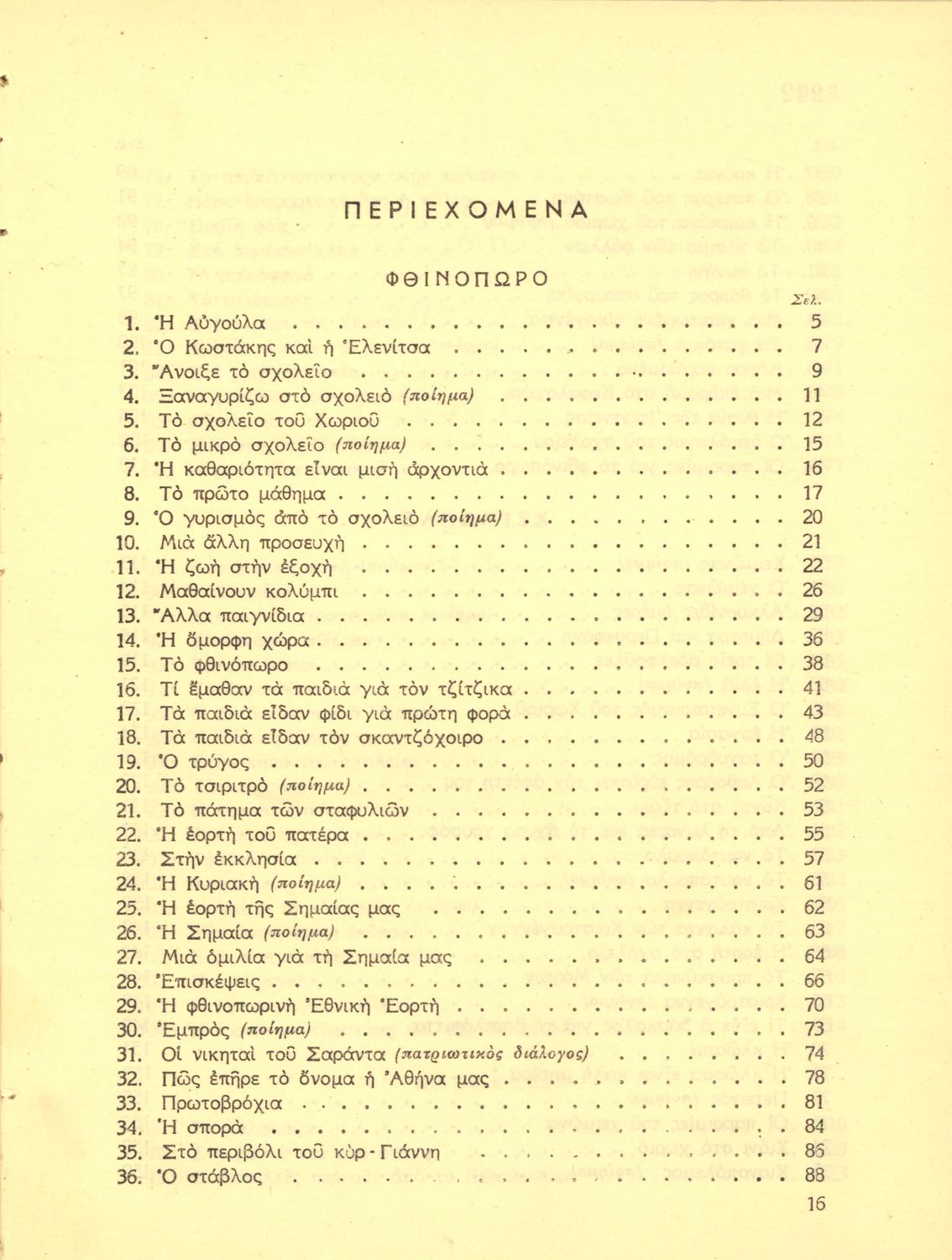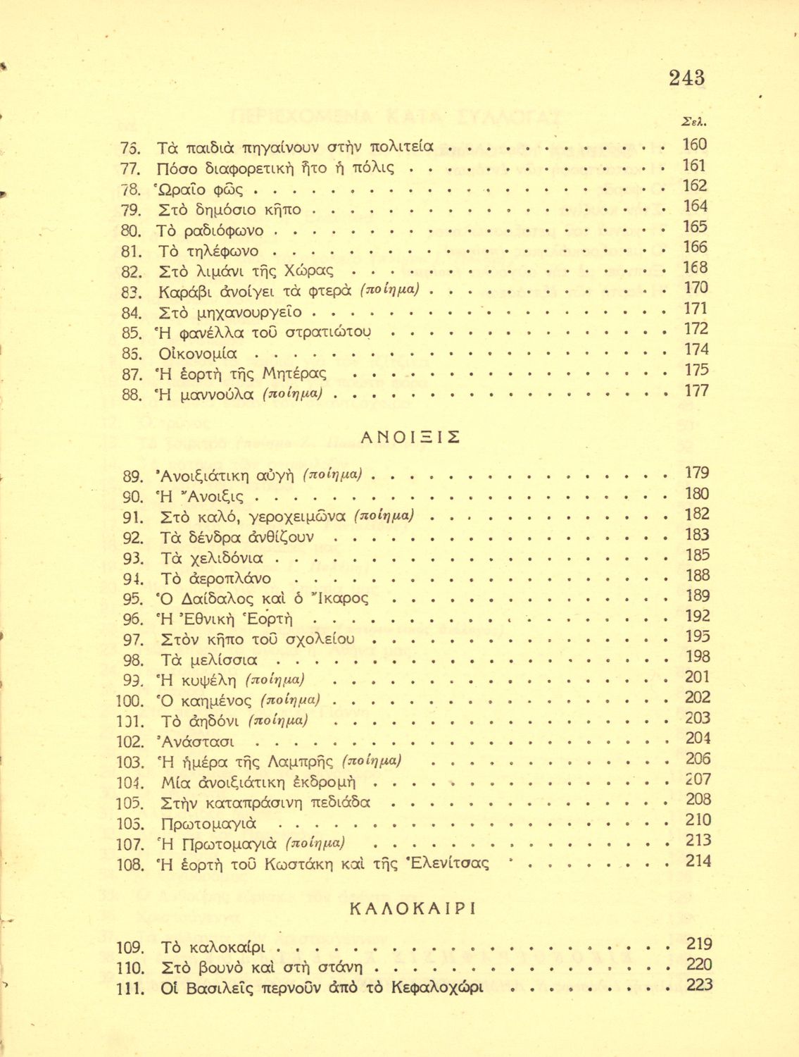 Αναγνωστικό Γ΄ Δημοτικού που περιλαμβάνει ποιήματα και πεζά εμπνευσμένα από την ελληνική φύση, τις ασχολίες των κατοίκων, την σύγχρονη ελληνική ιστορία, την ελληνική μυθολογία και τις θρησκευτικές γιορτές.