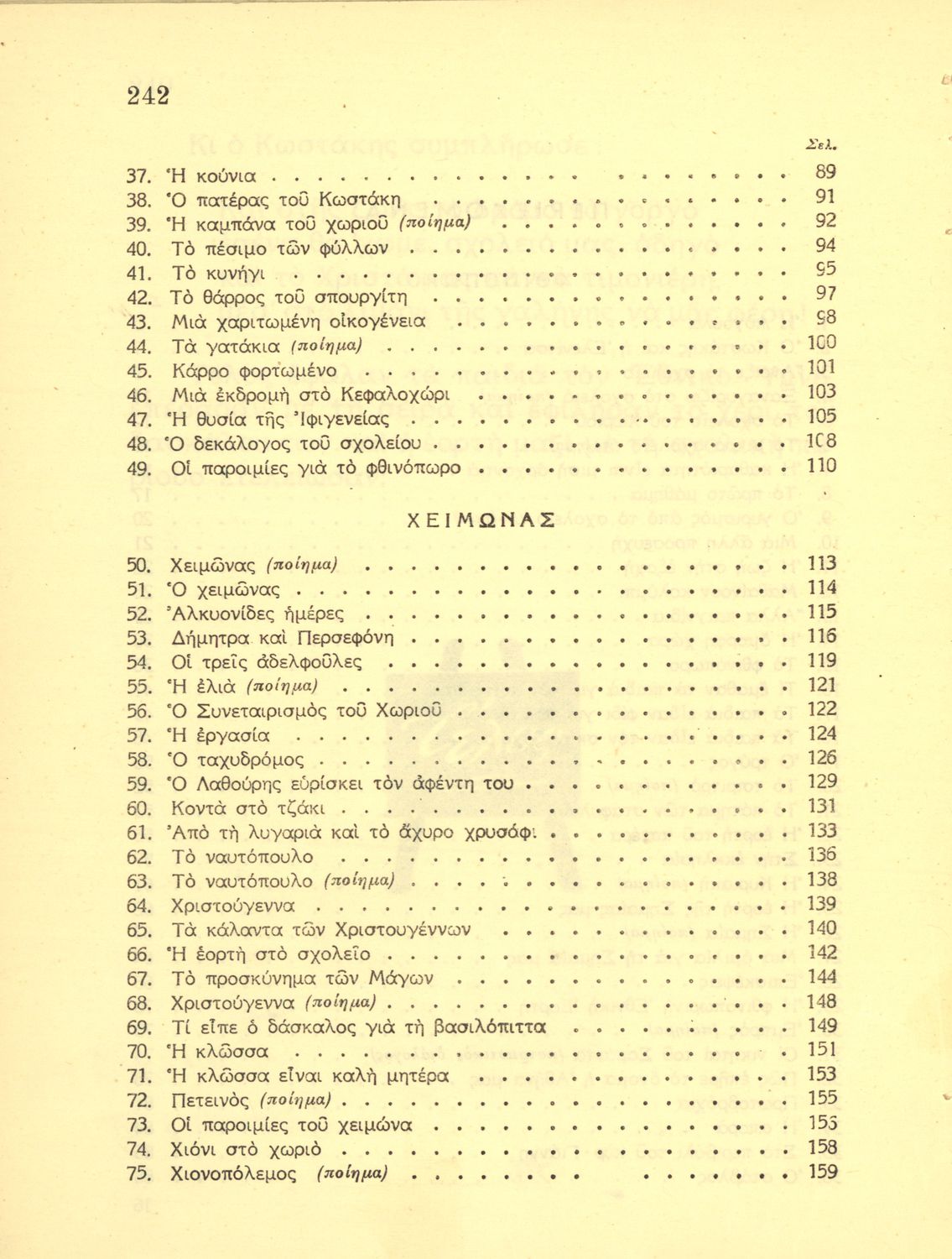 Αναγνωστικό Γ' Δημοτικού που είναι χωρισμένο σύμφωνα με τις εποχές του χρόνου και περιλαμβάνει ποιήματα και πεζά εμπνευσμένα από τη ζωή στην ύπαιθρο, την εθνική, οικογενειακή και κοινωνική ζωή, τη θρησκευτική παράδοση, τις ασχολίες των ανθρώπων, και την ελληνική φύση.
