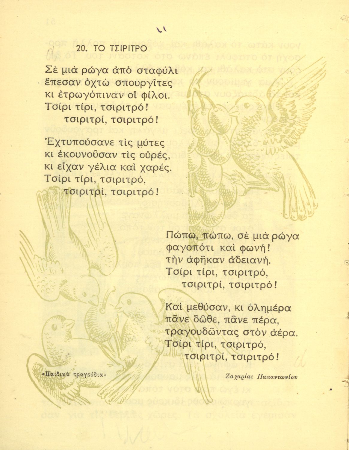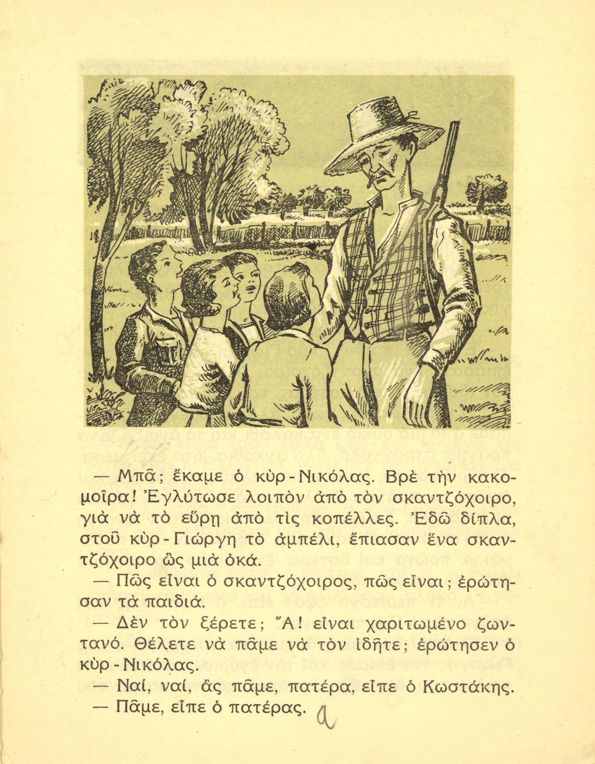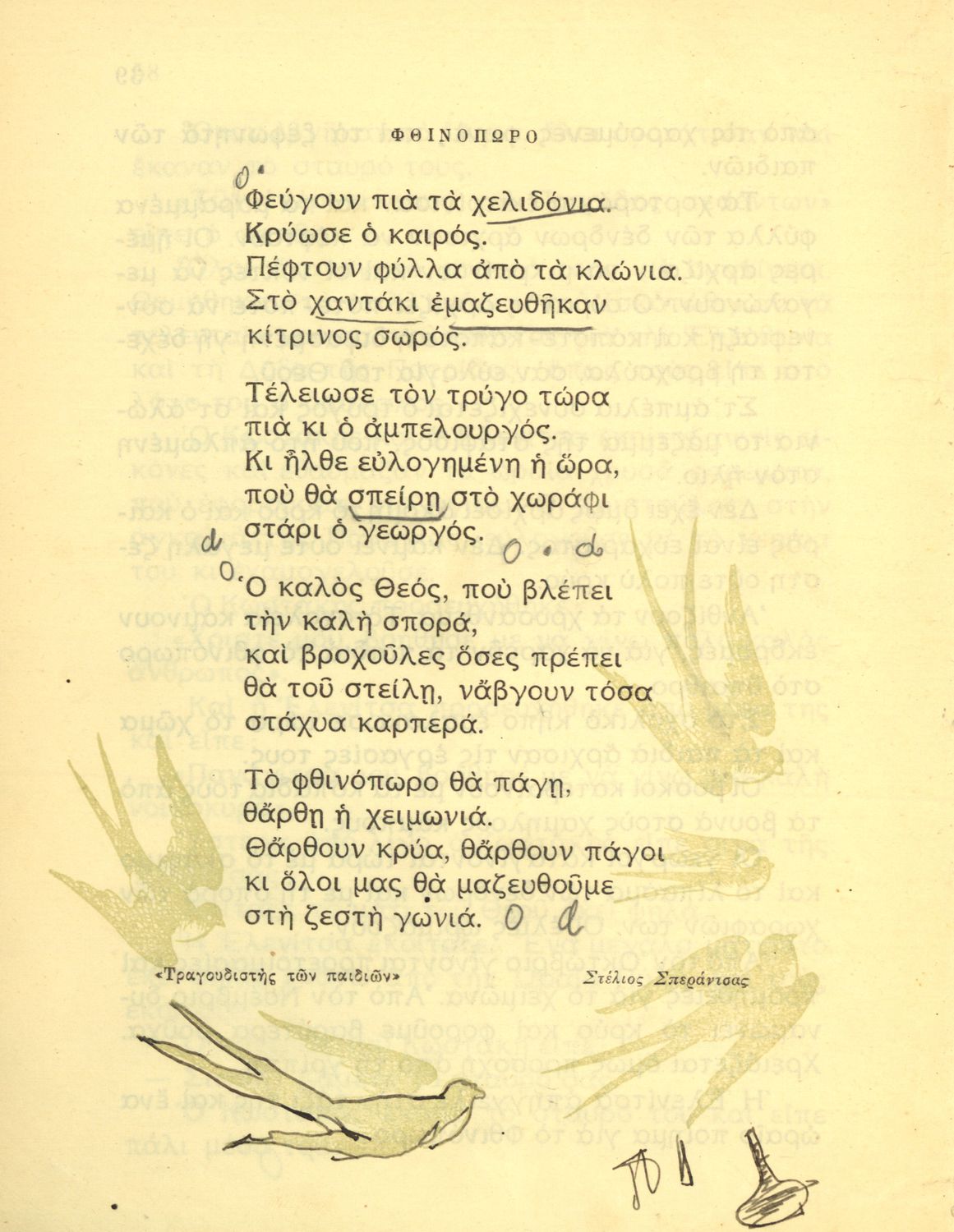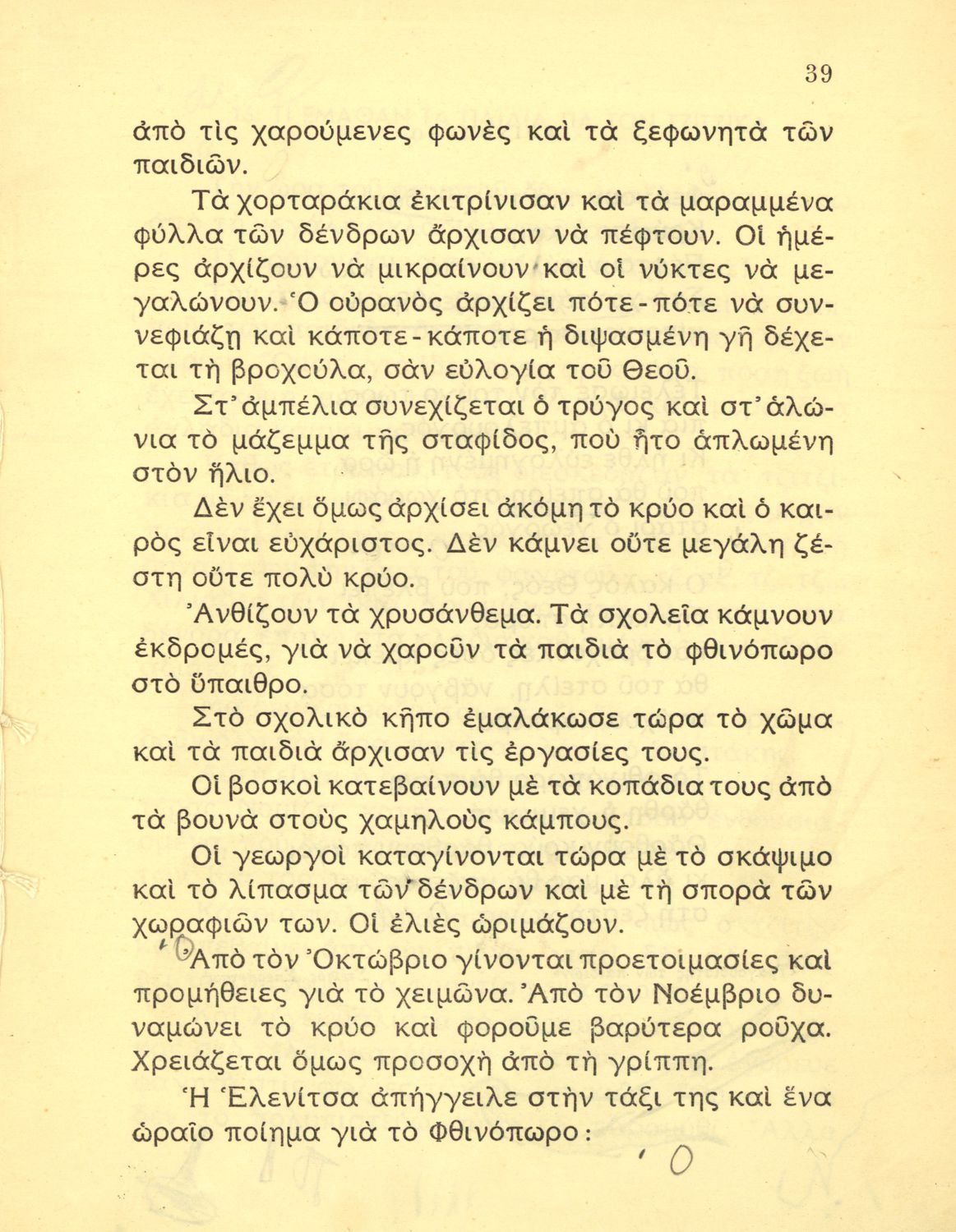 Αναγνωστικό Γ' Δημοτικού που είναι χωρισμένο σύμφωνα με τις εποχές του χρόνου και περιλαμβάνει ποιήματα και πεζά εμπνευσμένα από τη ζωή στην ύπαιθρο, την εθνική, οικογενειακή και κοινωνική ζωή, τη θρησκευτική παράδοση, τις ασχολίες των ανθρώπων, και την ελληνική φύση.