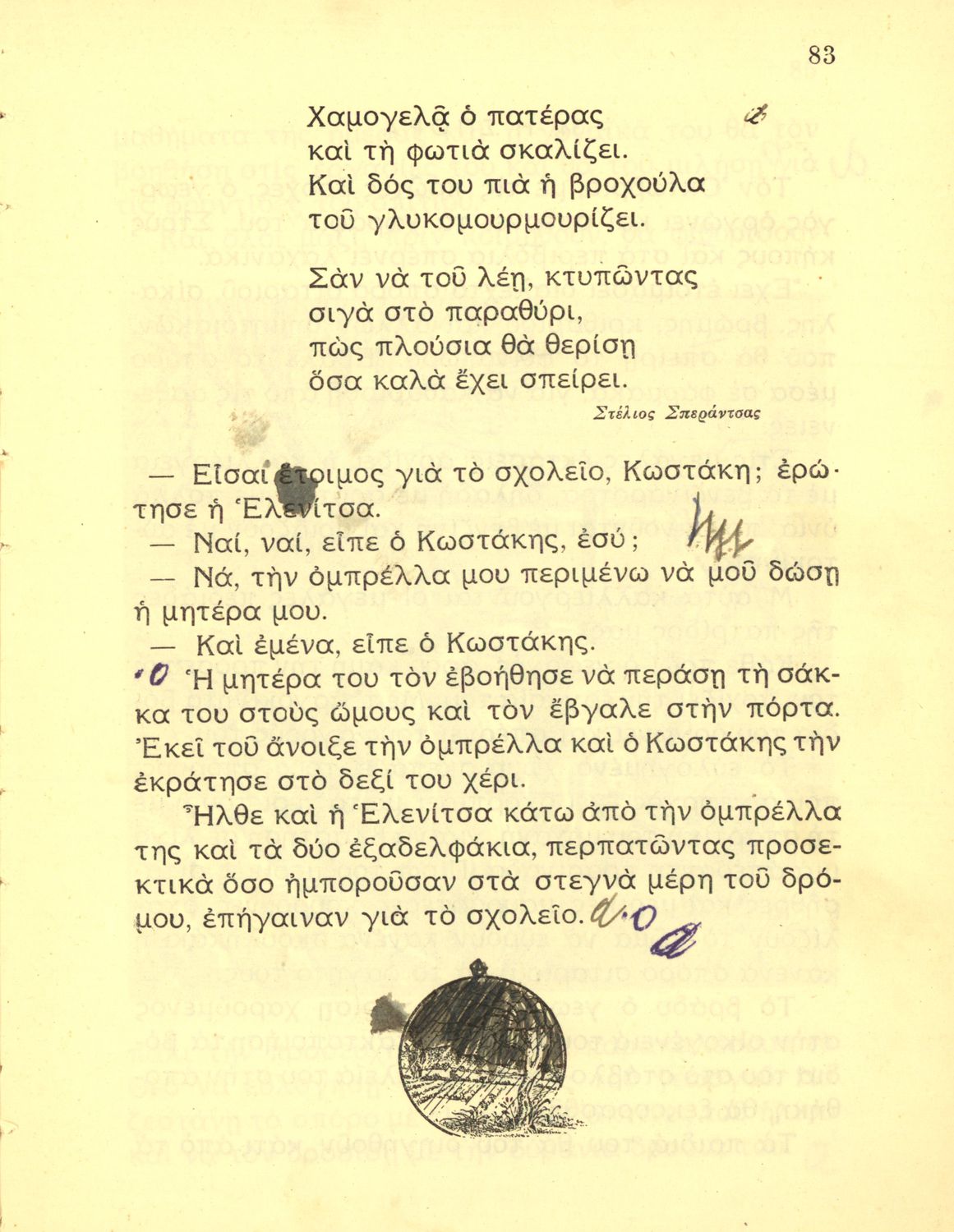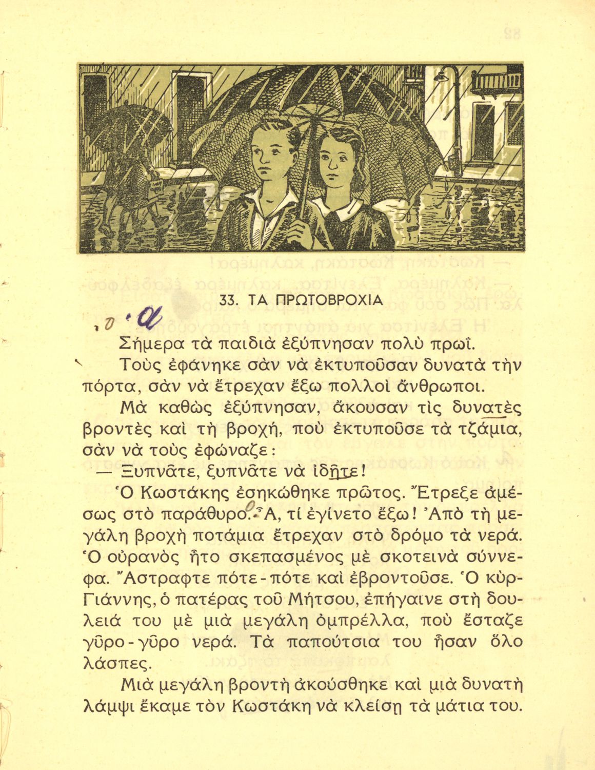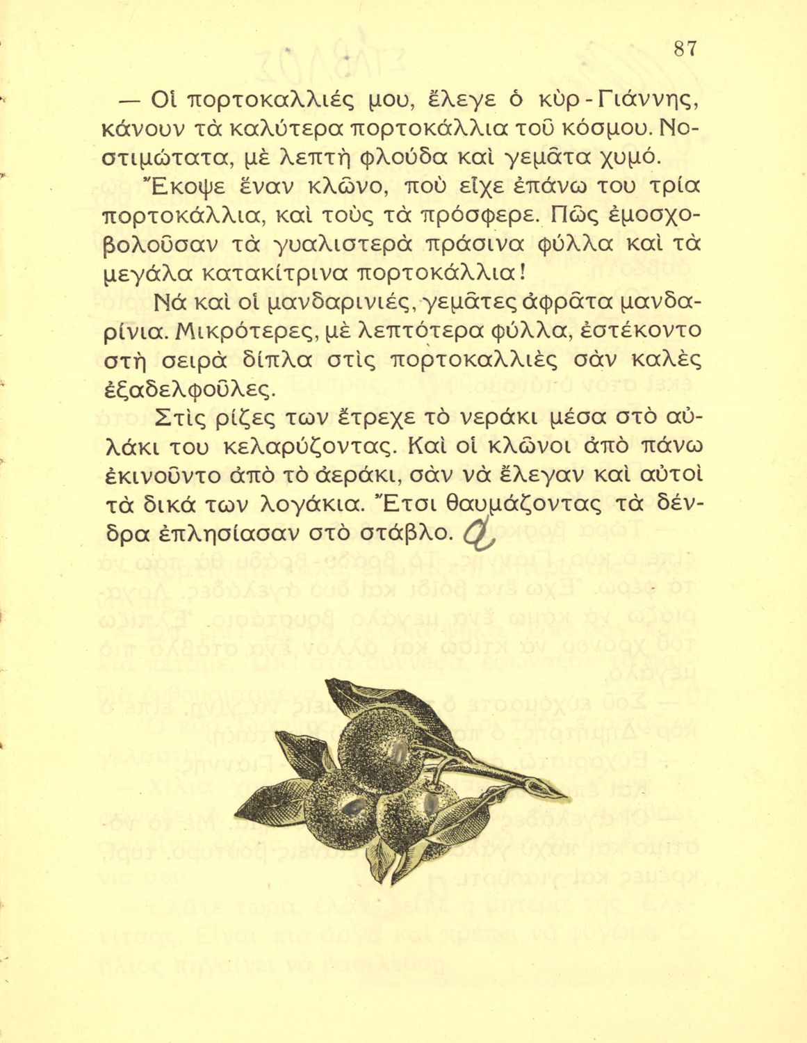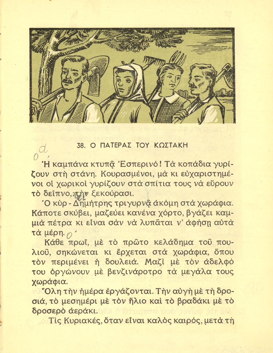 Αναγνωστικό της Γ΄ Δημοτικού που περιλαμβάνει μικρές ιστορίες εθνικιστικού περιεχομένου εμπνευσμένες από την ύπαιθρο, την οικογενειακή και κοινωνική ζωή αλλά και το εθνικό παρελθόν.
