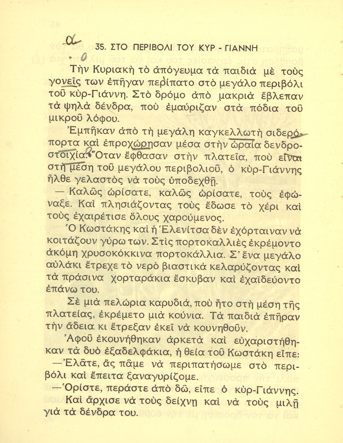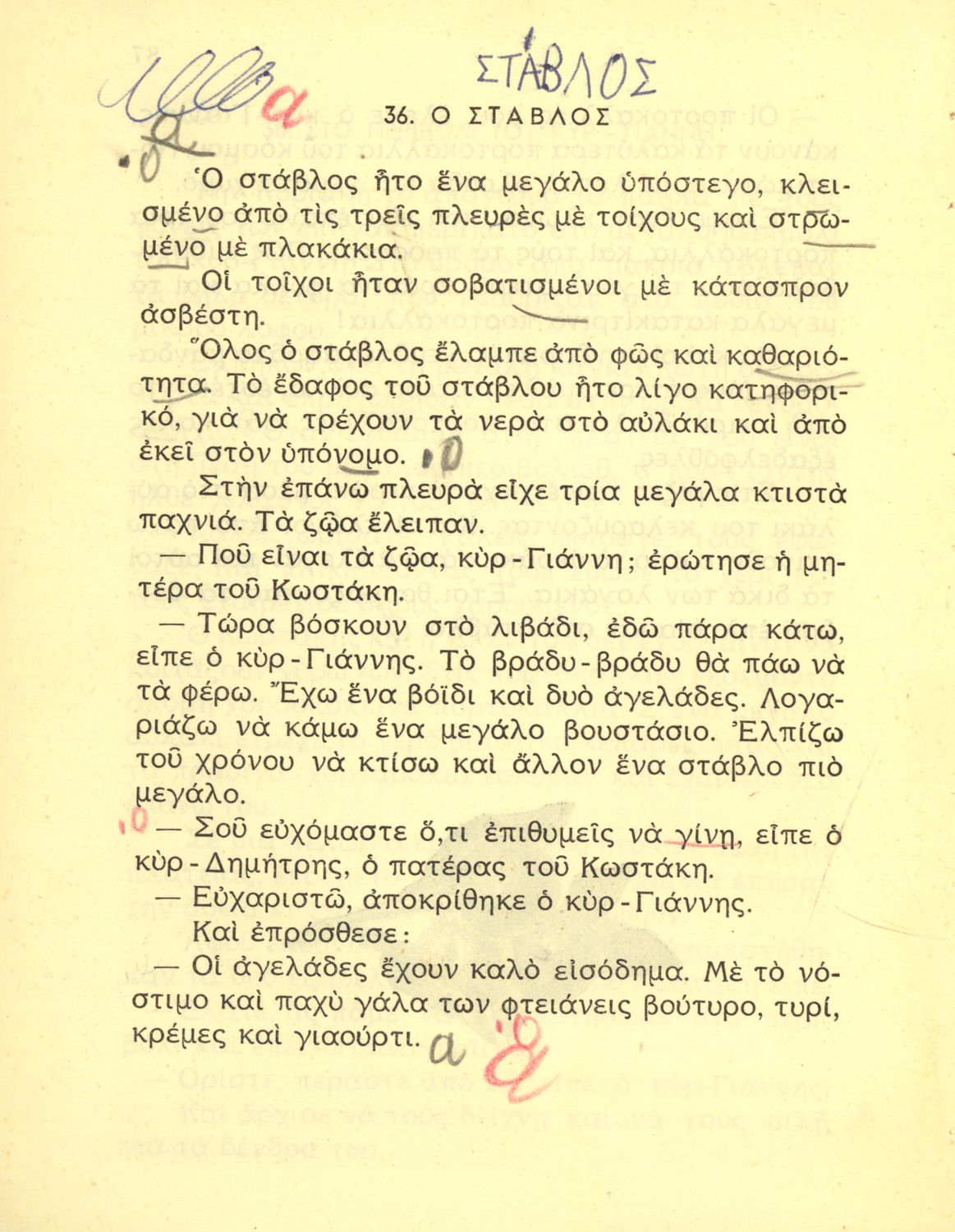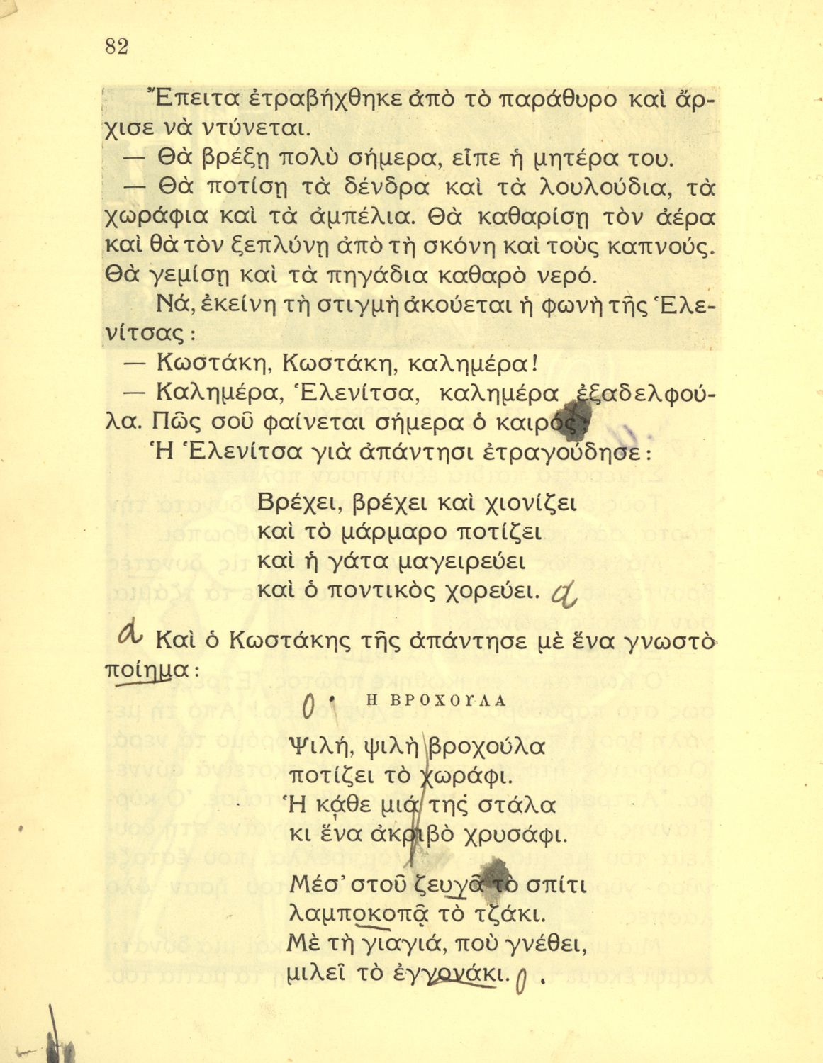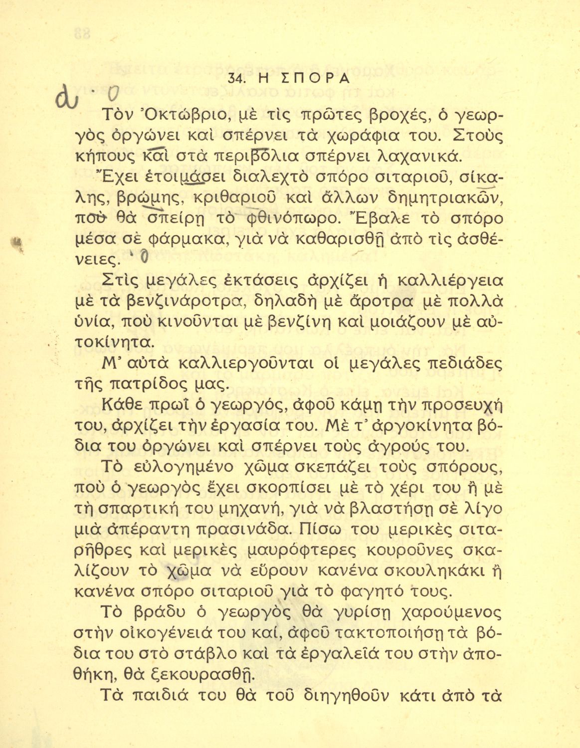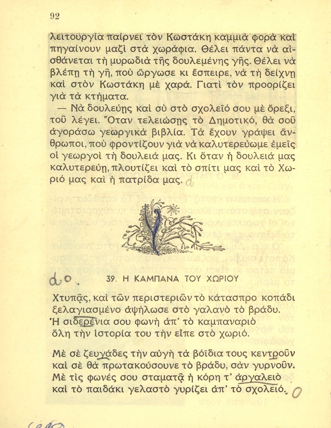 Αναγνωστικό της Γ΄ Δημοτικού που περιλαμβάνει μικρές ιστορίες εθνικιστικού περιεχομένου εμπνευσμένες από την ύπαιθρο, την οικογενειακή και κοινωνική ζωή αλλά και το εθνικό παρελθόν.
