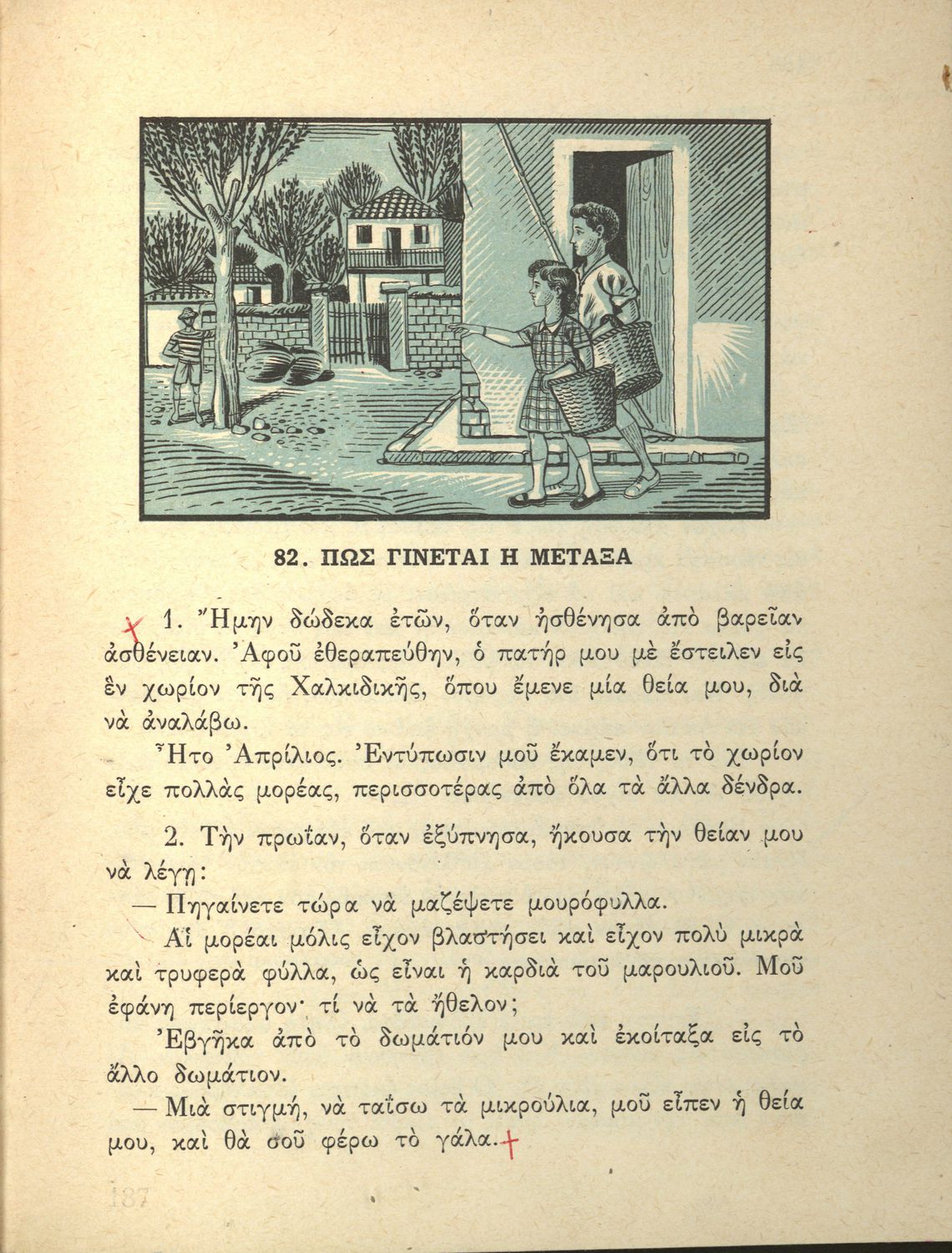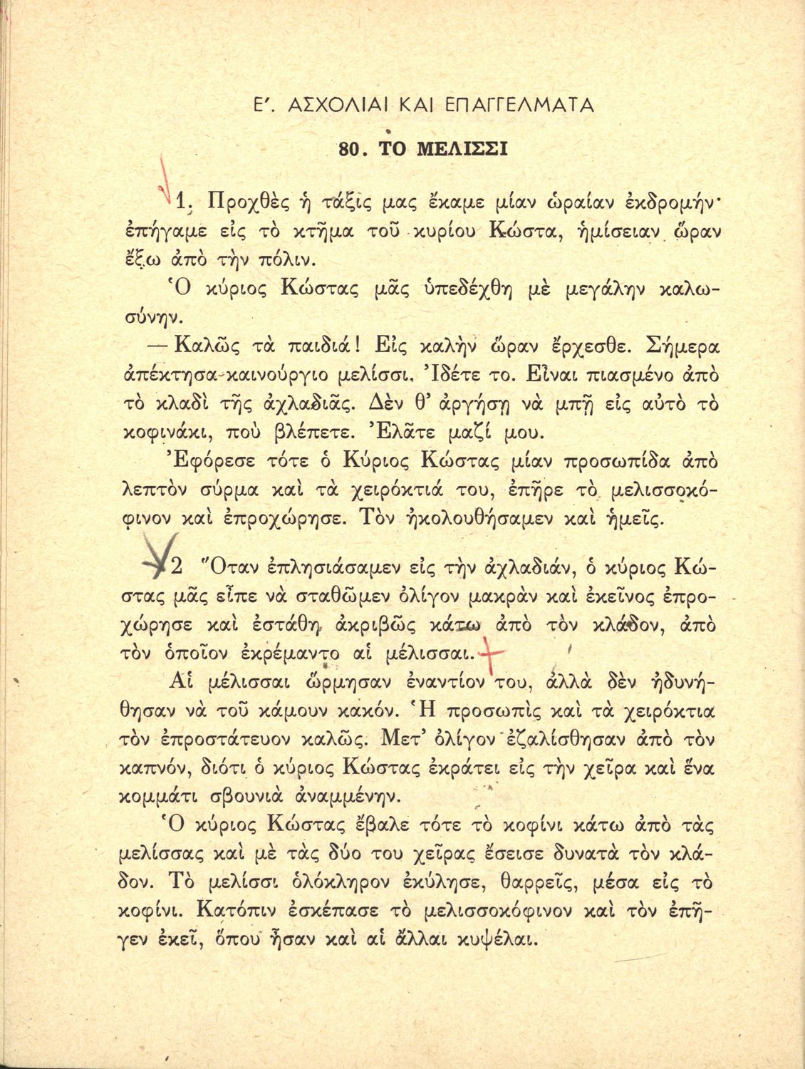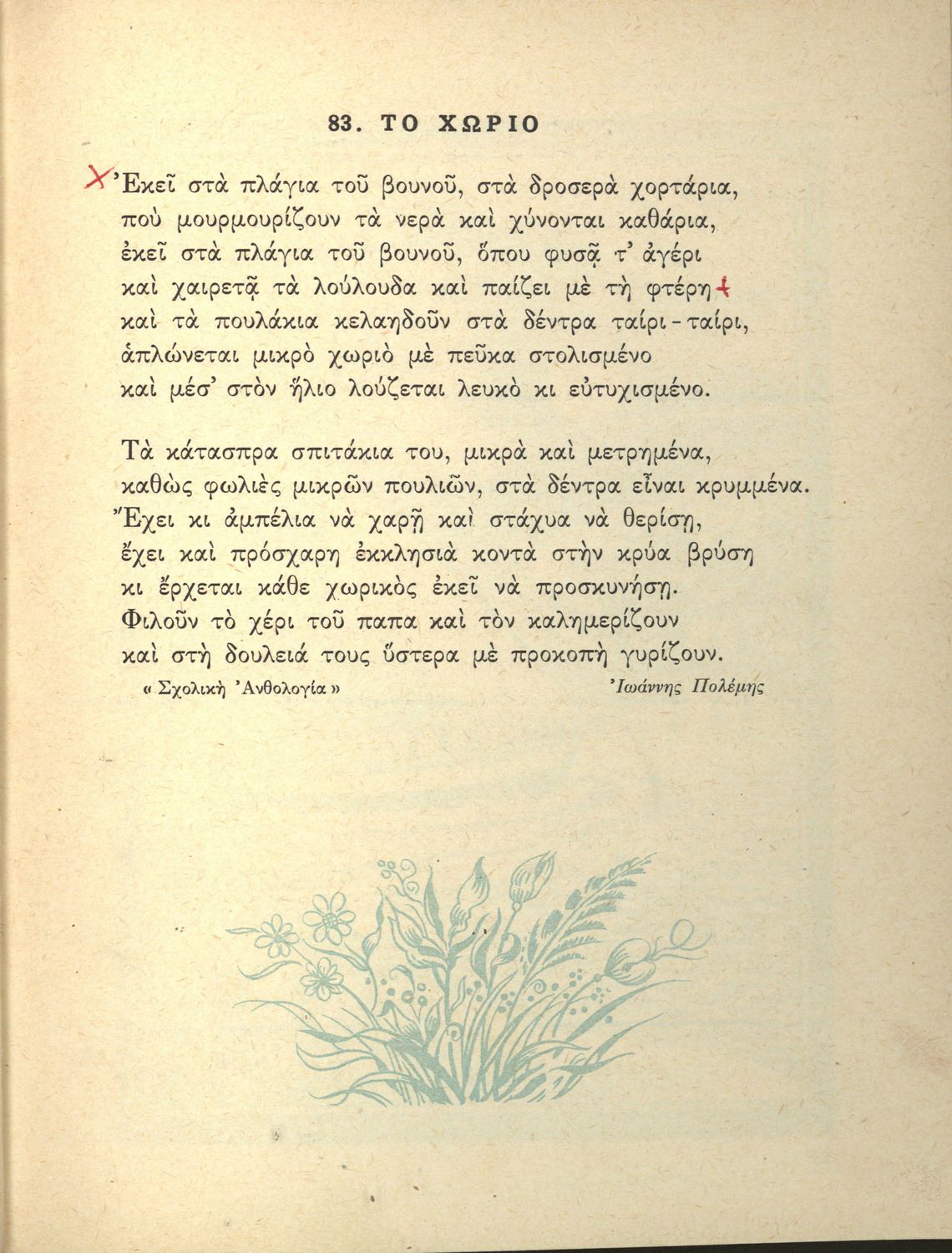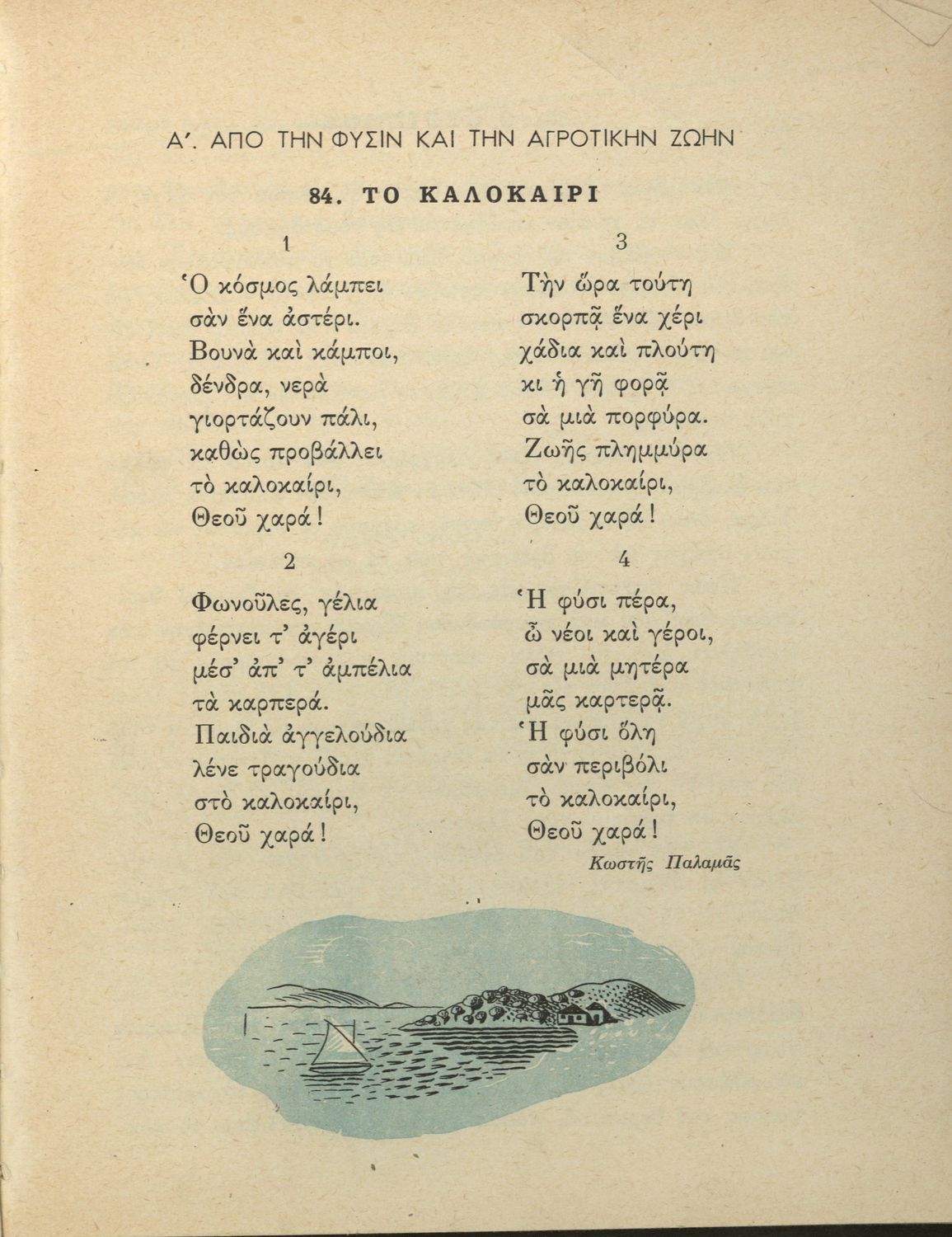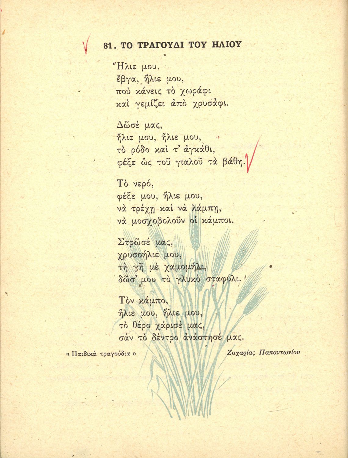 Αναγνωστικό Δ' Δημοτικού που είναι χωρισμένο σύμφωνα με τις εποχές του χρόνου και περιλαμβάνει ποιήματα και πεζά εμπνευσμένα από τη ζωή στην ύπαιθρο, την εθνική, οικογενειακή και κοινωνική ζωή, τη θρησκευτική παράδοση, τις ασχολίες των ανθρώπων, και την ελληνική φύση, ιστορία και μυθολογία.