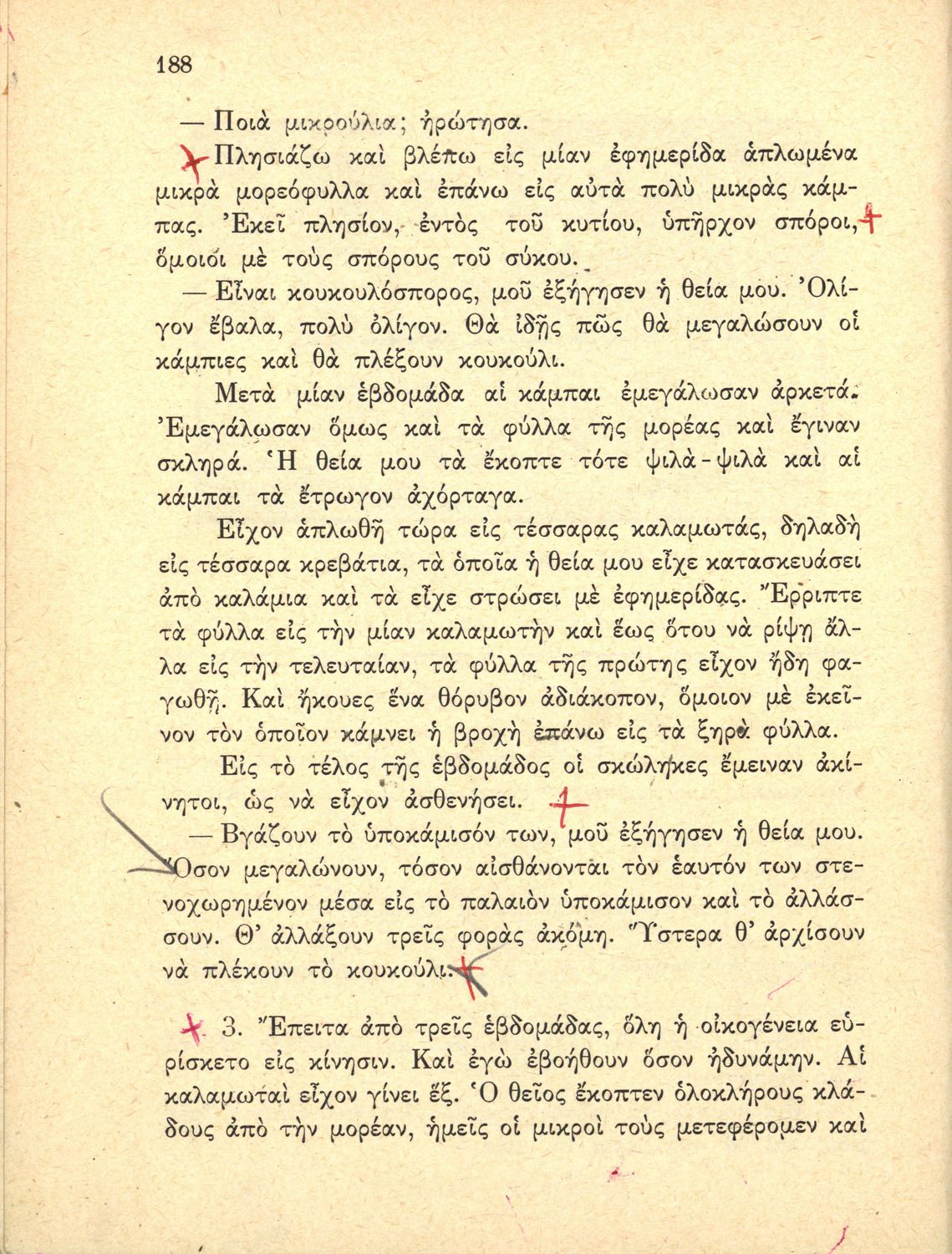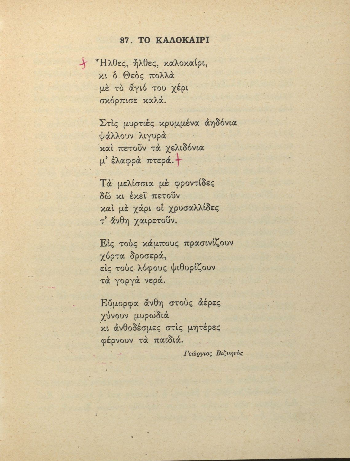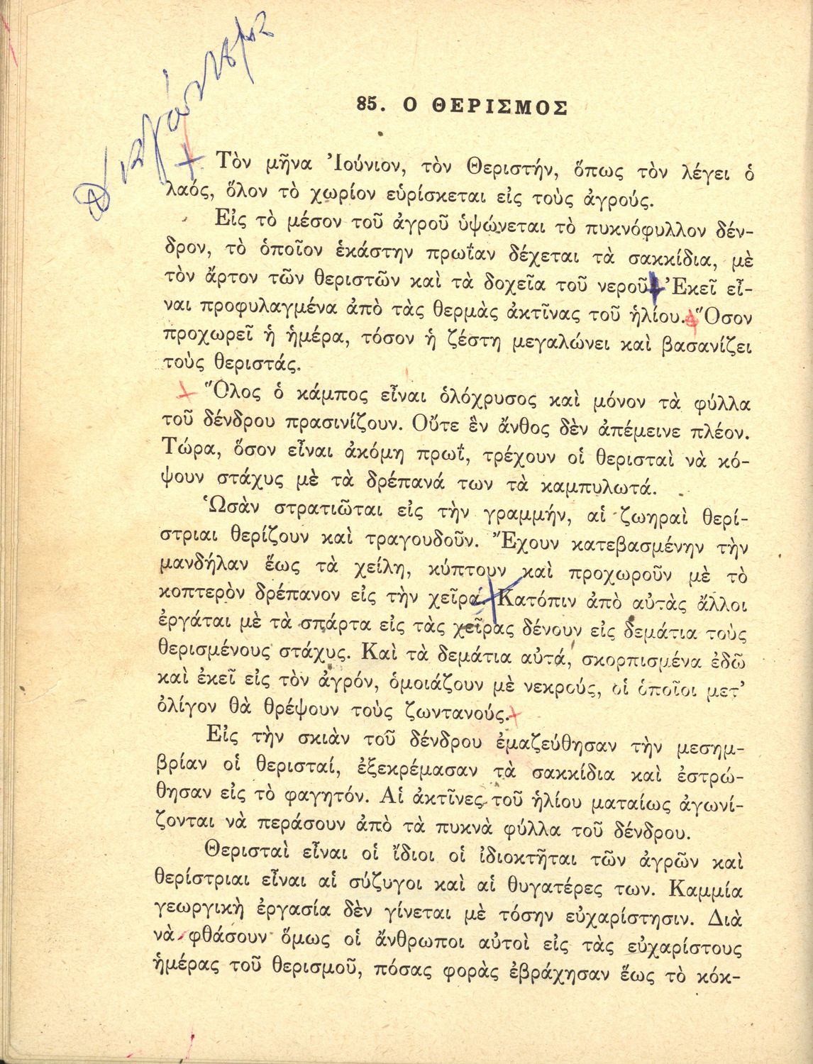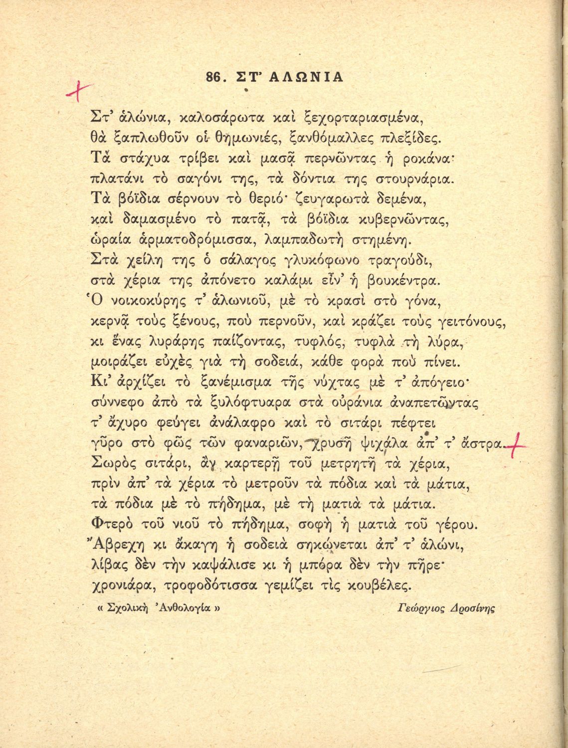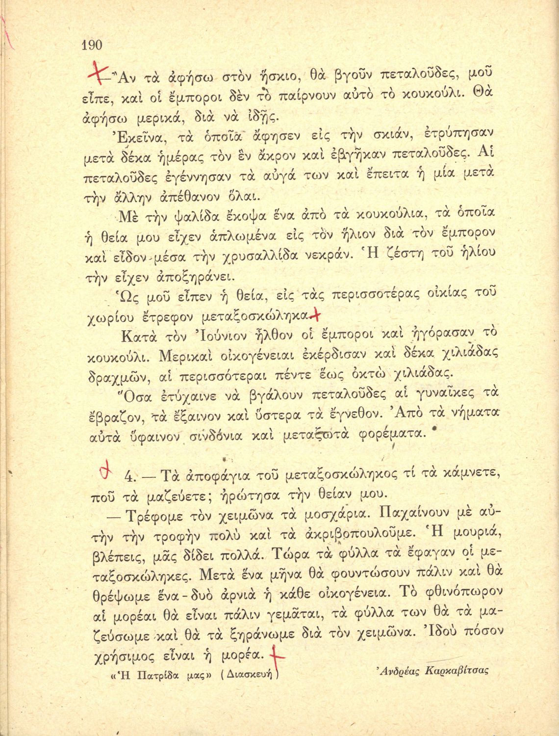 Αναγνωστικό Δ' Δημοτικού που είναι χωρισμένο σύμφωνα με τις εποχές του χρόνου και περιλαμβάνει ποιήματα και πεζά εμπνευσμένα από τη ζωή στην ύπαιθρο, την εθνική, οικογενειακή και κοινωνική ζωή, τη θρησκευτική παράδοση, τις ασχολίες των ανθρώπων, και την ελληνική φύση, ιστορία και μυθολογία.