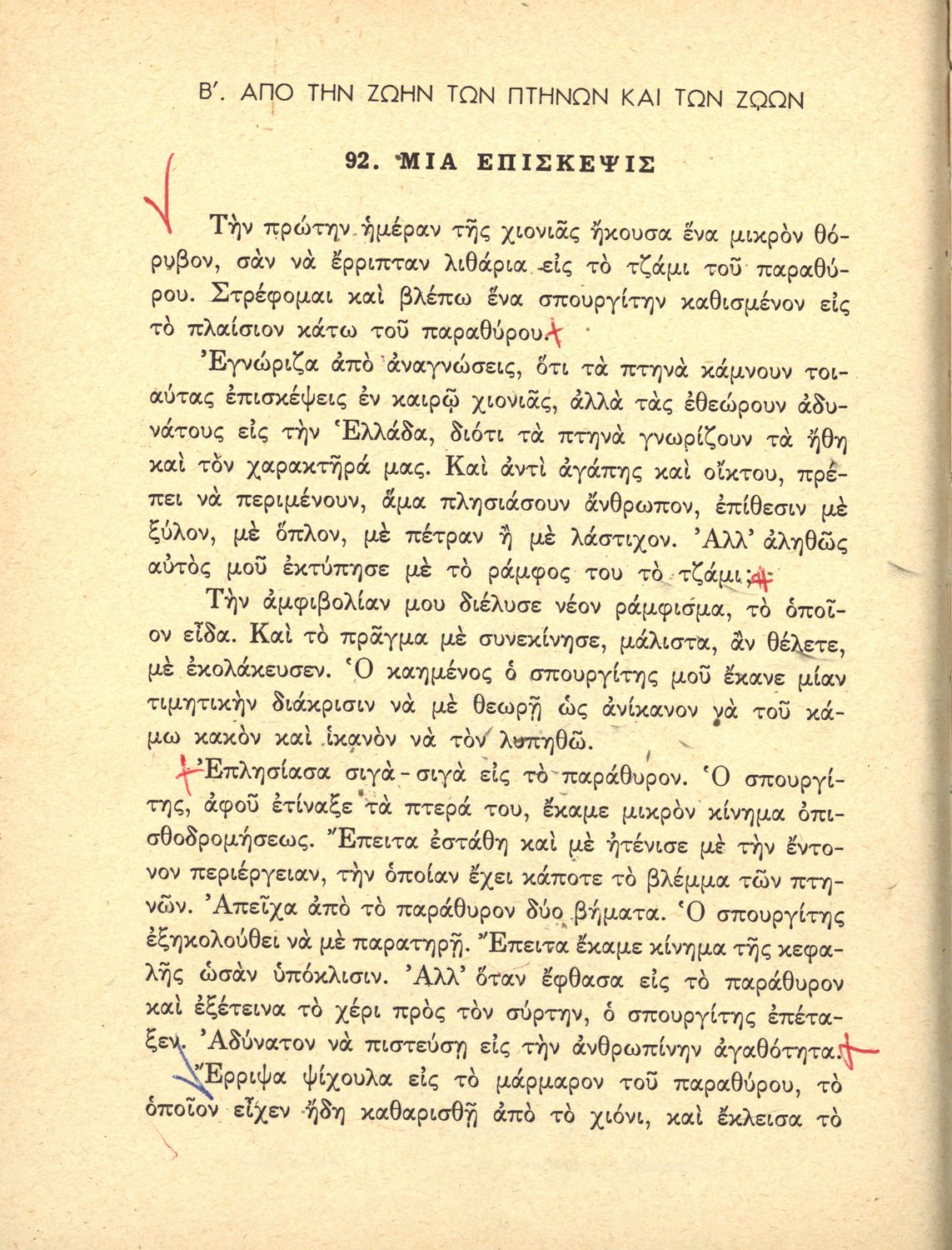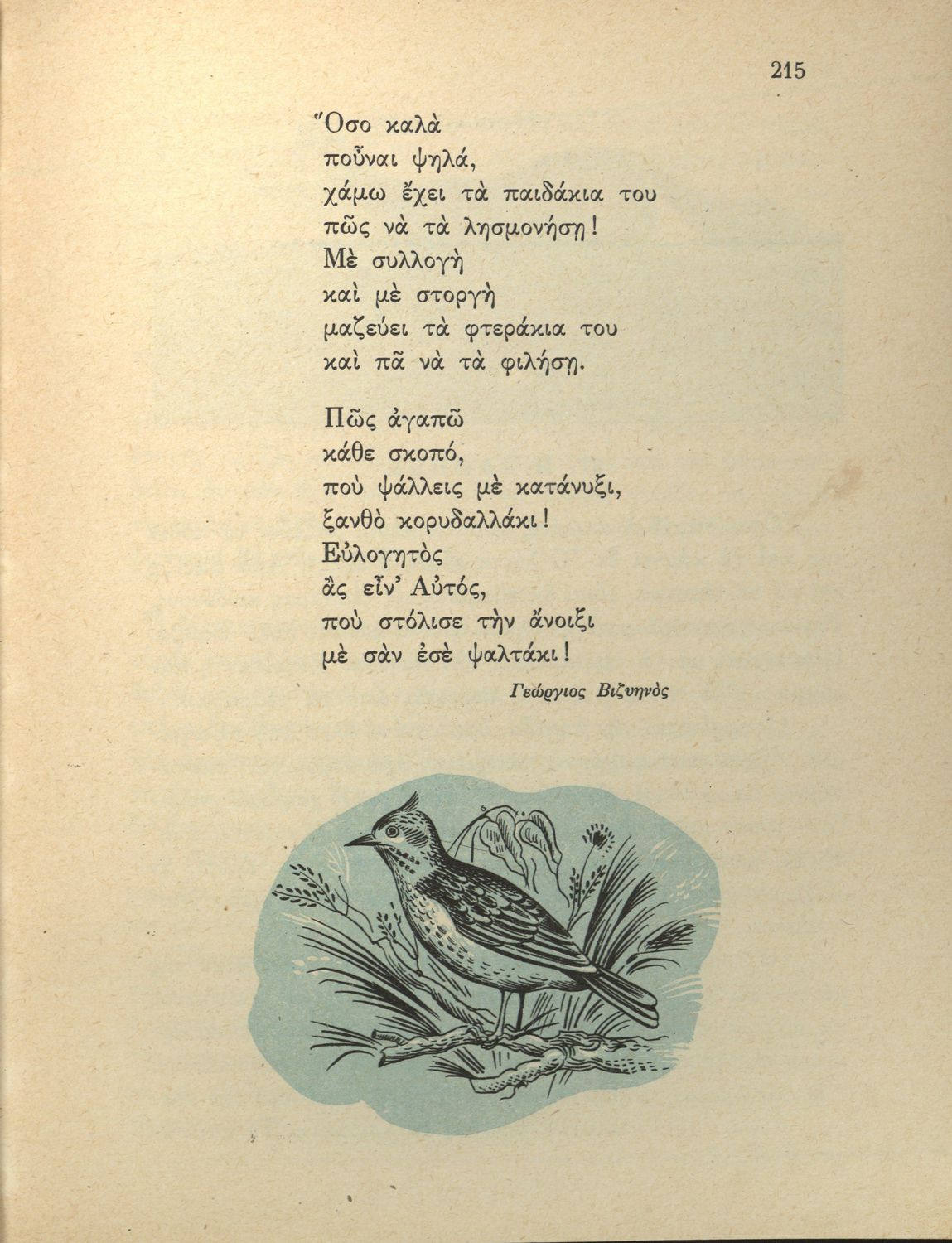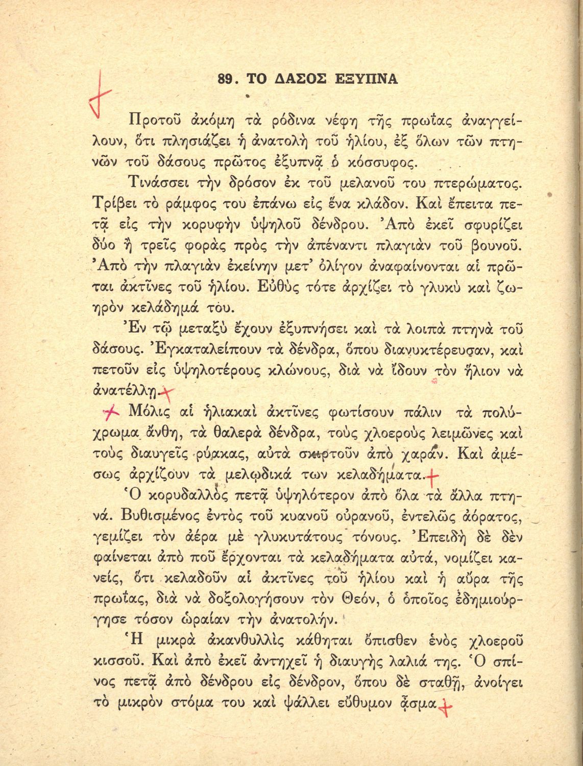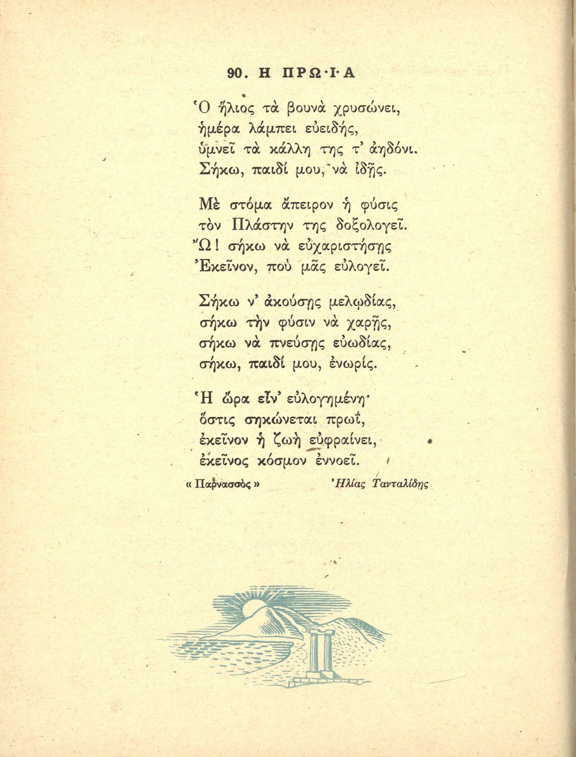 Αναγνωστικό Δ' Δημοτικού που είναι χωρισμένο σύμφωνα με τις εποχές του χρόνου και περιλαμβάνει ποιήματα και πεζά εμπνευσμένα από τη ζωή στην ύπαιθρο, την εθνική, οικογενειακή και κοινωνική ζωή, τη θρησκευτική παράδοση, τις ασχολίες των ανθρώπων, και την ελληνική φύση, ιστορία και μυθολογία.