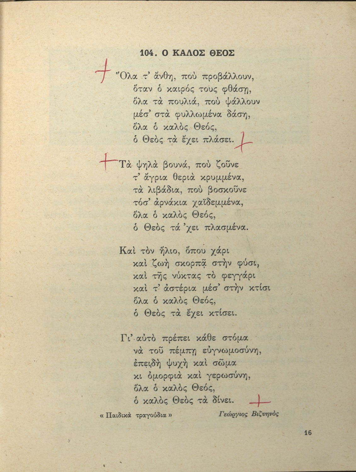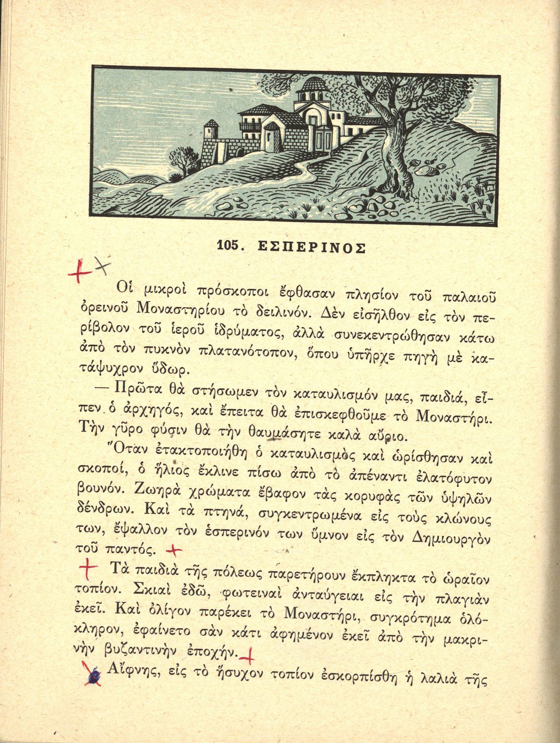 Αναγνωστικό Δ' Δημοτικού που είναι χωρισμένο σύμφωνα με τις εποχές του χρόνου και περιλαμβάνει ποιήματα και πεζά εμπνευσμένα από τη ζωή στην ύπαιθρο, την εθνική, οικογενειακή και κοινωνική ζωή, τη θρησκευτική παράδοση, τις ασχολίες των ανθρώπων, και την ελληνική φύση, ιστορία και μυθολογία.